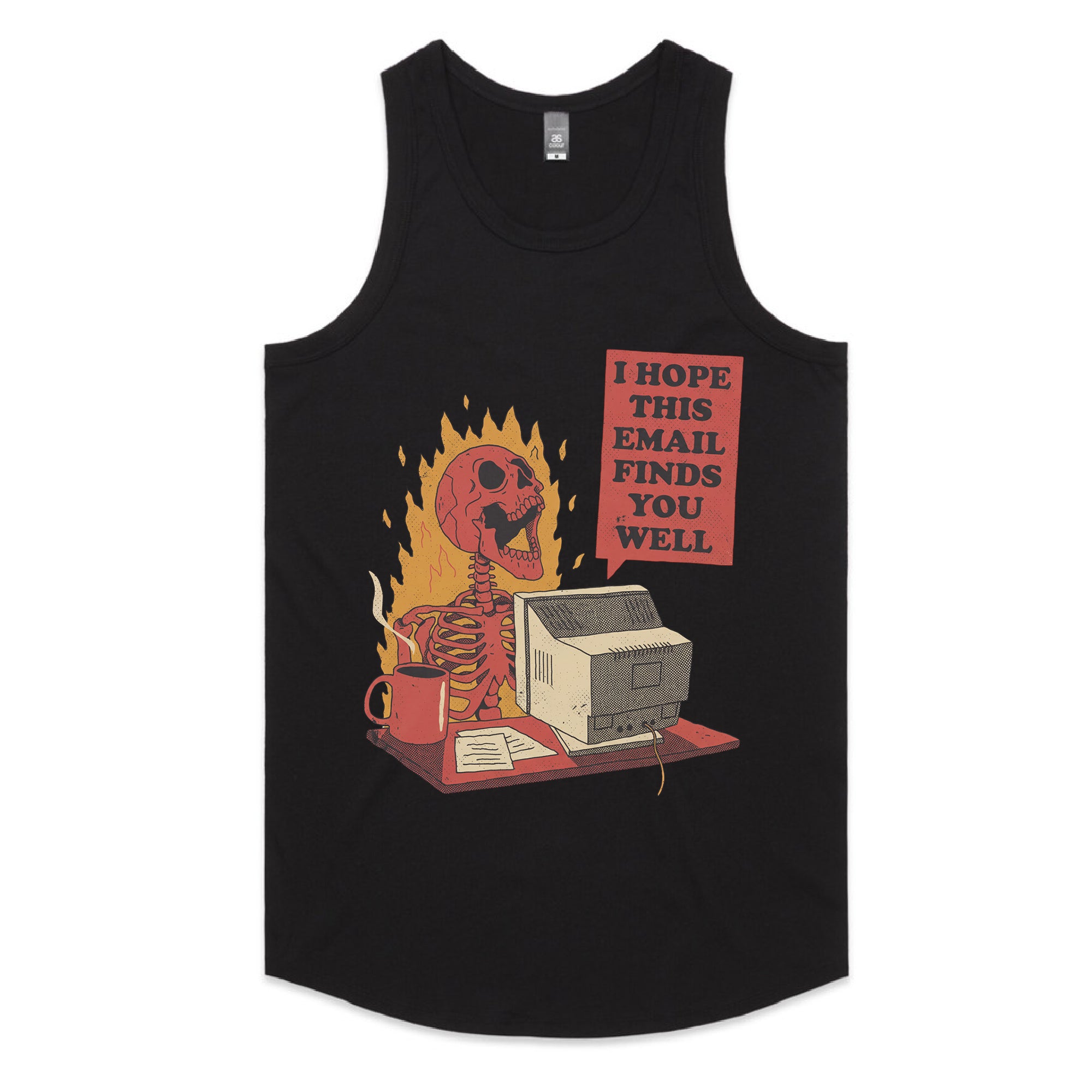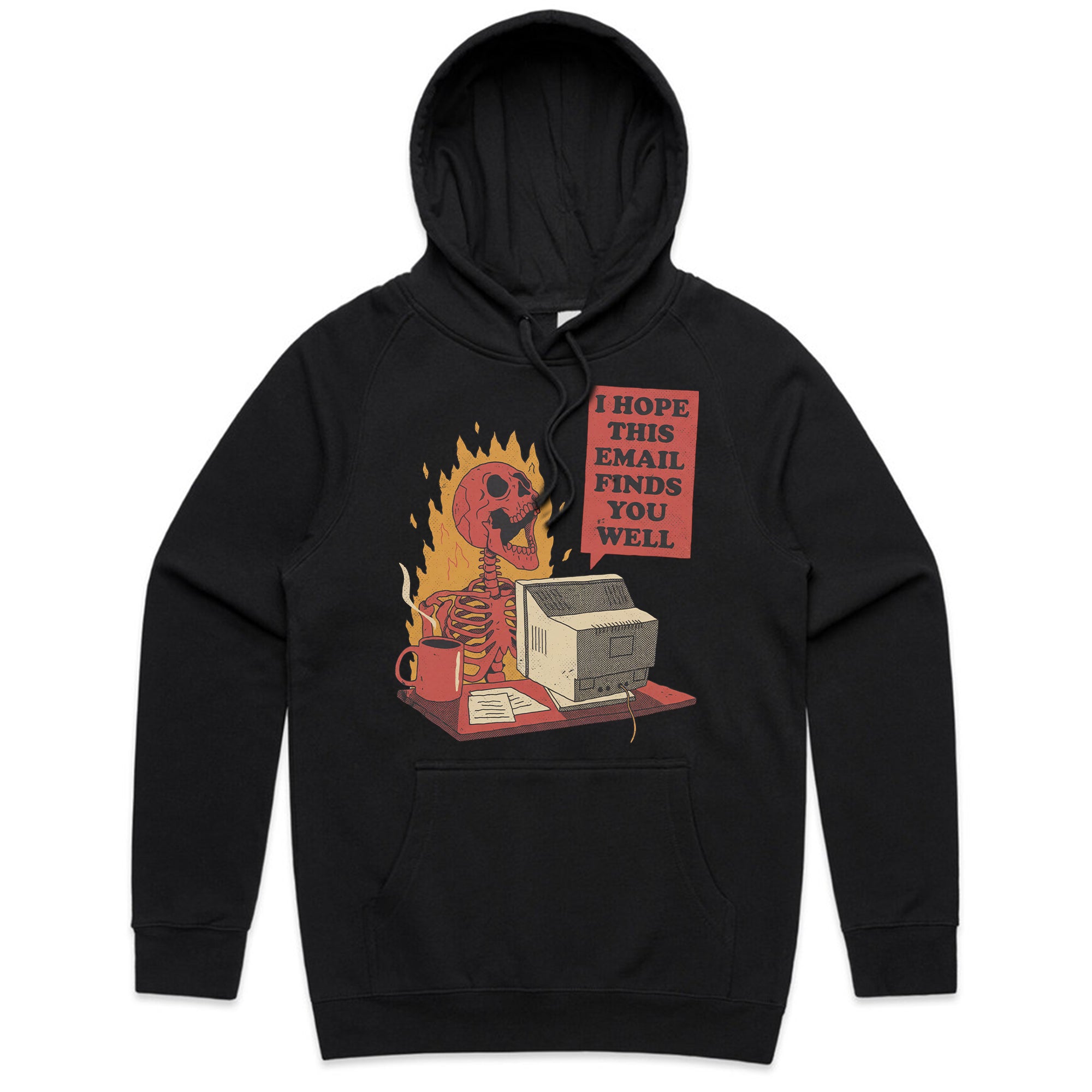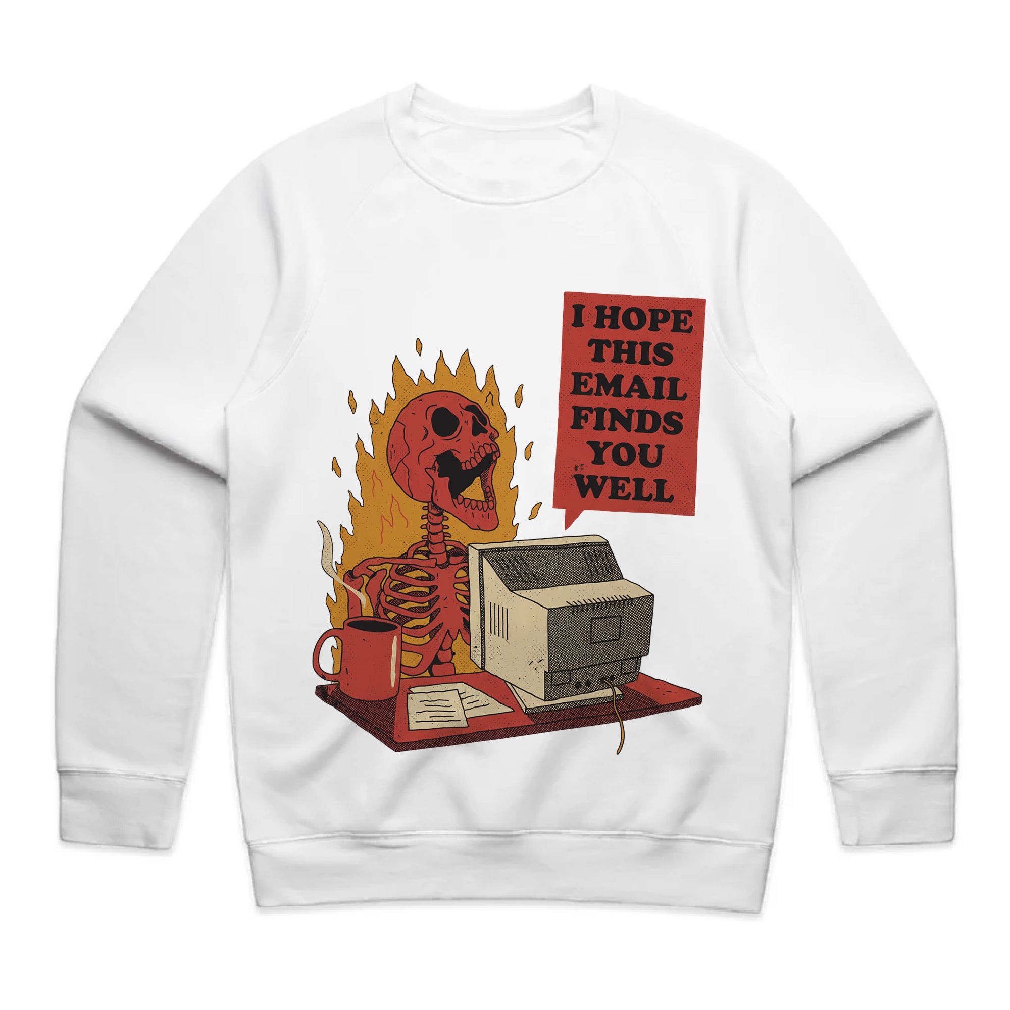 A hilarious take on workplace burnout — this design shows a skeleton typing at a flaming desk with the sarcastic message, “I hope this email finds you well.” Ideal for anyone who’s ever smiled through corporate chaos.
