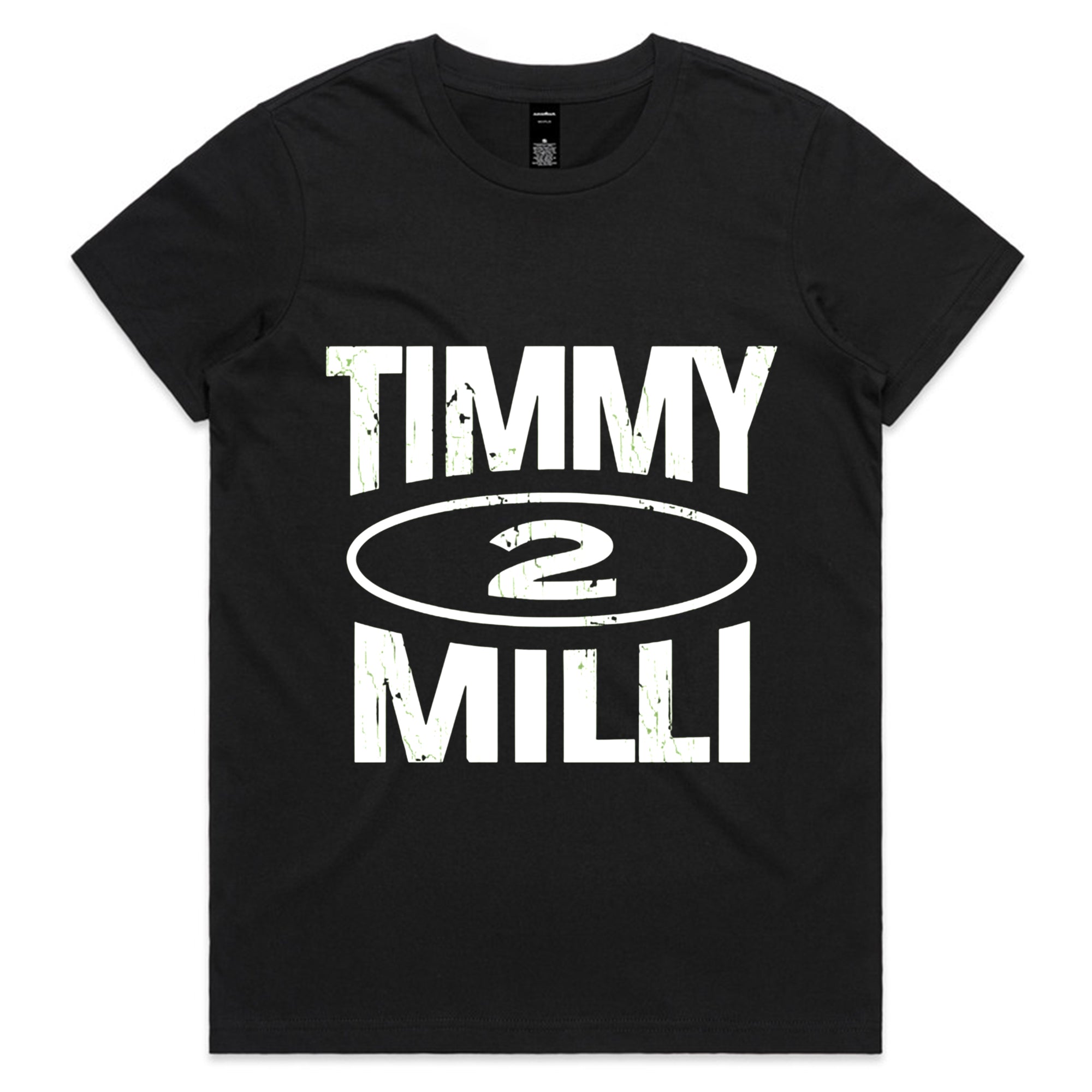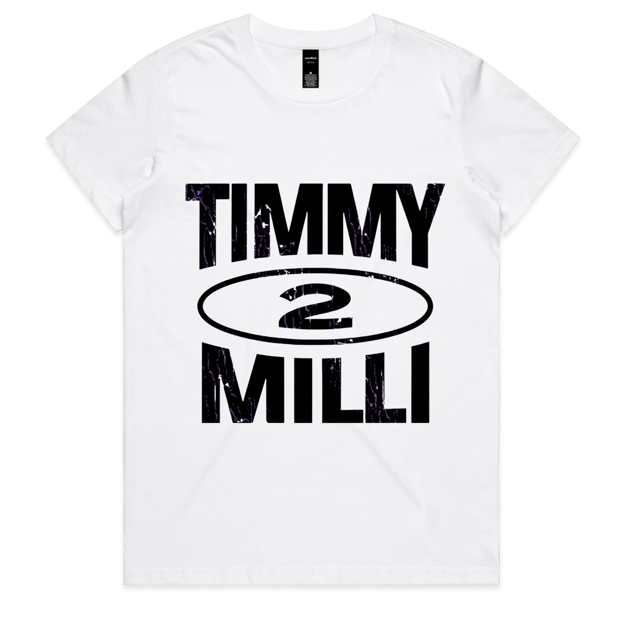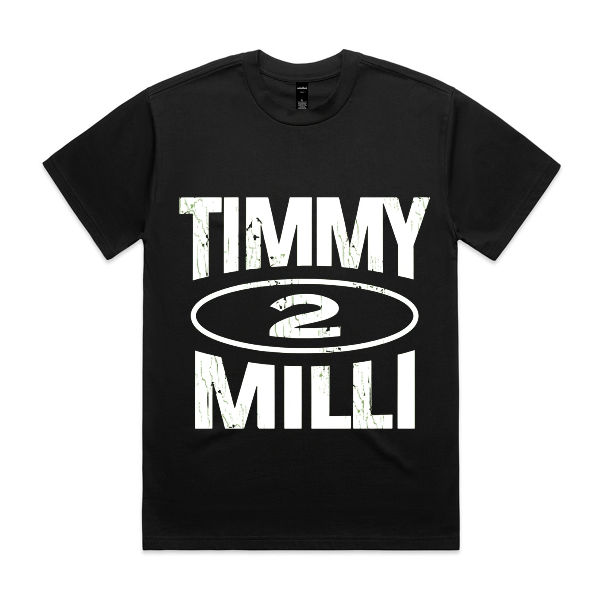 A clean, streetwear-inspired graphic featuring the name "TIMMY" stacked above "MILLI" in a heavy, distressed black font. A stylized oval containing the number "2" sits in the center of the text.