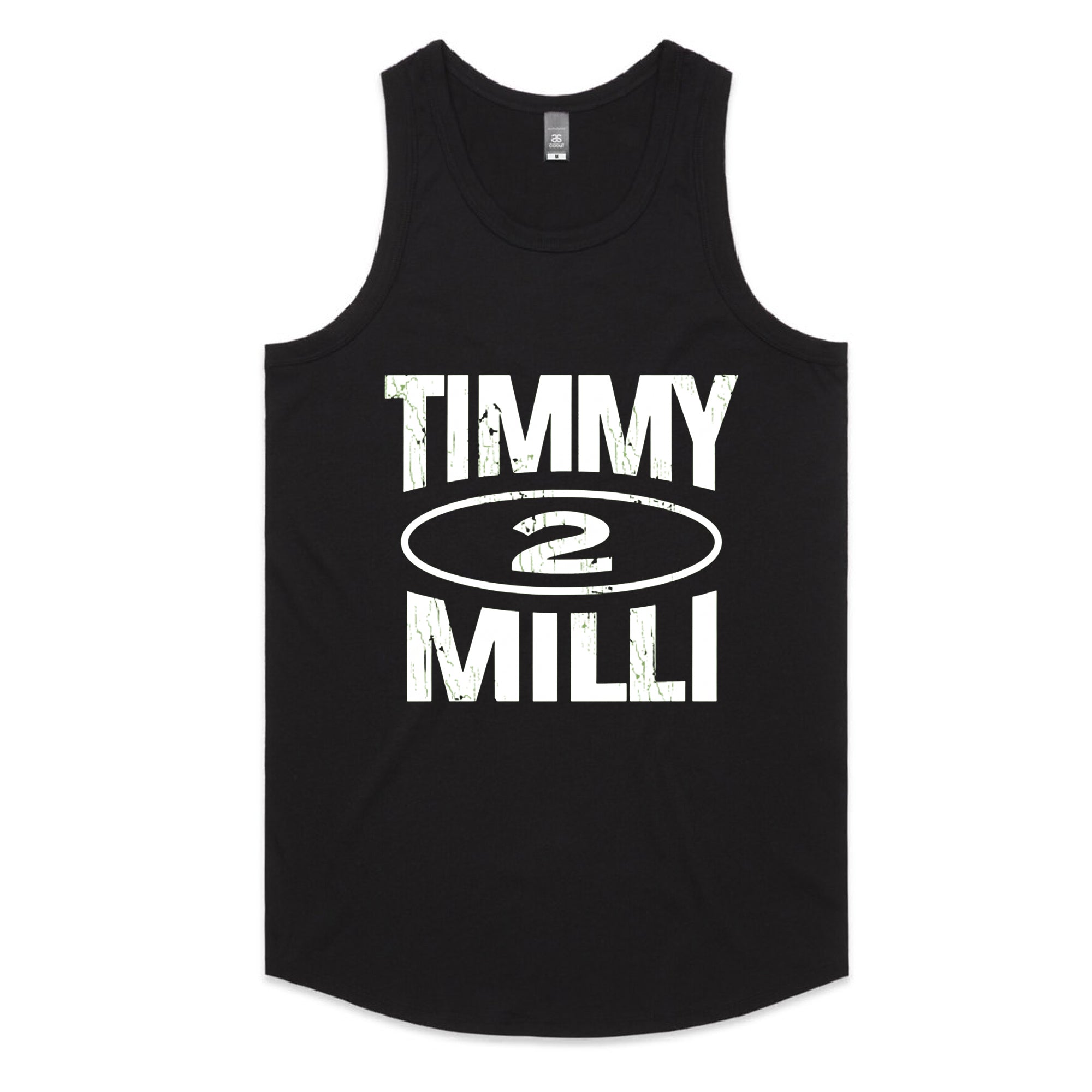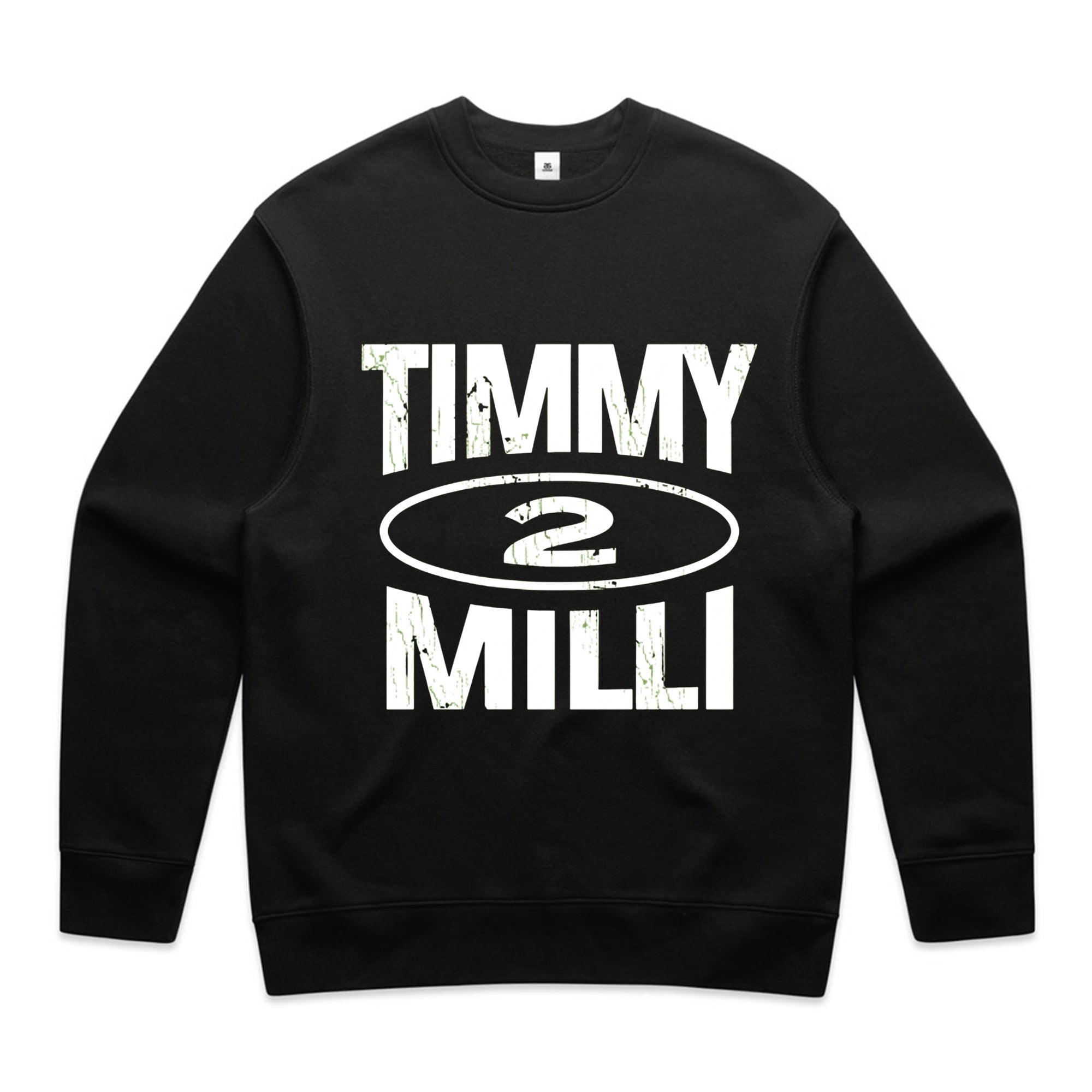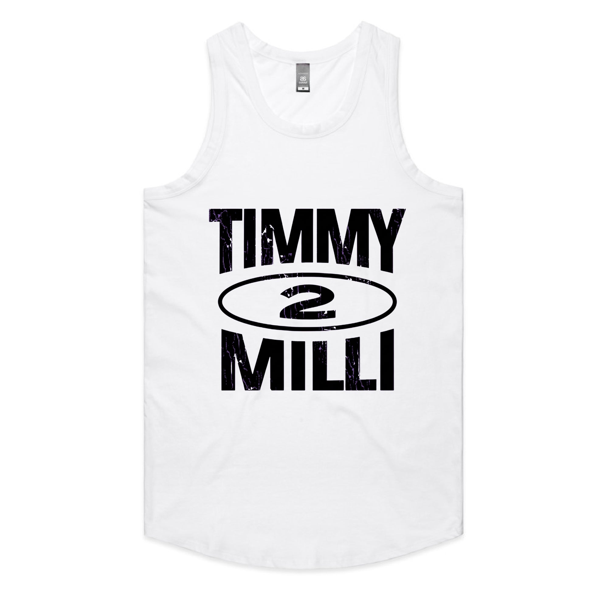 A clean, streetwear-inspired graphic featuring the name "TIMMY" stacked above "MILLI" in a heavy, distressed black font. A stylized oval containing the number "2" sits in the center of the text.