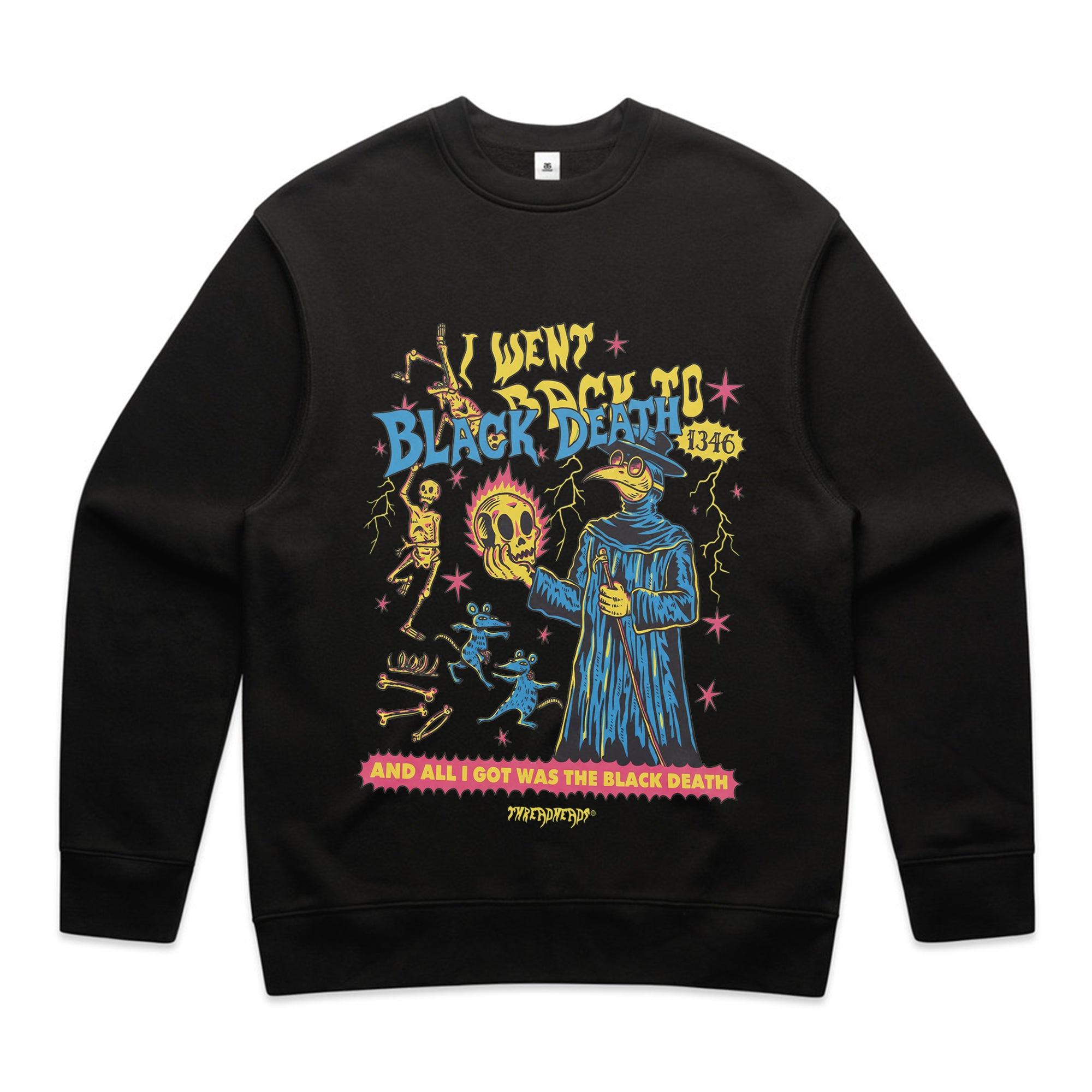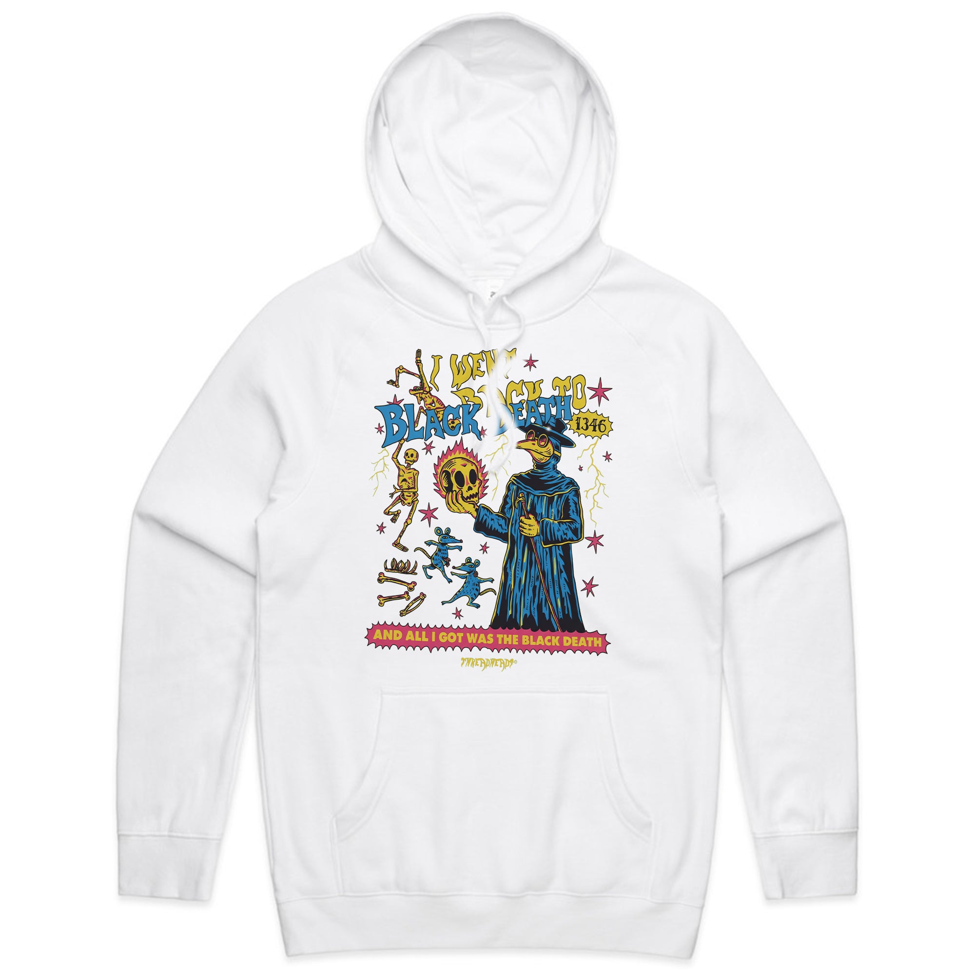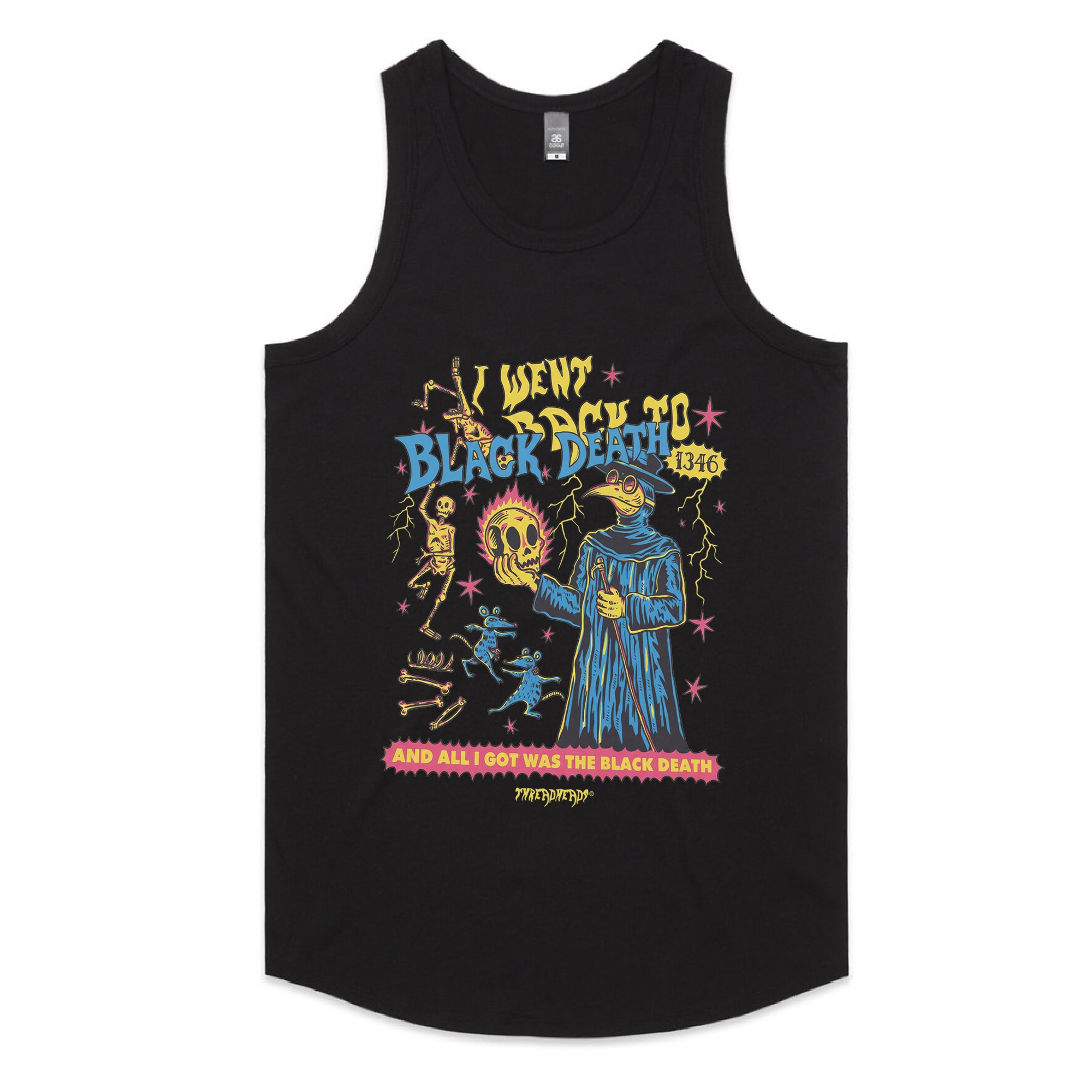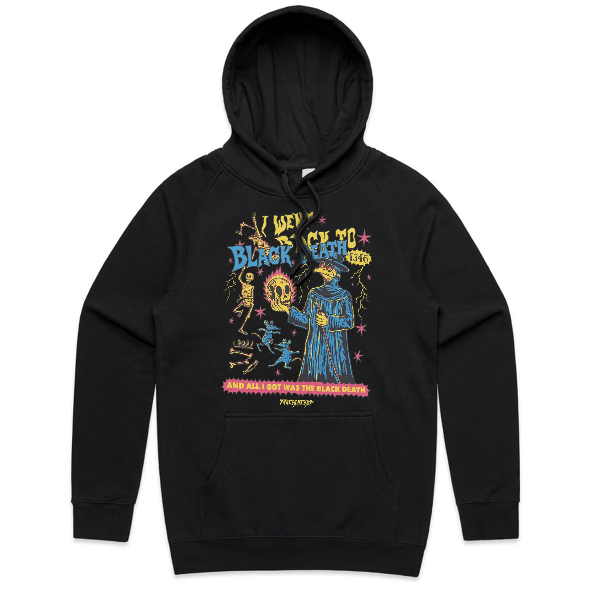 Travel back to the plague years with a dark sense of humor. Featuring a plague doctor holding a flaming skull surrounded by dancing skeletons, this tee reads “I Went Back to Black Death 1346 – And All I Got Was the Black Death.” Equal parts gothic and hilarious.