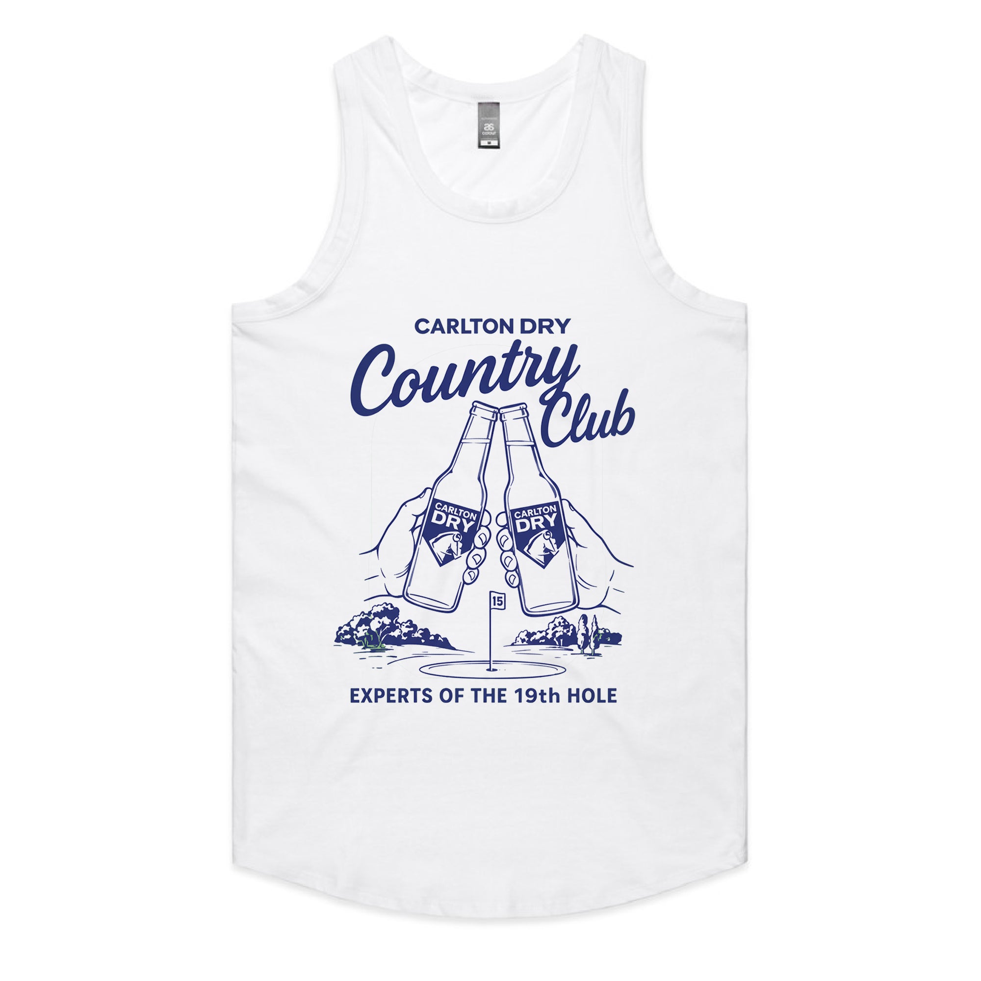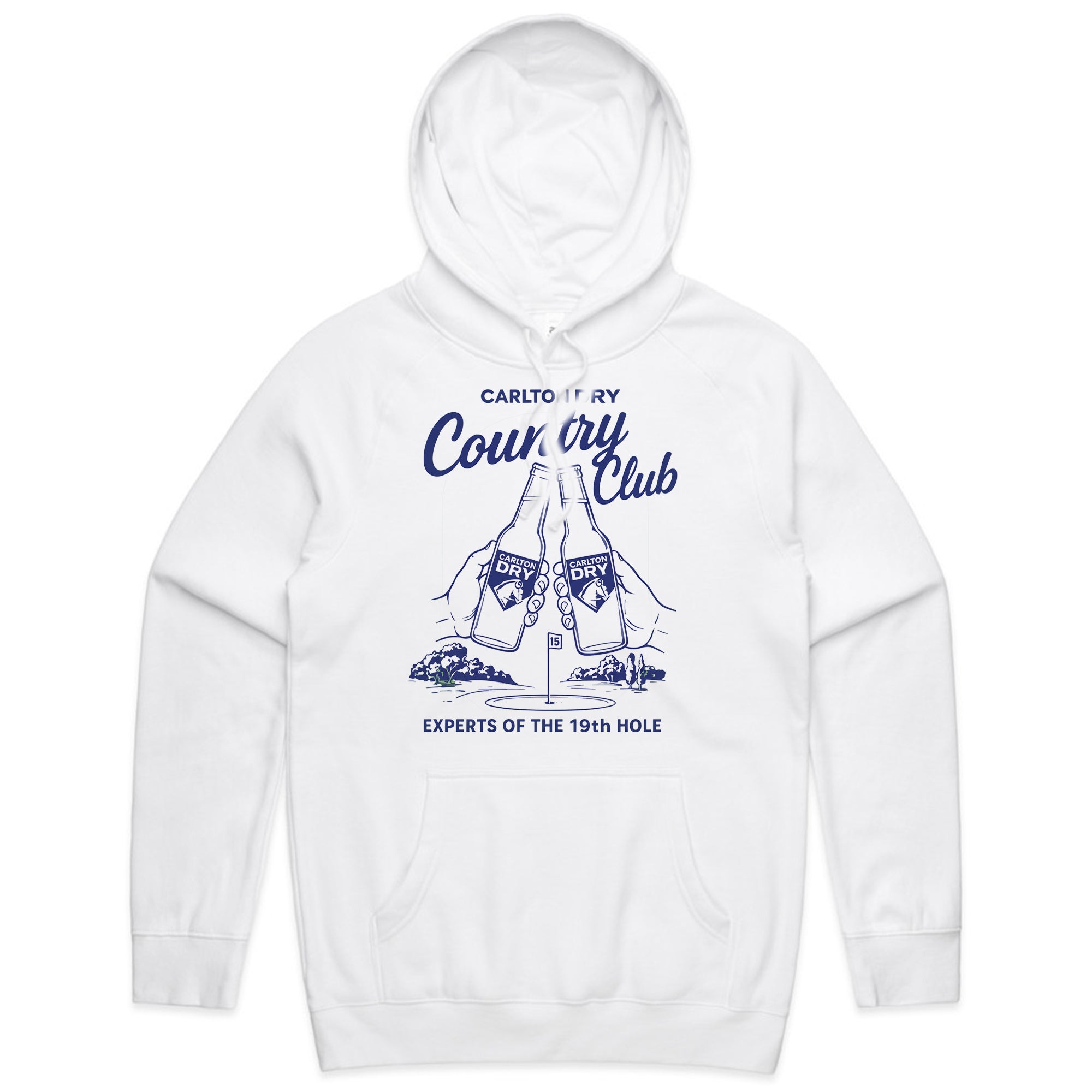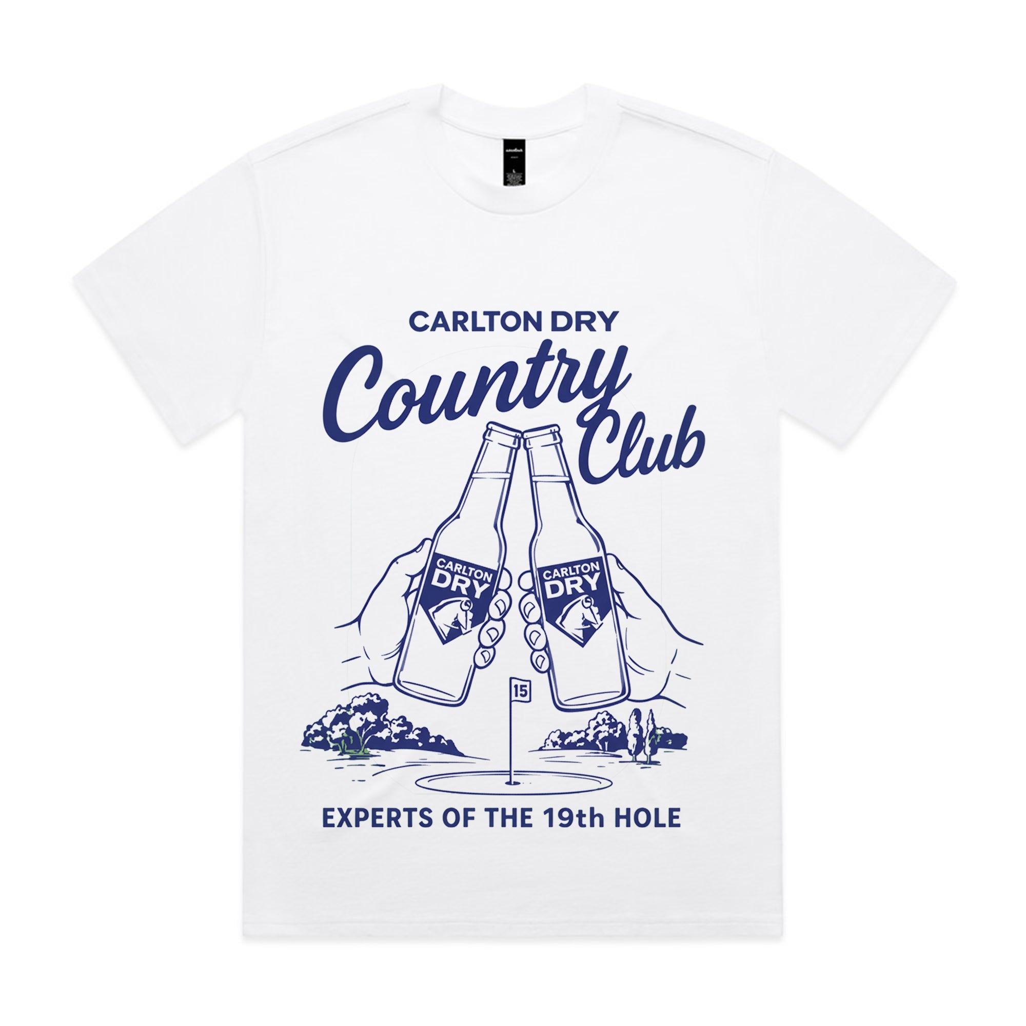 A clean, blue-line art design showing two hands clinking Carlton Dry beer bottles over a golf course landscape. It is captioned: "EXPERTS OF THE 19th HOLE."