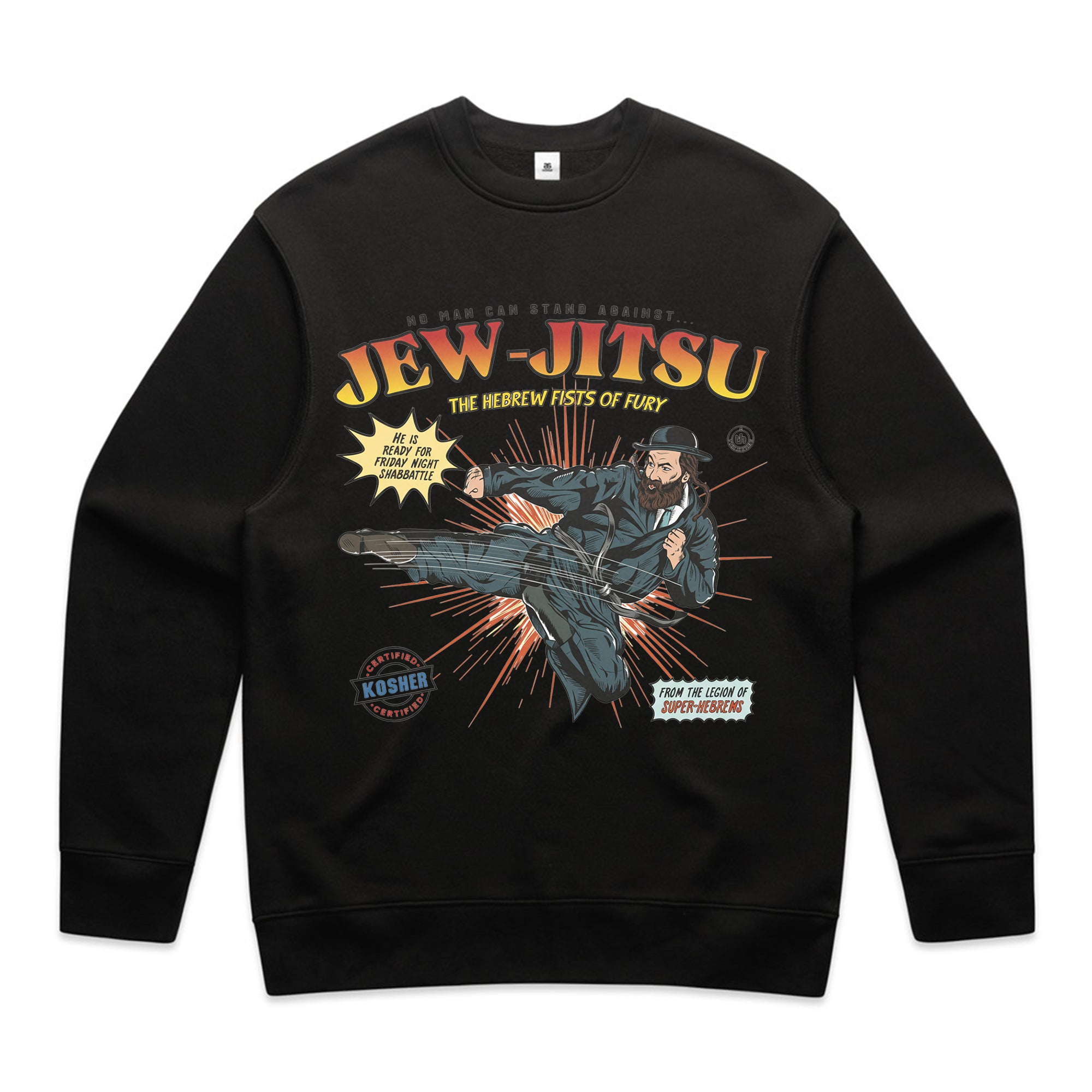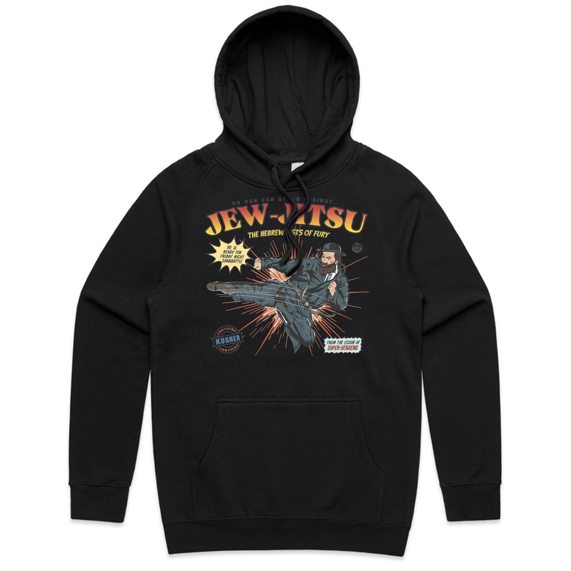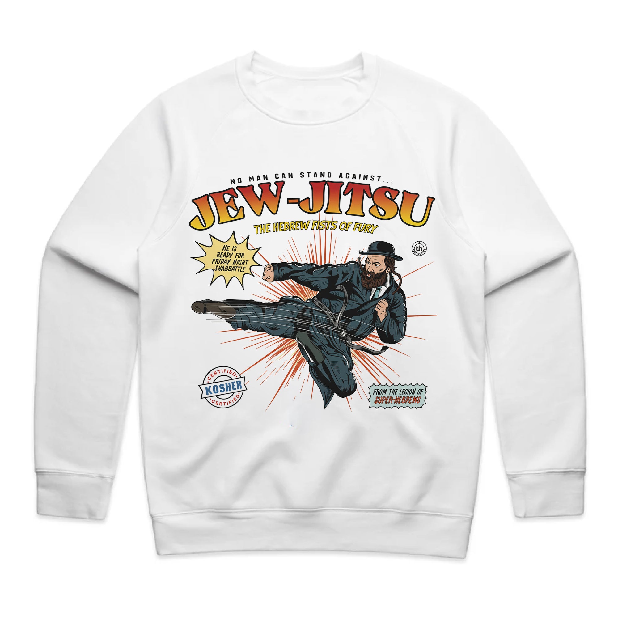 A playful comic-style design featuring a martial artist mid-kick with bold text “Jew-Jitsu: The Hebrew Fists of Fury.” Packed with vintage flair and tongue-in-cheek humor — ready for Friday night fights and laughs.