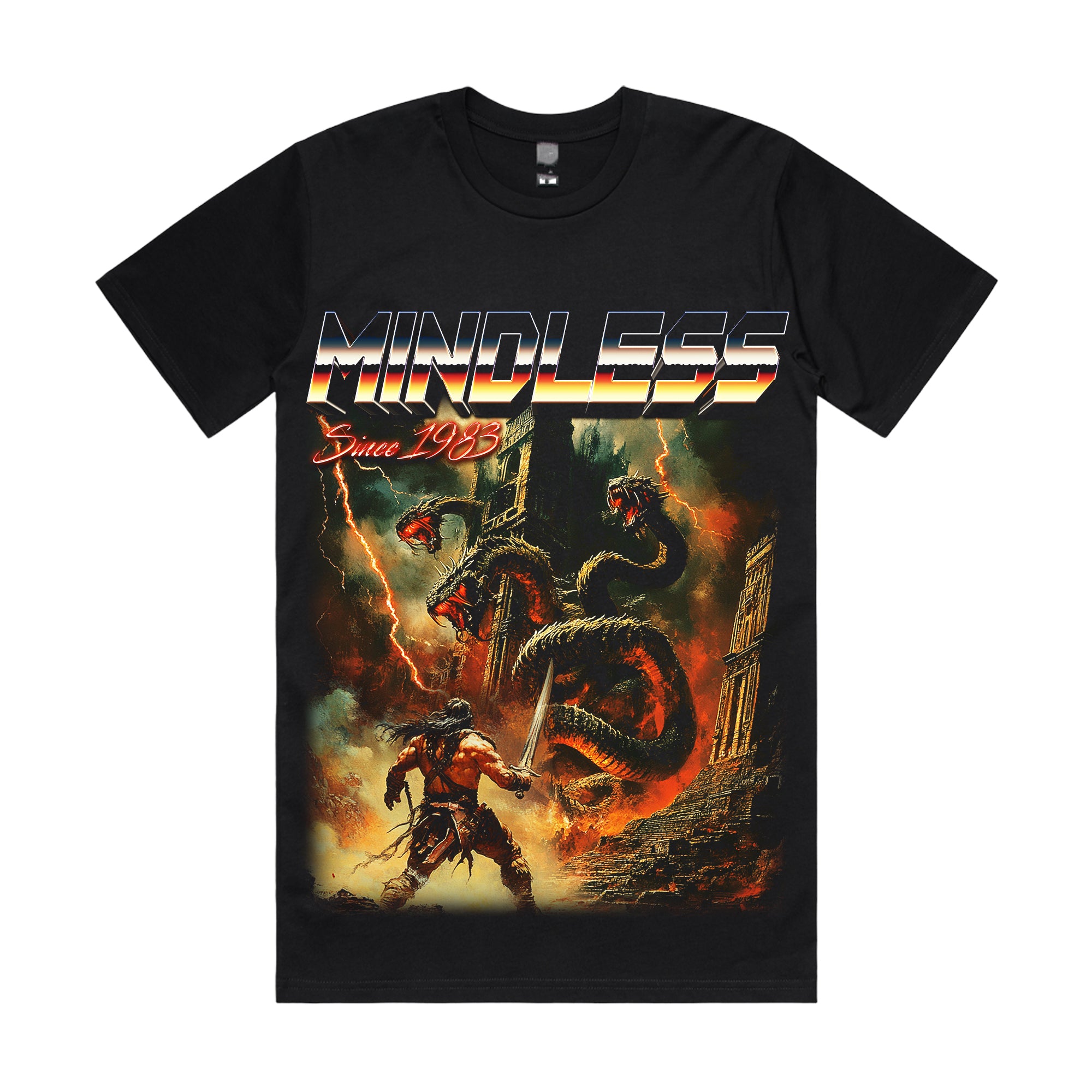 Iconic MINDLESS logo in sharp metallic tones, paired with molten red Since 1983 script