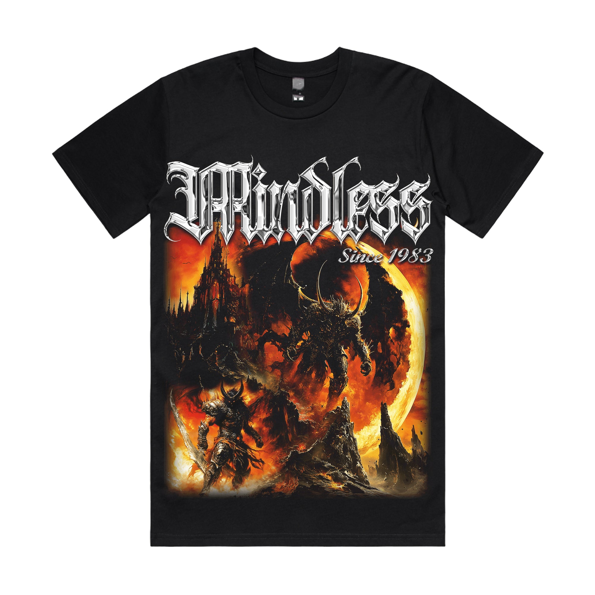 Descend into chaos with the "Infernal Warlord" T-shirt — a blazing tribute to dark power, hellfire reign, and eternal conflict. At its core, the artwork unleashes a colossal demonic warlord rising beneath a scorched blood-moon sky, wings of flame spread wide, summoning doom upon a crumbling world. Below him, a lone armored warrior faces the abyss, sword drawn against impossible odds. In the distance, obsidian towers burn under crimson light. The bold gothic “Mindless – Since 1983” print crowns the design with fierce vintage metal energy.