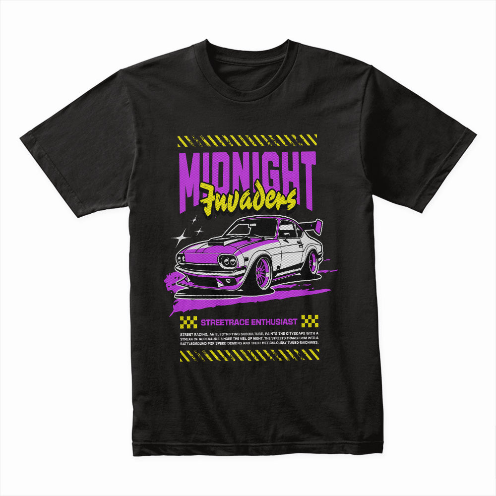 Step into the world of underground speed with the Midnight Invaders T-Shirt. Showcasing a powerful JDM street racer with bold neon colors, this design captures the intensity, adrenaline, and attitude of late-night street racing.
