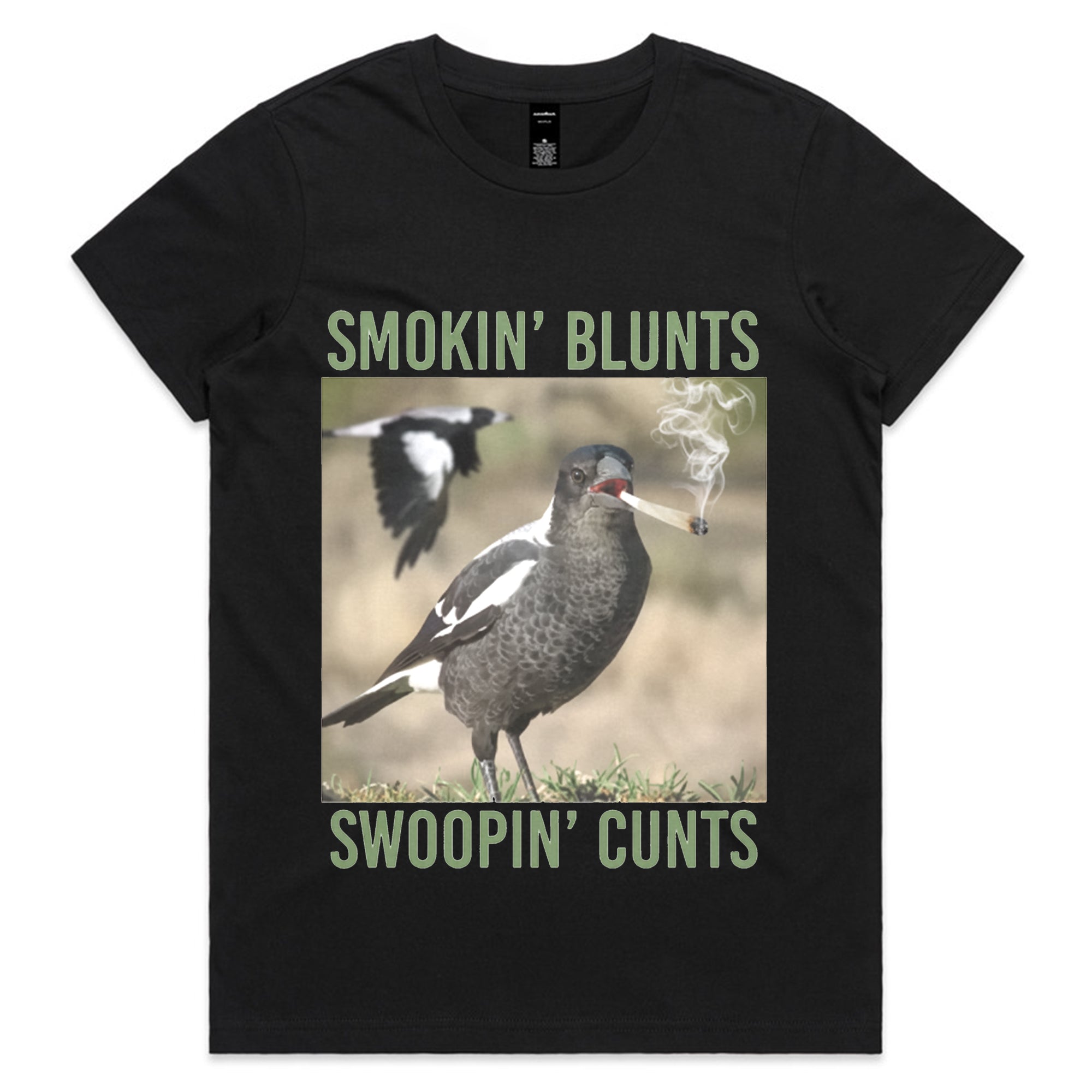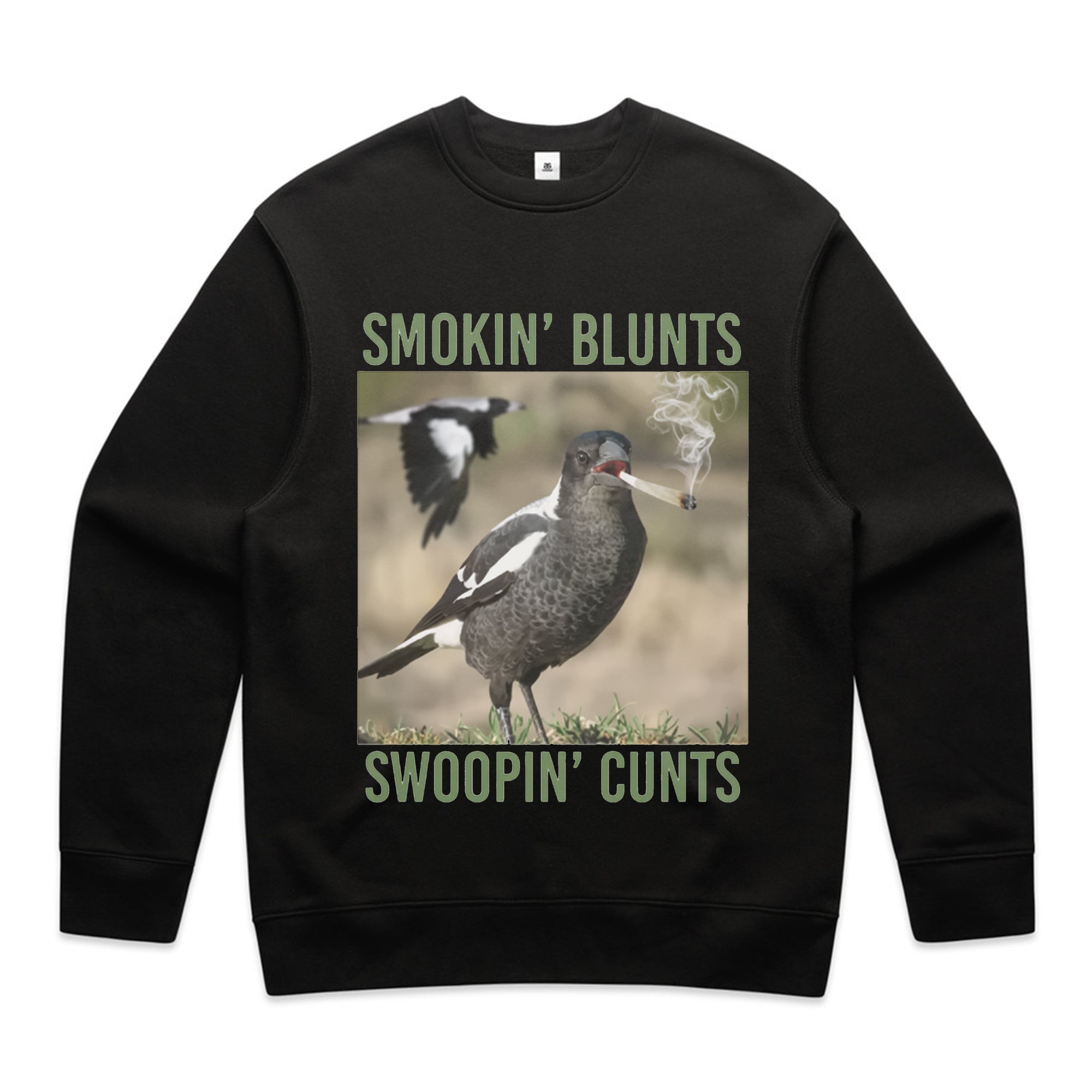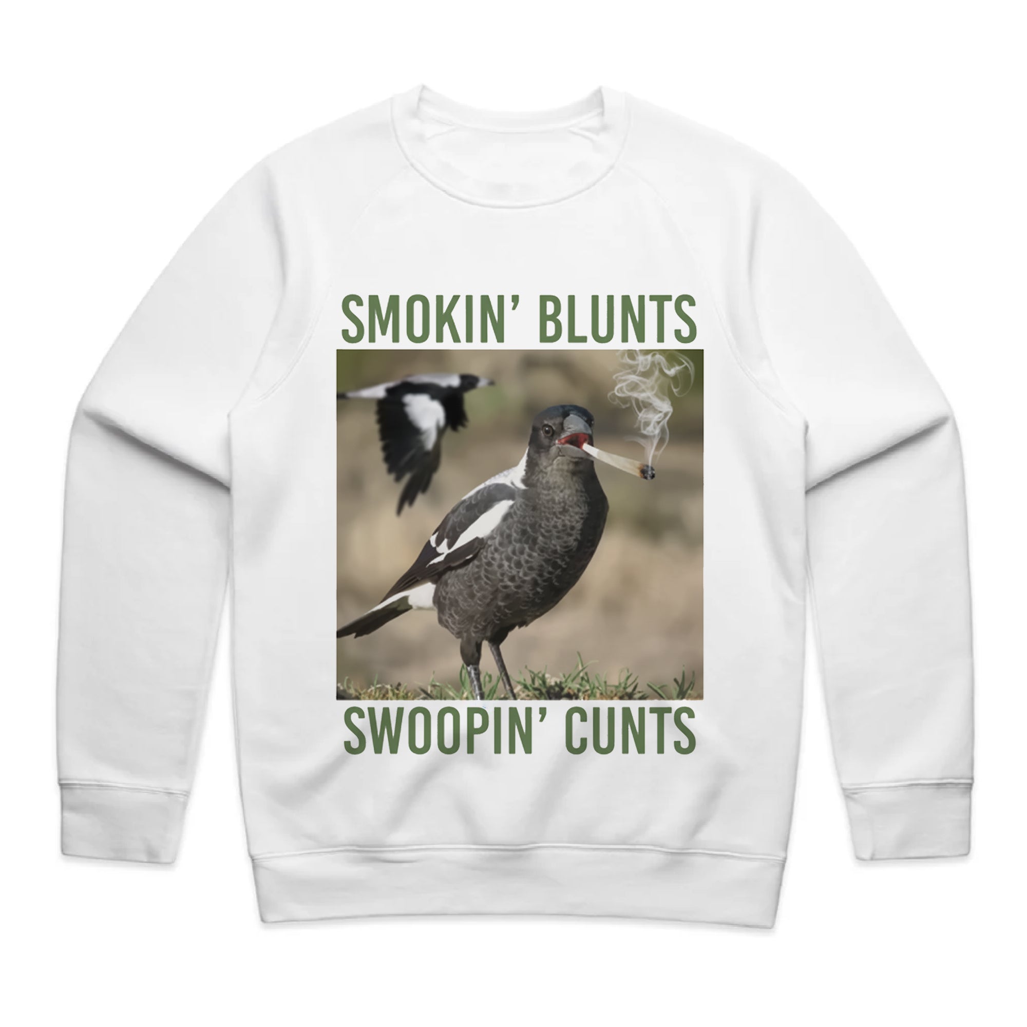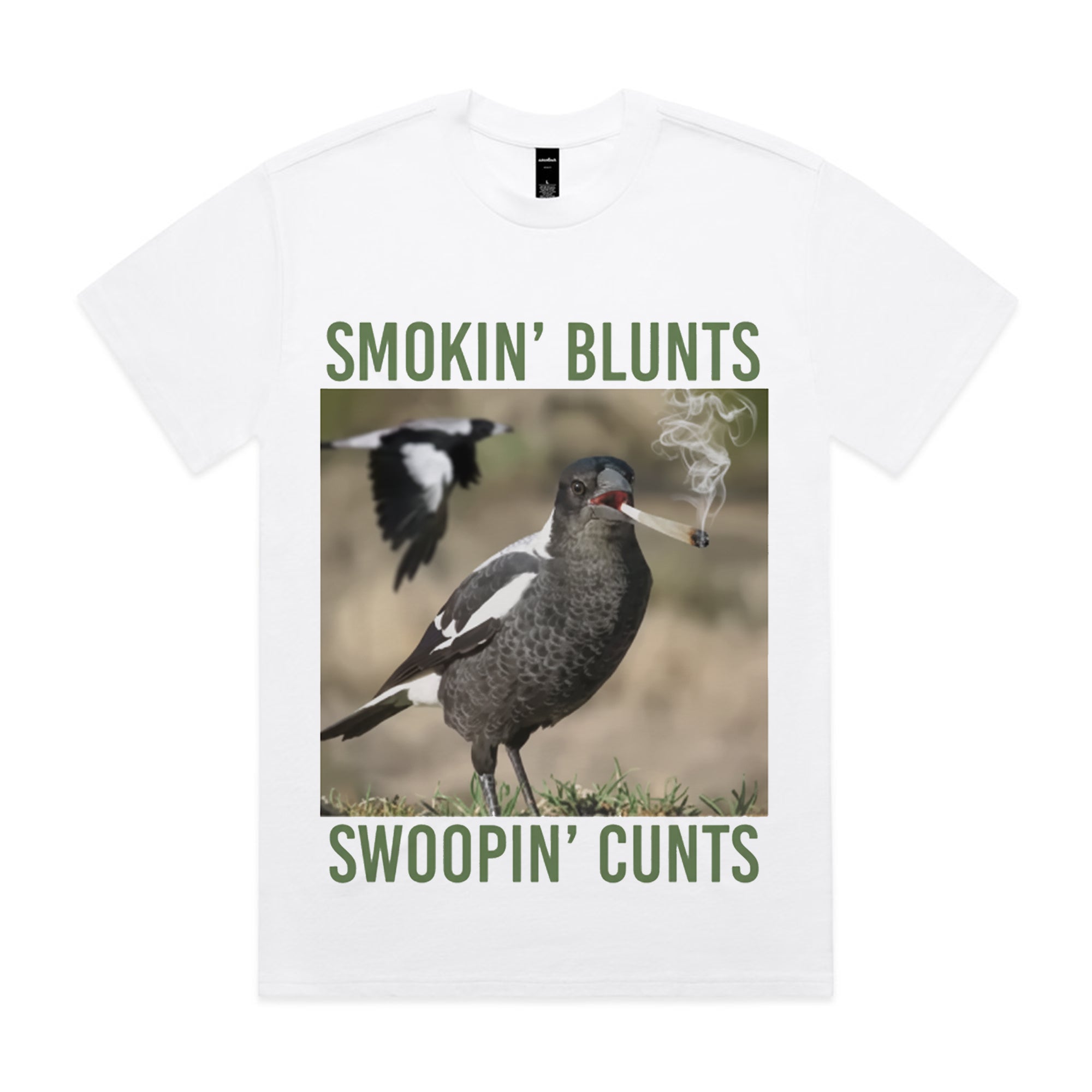 A bold, irreverent graphic featuring a tough-looking magpie holding a smoking blunt, captured mid-attitude. The design leans heavily into dark humor and Australian-style sarcasm, combining wildlife imagery with rebellious street culture energy. Made to shock, amuse, and stand out instantly.