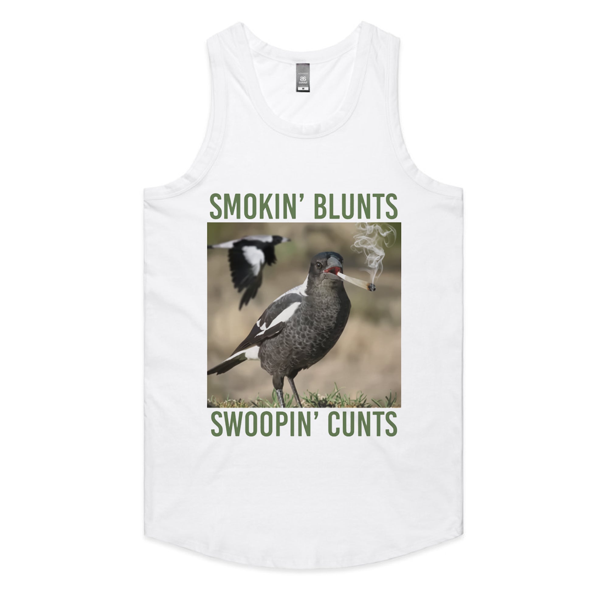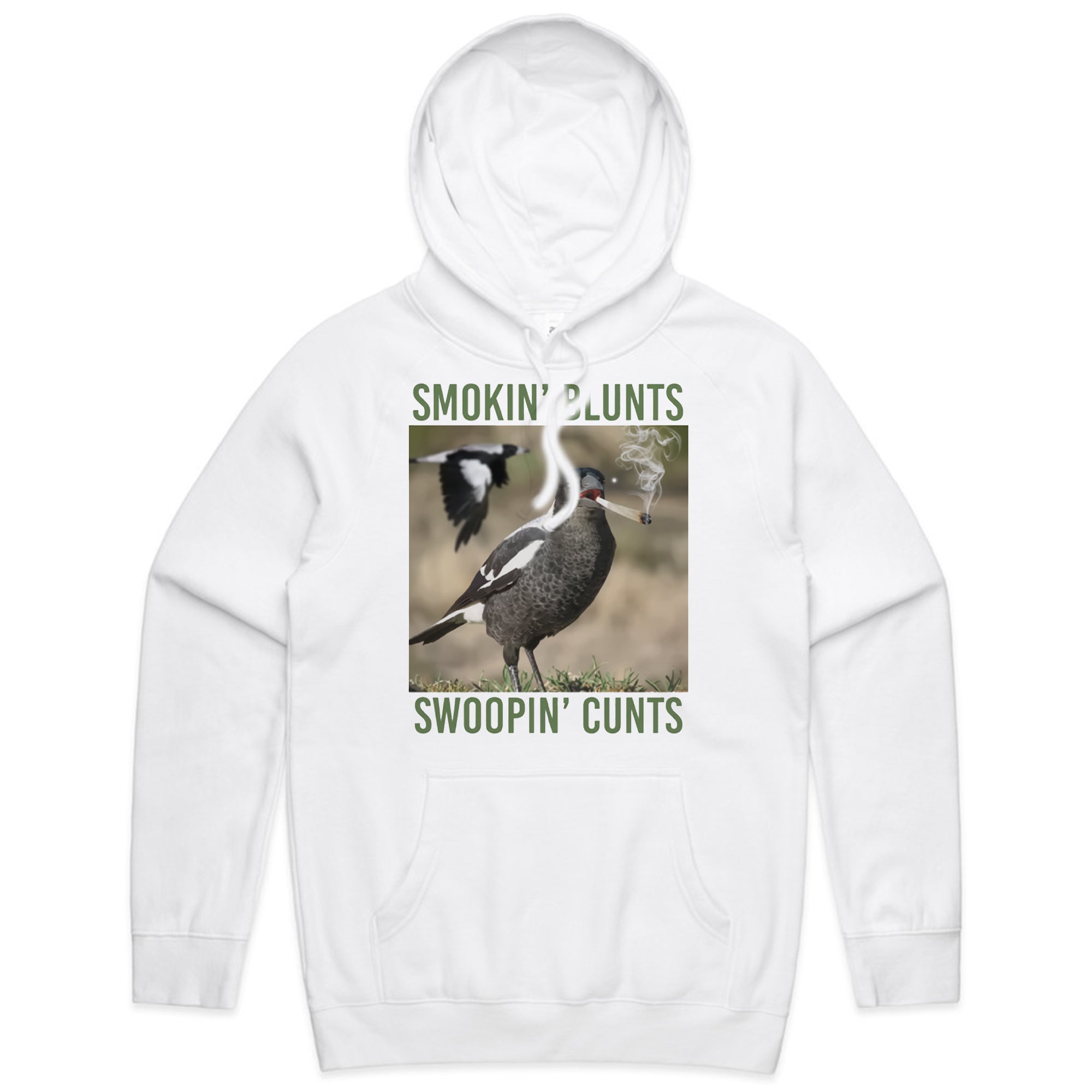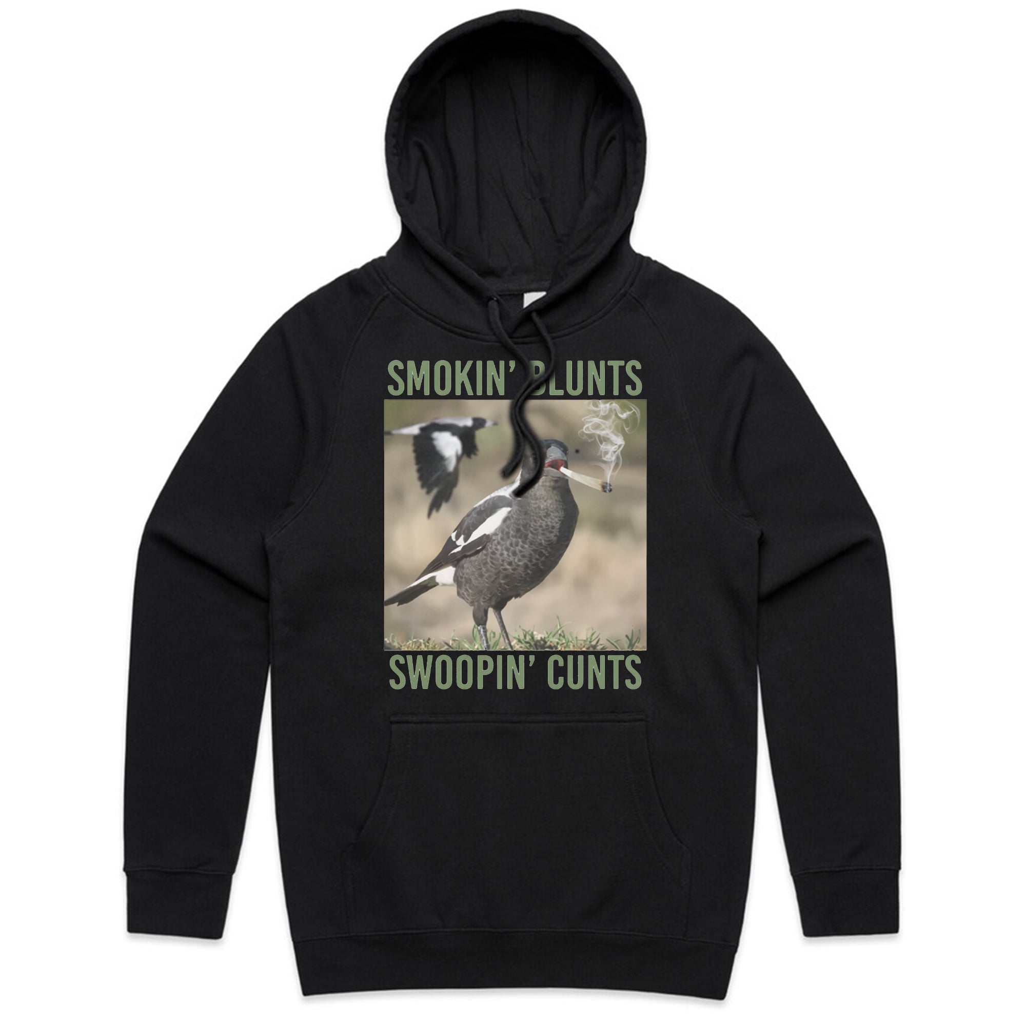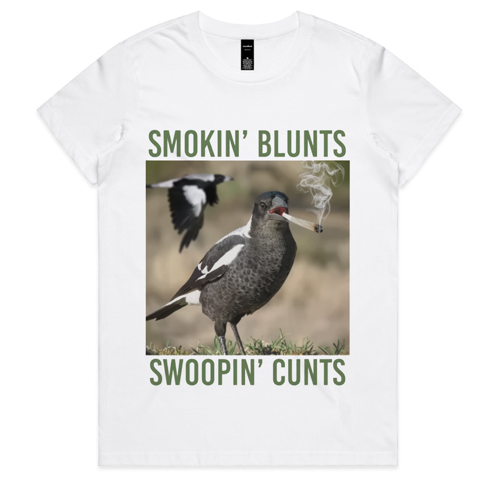 A bold, irreverent graphic featuring a tough-looking magpie holding a smoking blunt, captured mid-attitude. The design leans heavily into dark humor and Australian-style sarcasm, combining wildlife imagery with rebellious street culture energy. Made to shock, amuse, and stand out instantly.