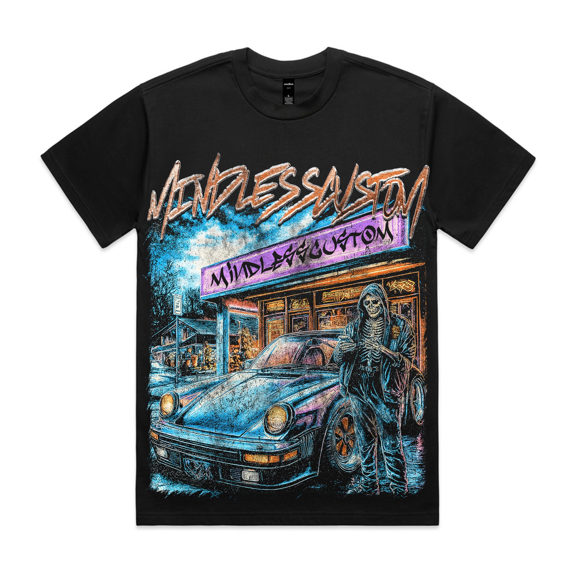 🚗💀 Street dominance redefined. Featuring a skeleton leaning on a neon-lit sports car in front of the “Mindless Custom” store, this tee radiates urban outlaw energy. The graffiti-style lettering adds extra grit and late-night street vibes.
