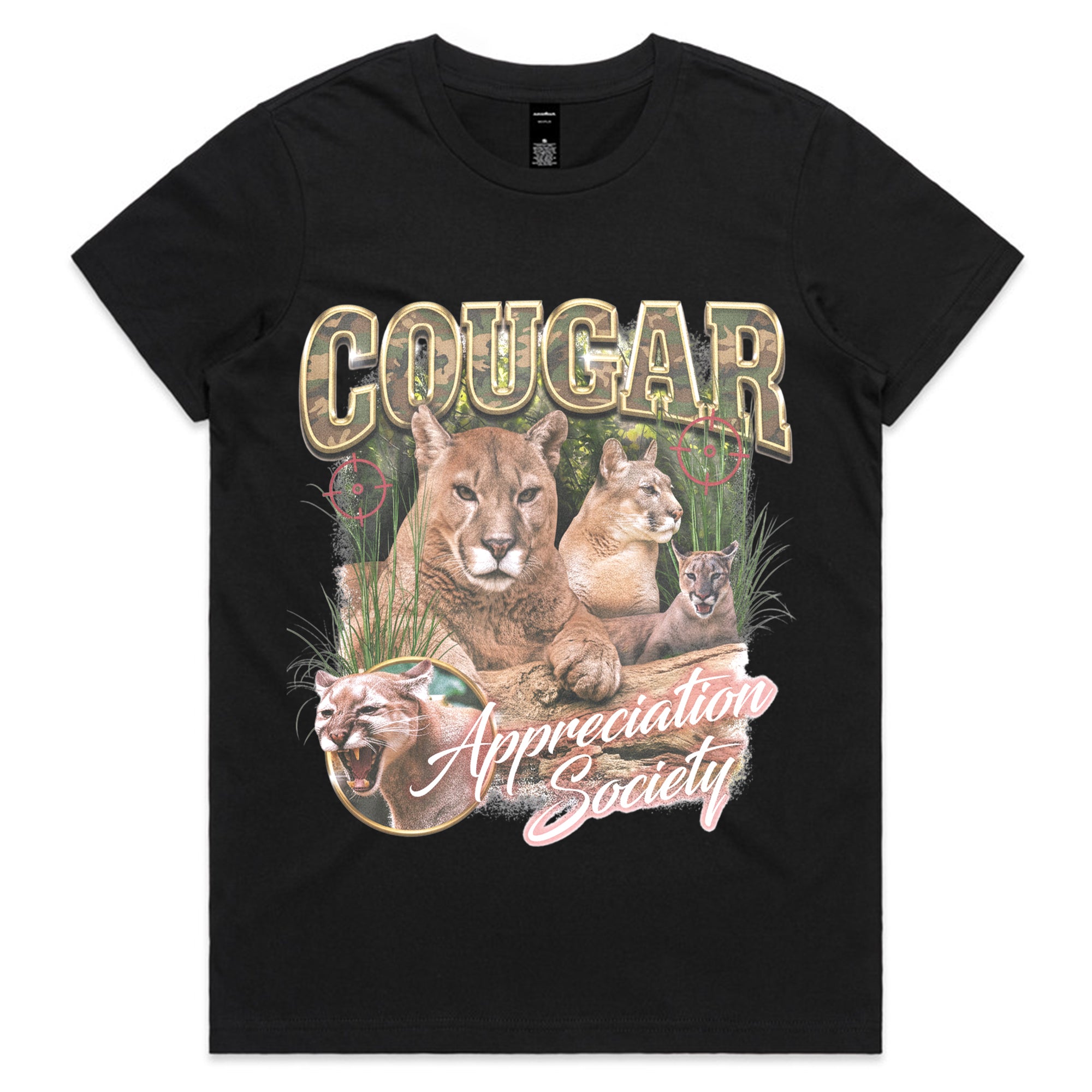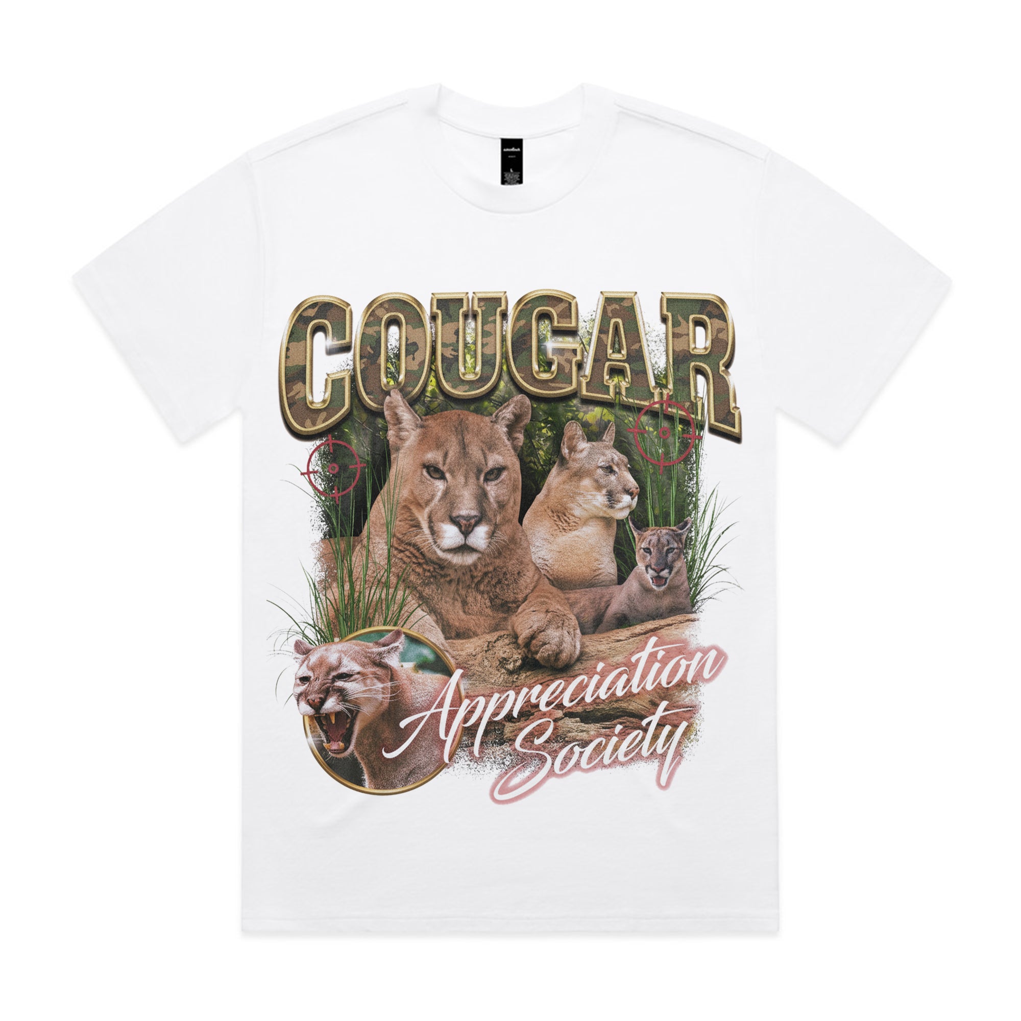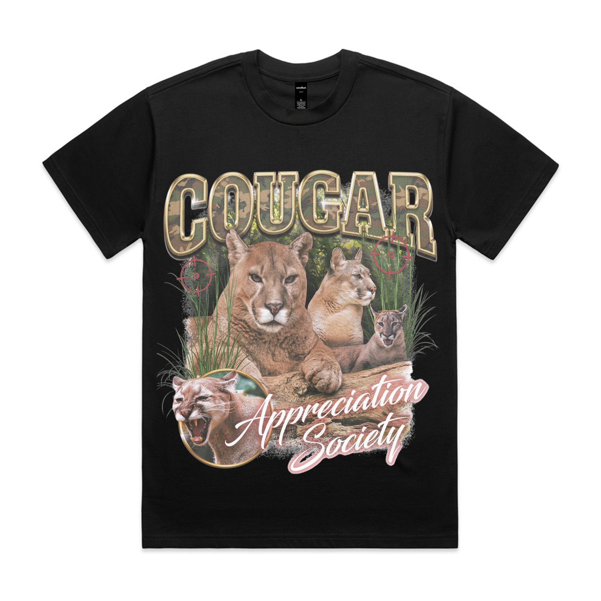 Celebrate fierce independence and wild energy with the Cougar Appreciation Society tee. Featuring detailed cougar artwork surrounded by nature, this design pays tribute to the power, grace, and spirit of the mountain cat. A bold, vintage-style print for anyone who walks their own path.