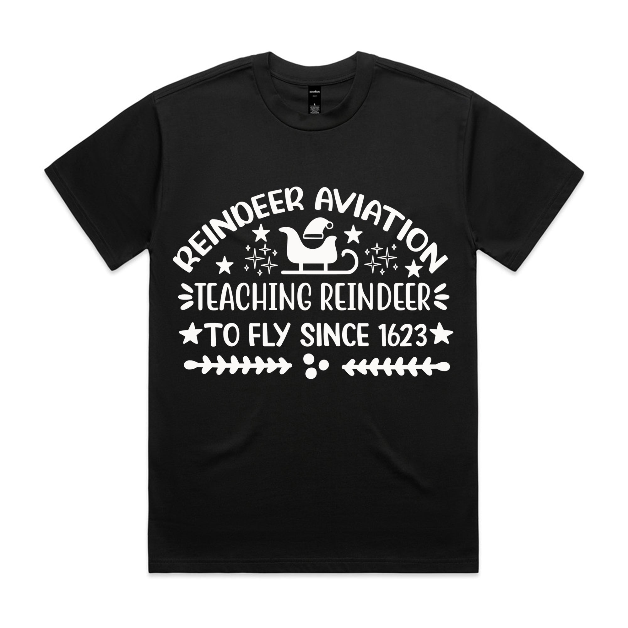 Join the fun with this 'Reindeer Aviation' t-shirt, celebrating the flying reindeer tradition since 1623. Perfect for any holiday enthusiast or aviation lover!