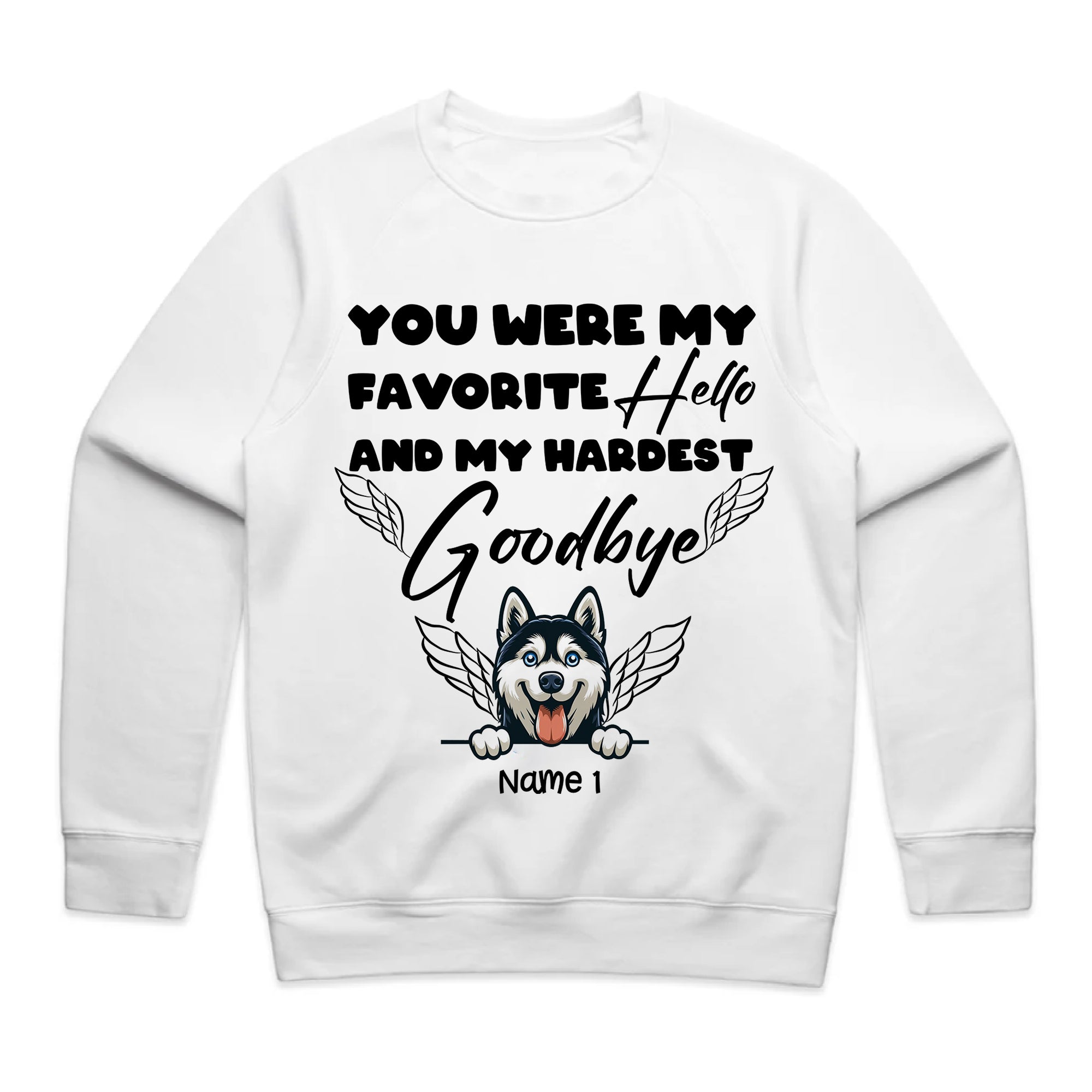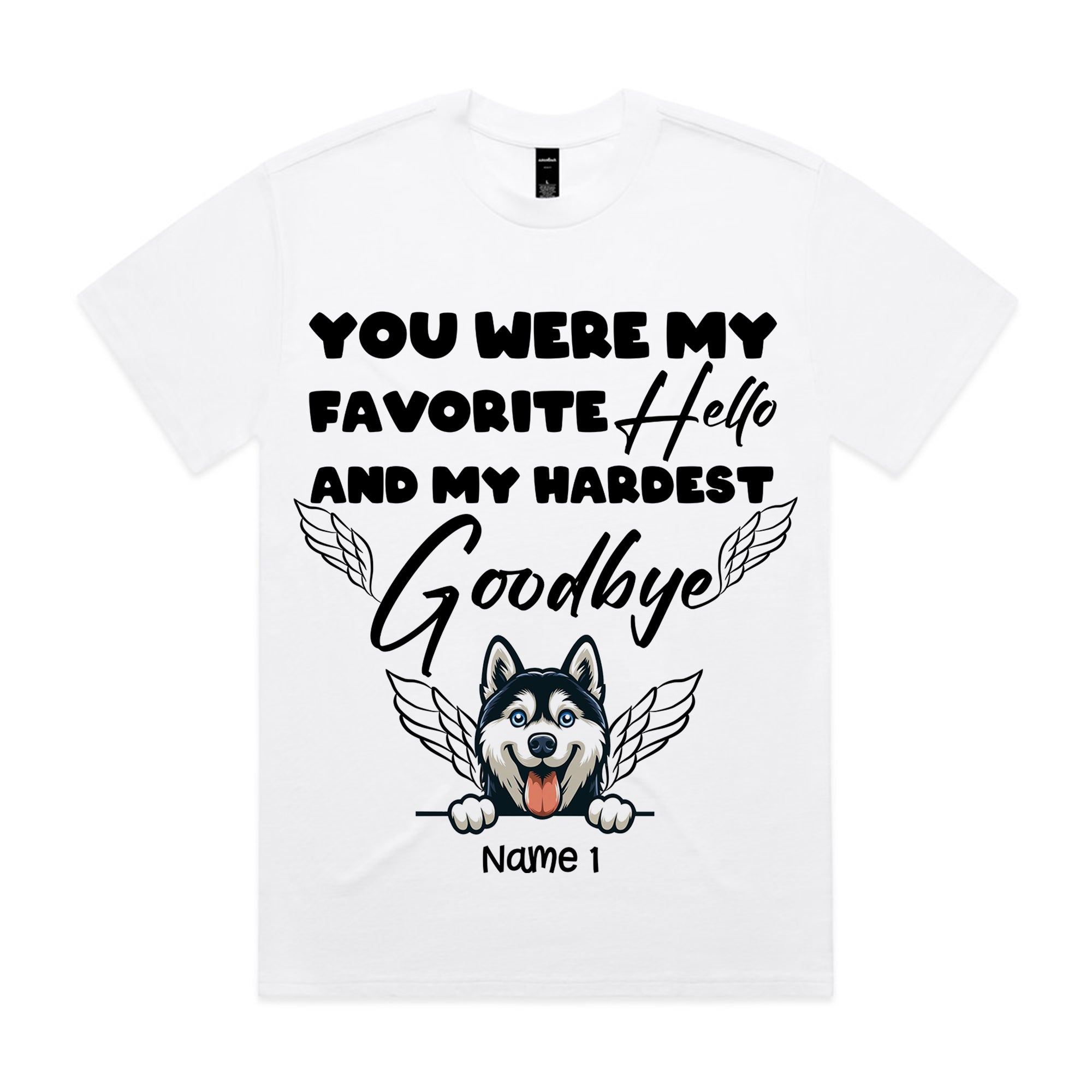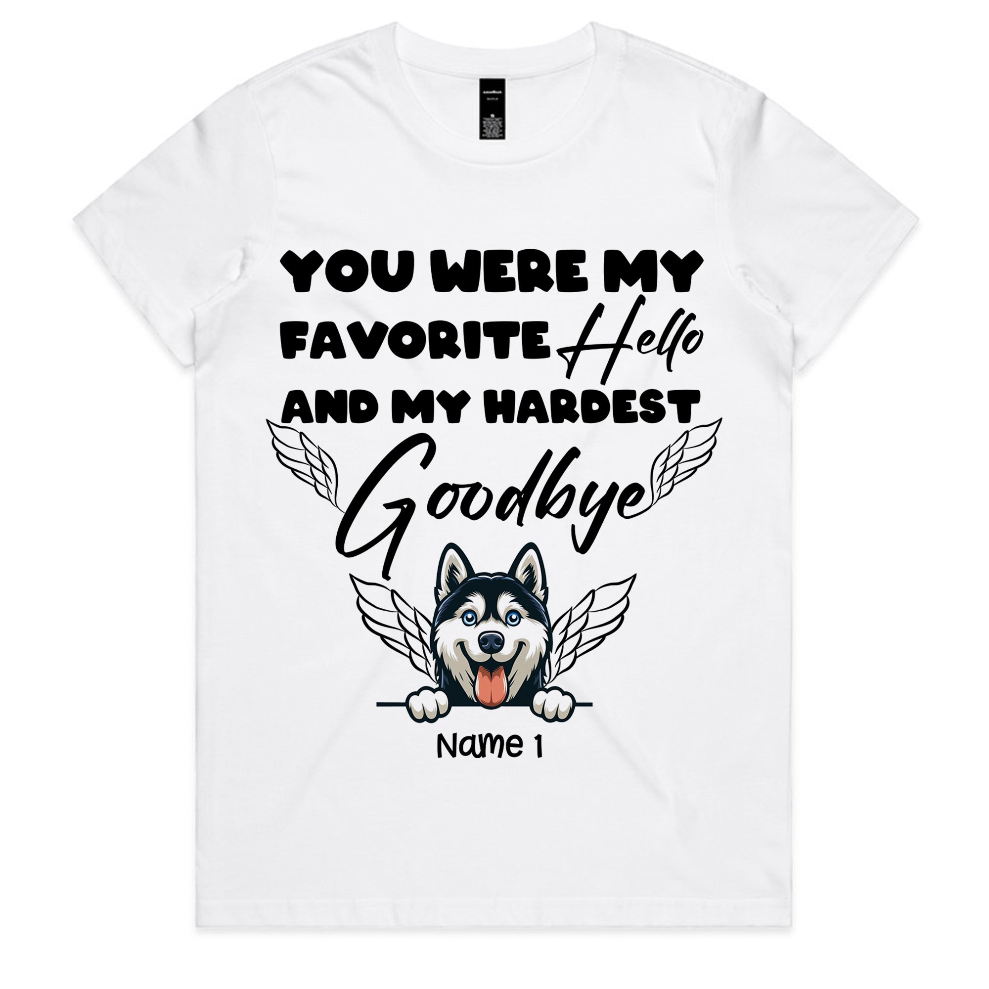 Product Title: Personalized Pet Memorial T-Shirt – Favorite Hello Hardest Goodbye Husky Angel Tee