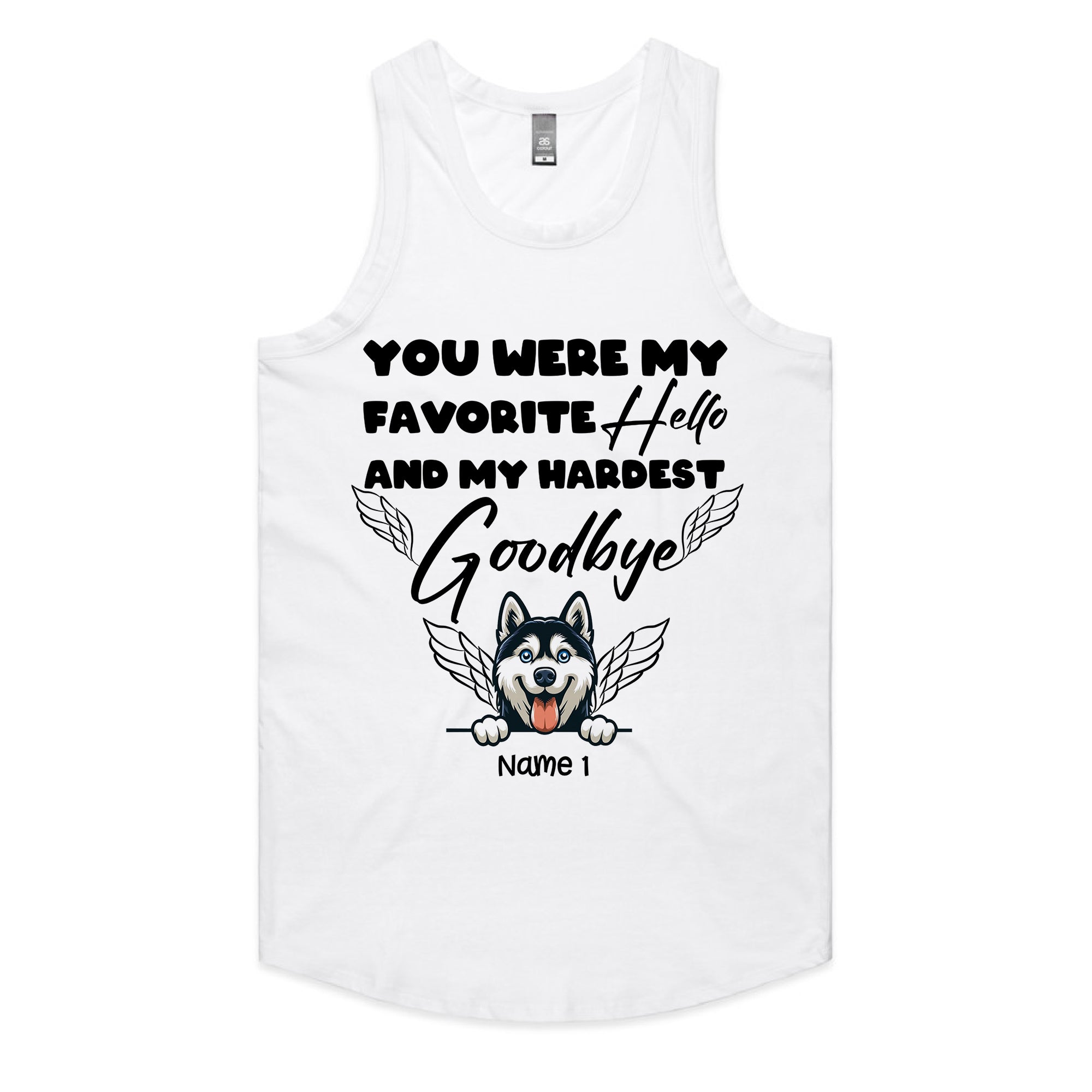 Angel Pup Graphic: Showcases a happy, tongue-out Husky with wings, symbolizing their spirit soaring as an angel over the personalized name banner.