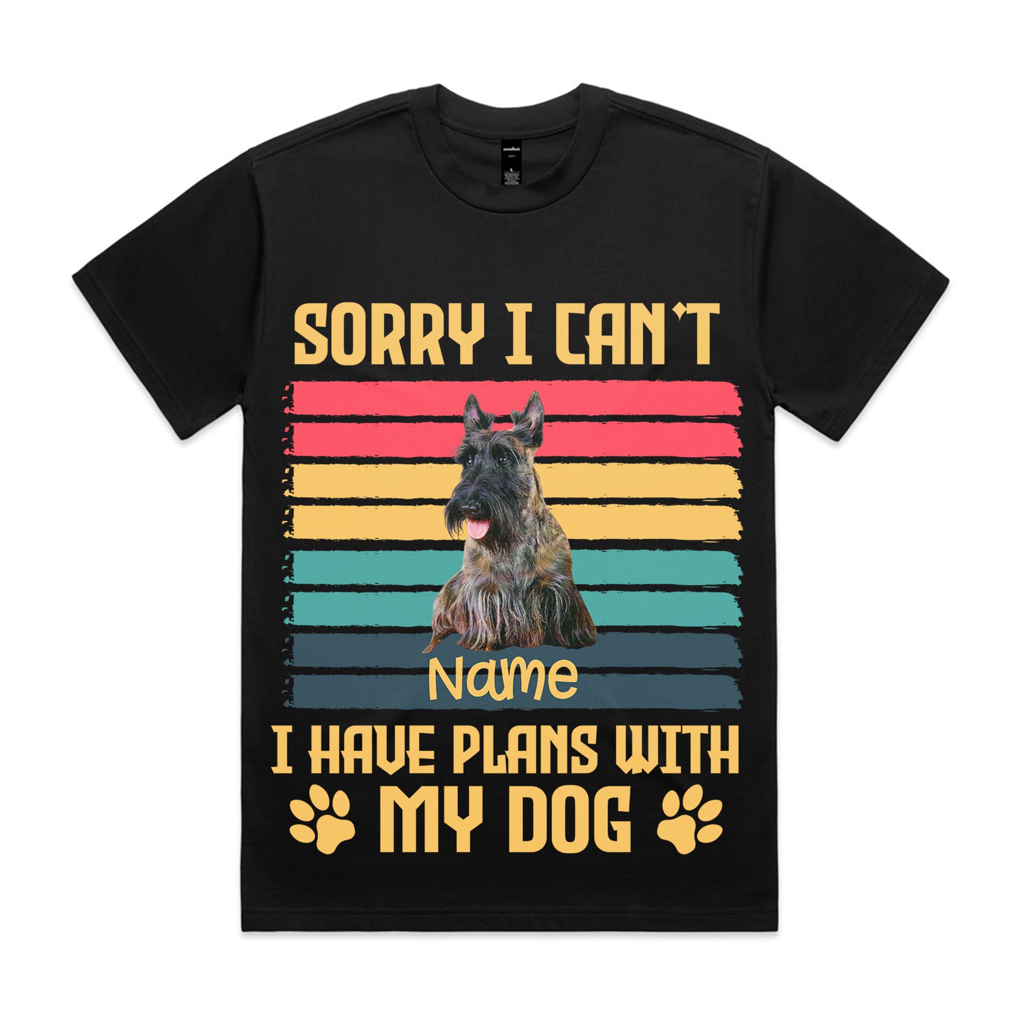 This T-shirt features a playful and eye-catching design perfect for dog lovers. The shirt has a bold message that reads “SORRY I CAN’T, I HAVE PLANS WITH MY DOG”, with two paw prints adding a cute touch. At the center, there’s an image of a dog, set against a retro-style striped background in warm, vintage colors—red, yellow, teal, and navy. Below the image, there’s a customizable space labeled “Name”, where the pet’s name can be added for a personal touch.