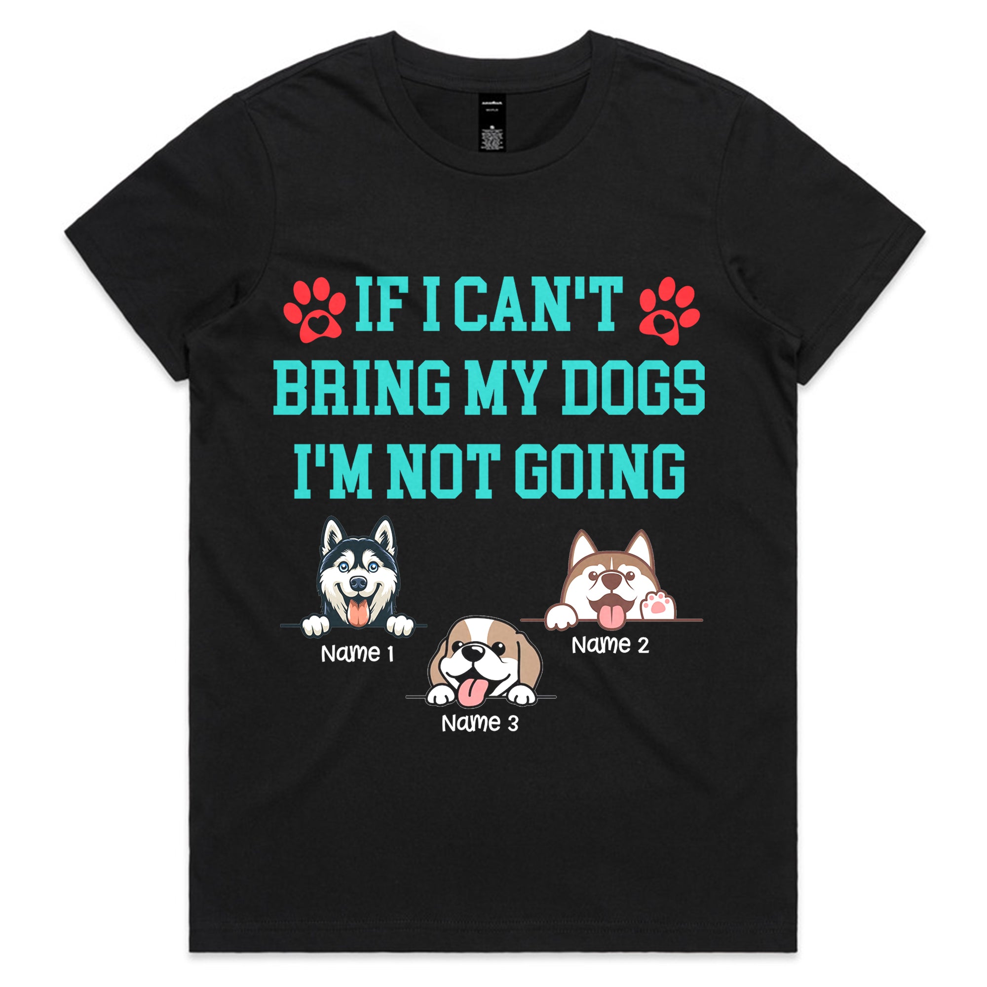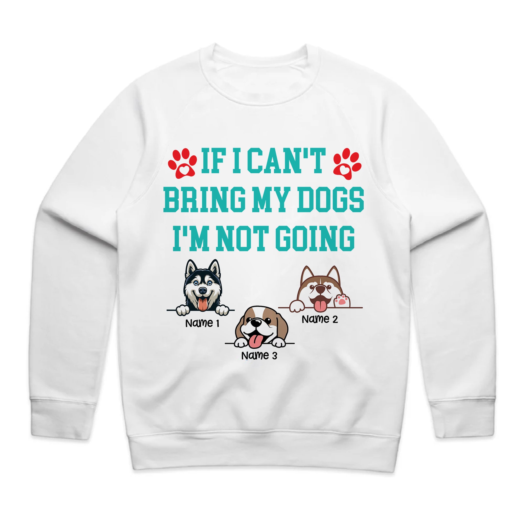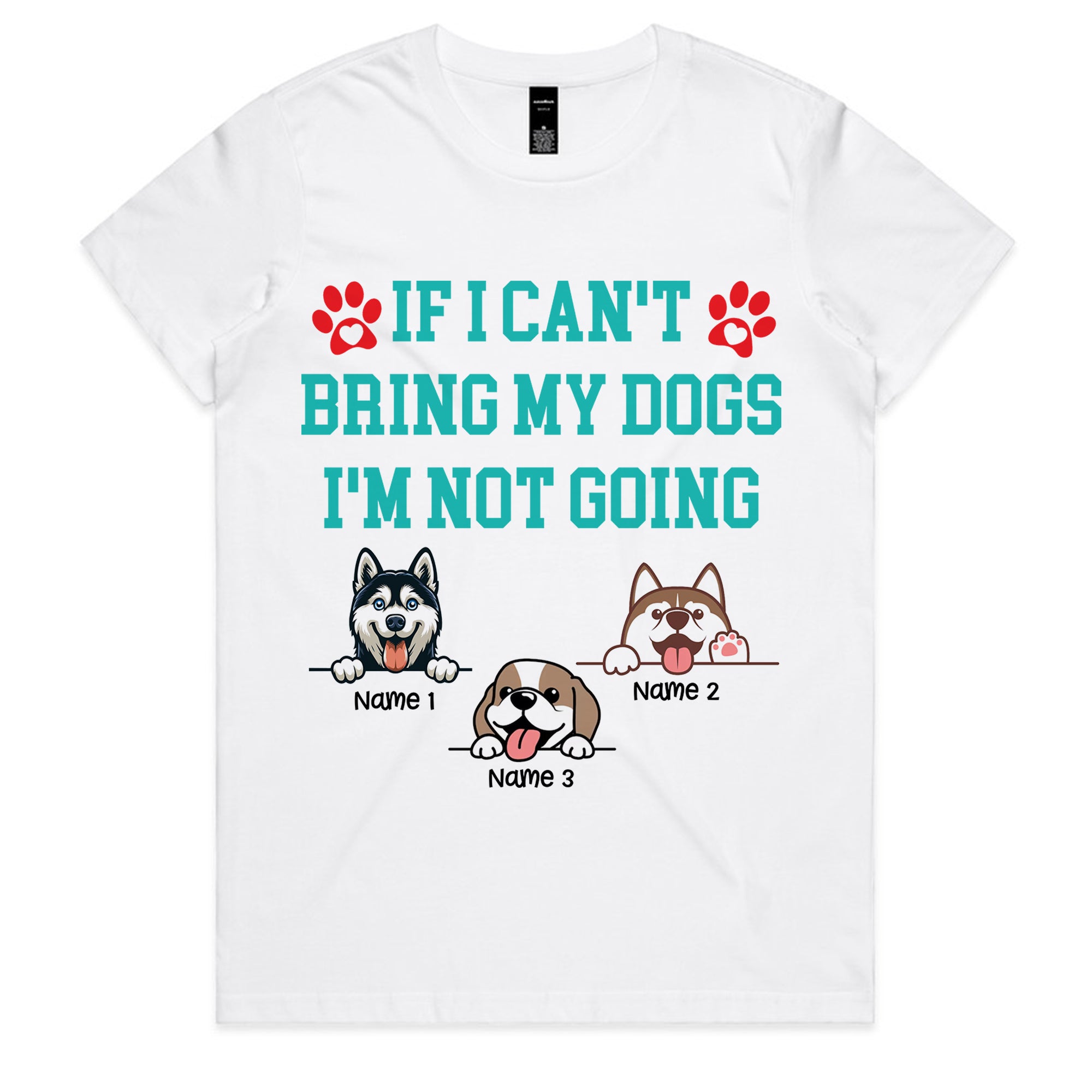 Bold, Relatable Slogan: Features the viral and true-to-life statement: "IF I CAN'T BRING MY DOGS I'M NOT GOING" in a striking, bright blue font with contrasting red paw prints.