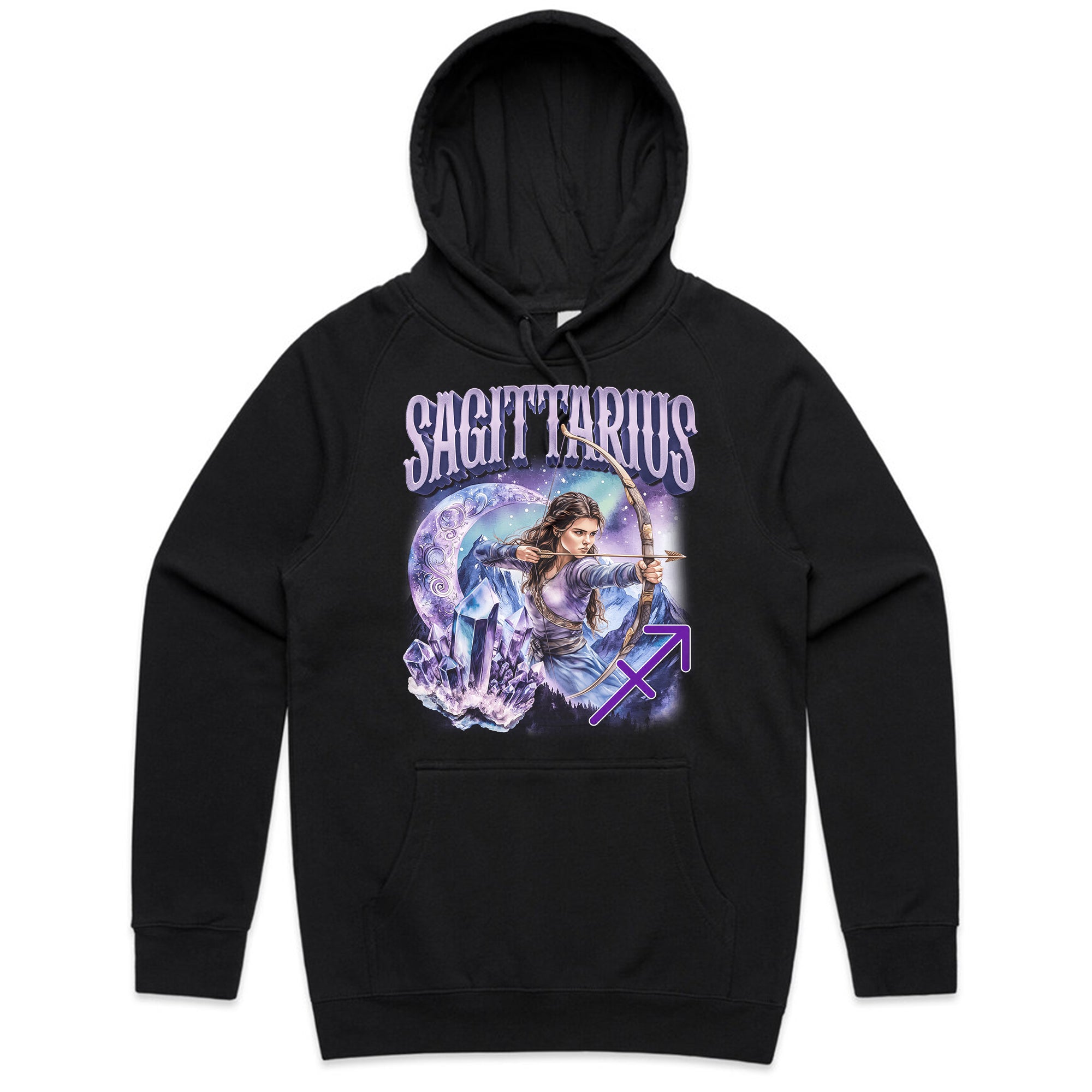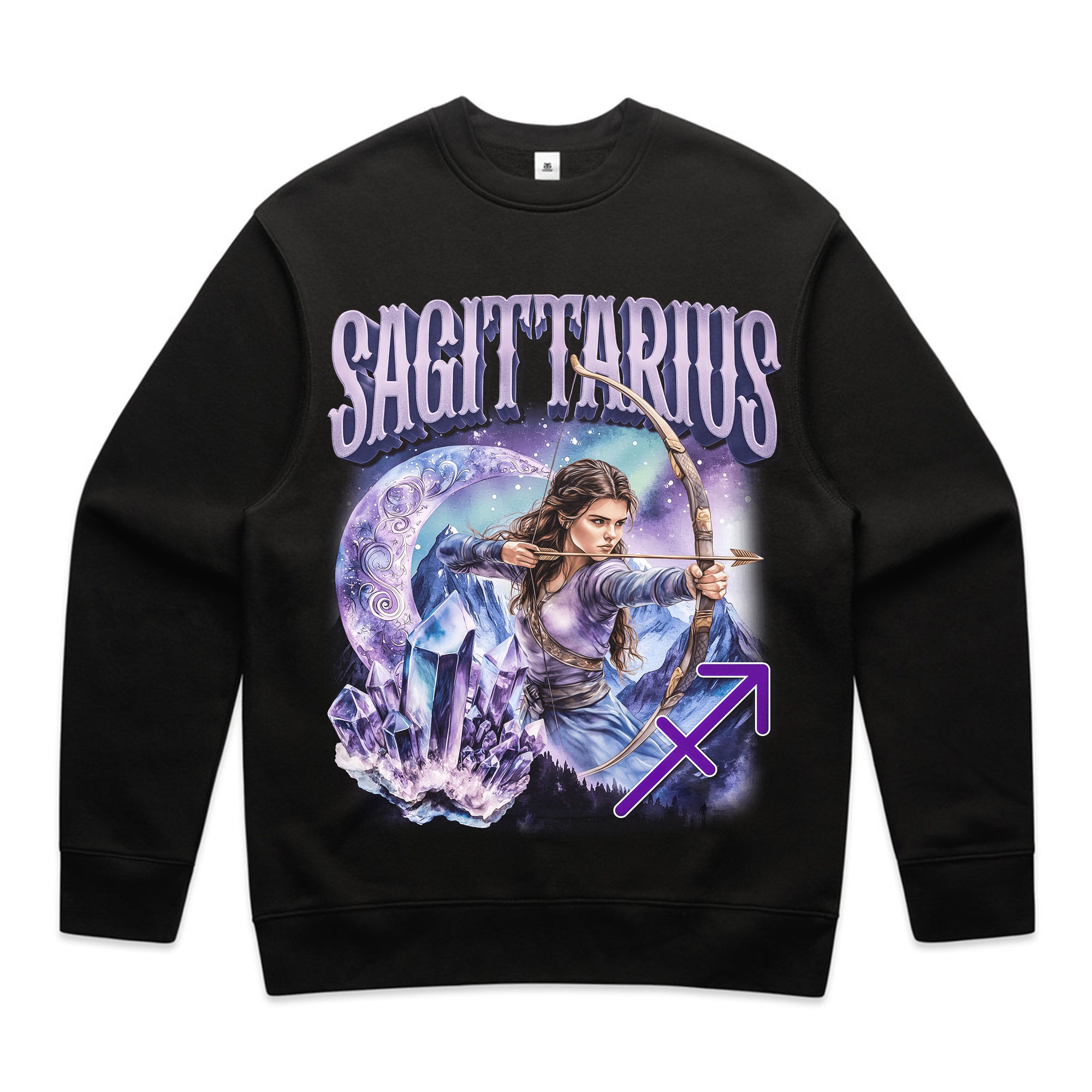 Aim high with the adventurous spirit of Sagittarius. Featuring a fierce archer surrounded by cosmic moons, mountains, and radiant crystals, this tee captures the fearless energy and boundless curiosity of the zodiac’s wanderer.