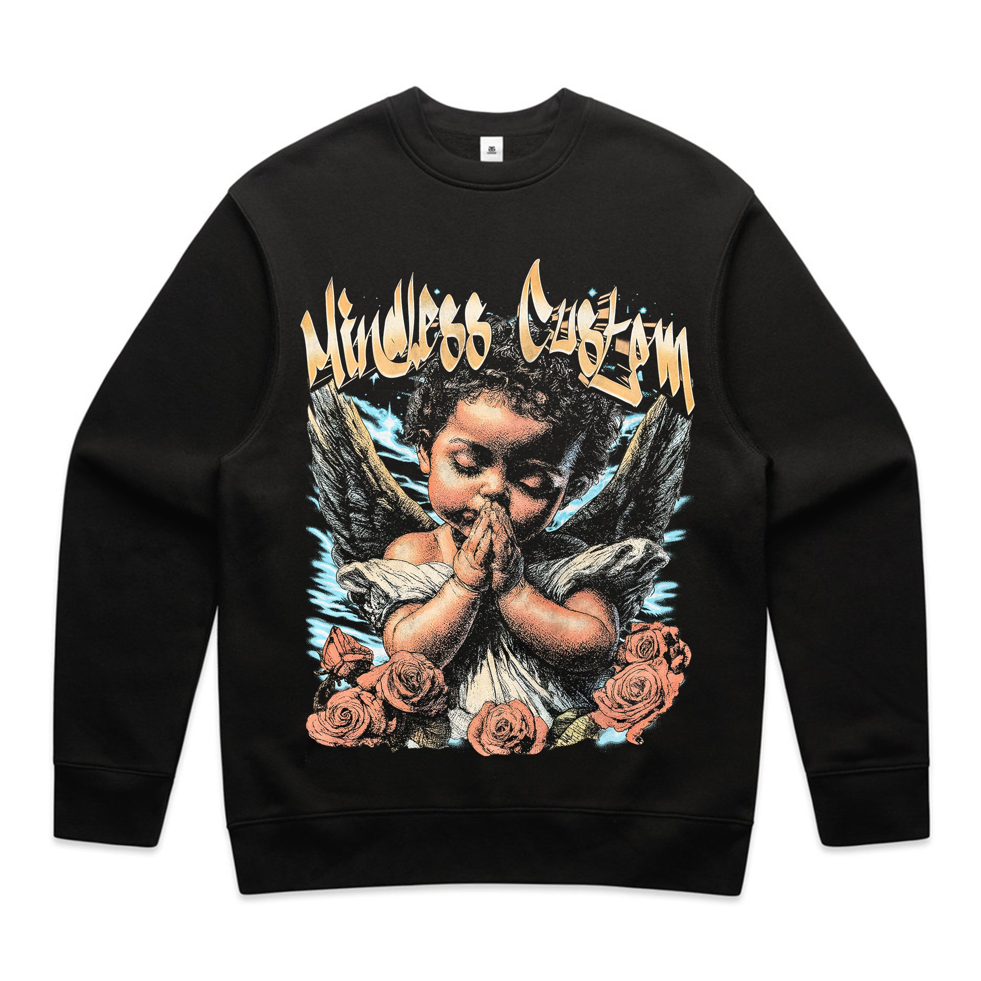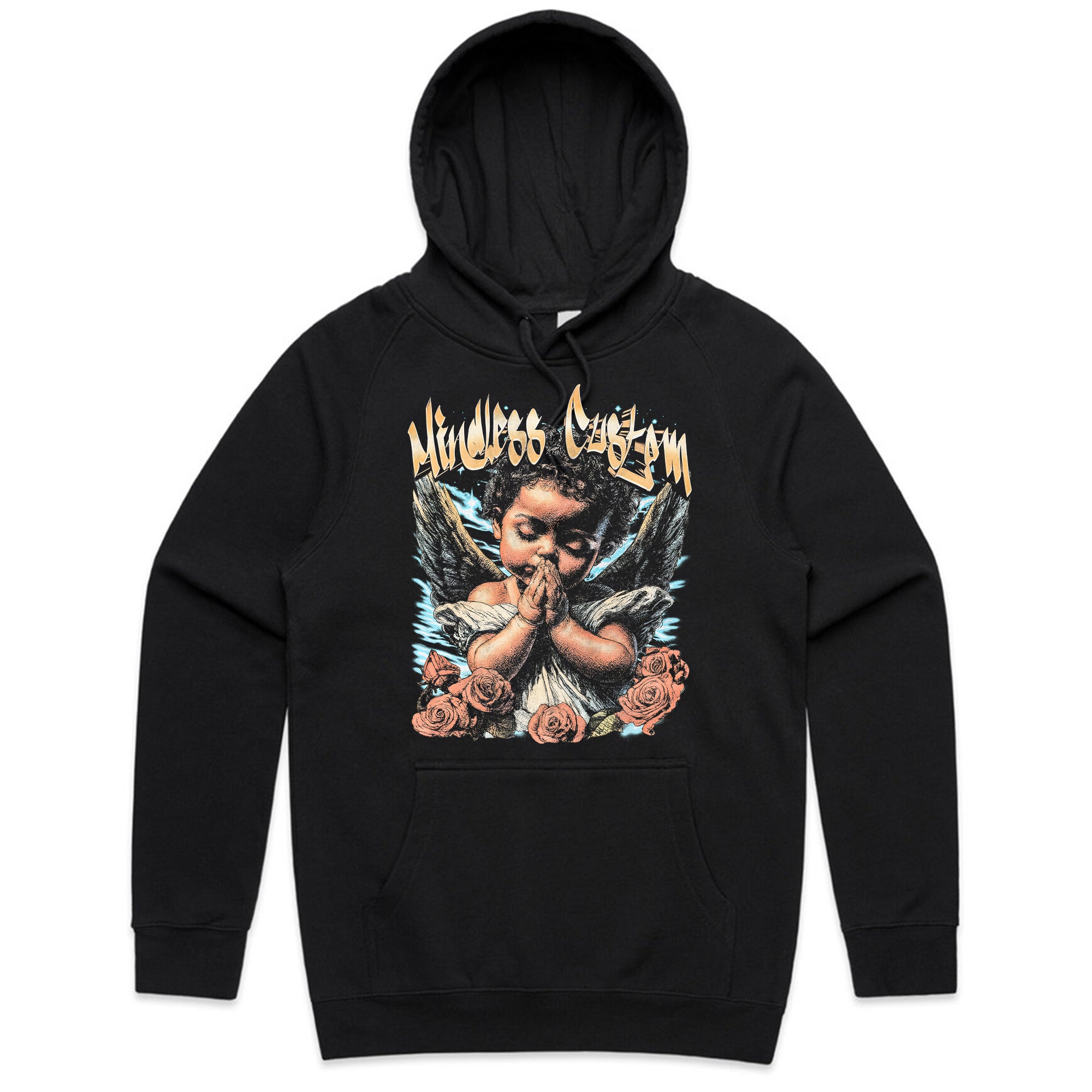 👼🌹 Pure innocence with a street edge. A powerful artwork of a praying angel surrounded by roses, paired with bold graffiti-style “Mindless Custom” lettering. This tee balances divine imagery with underground street culture, making it a unique statement piece.