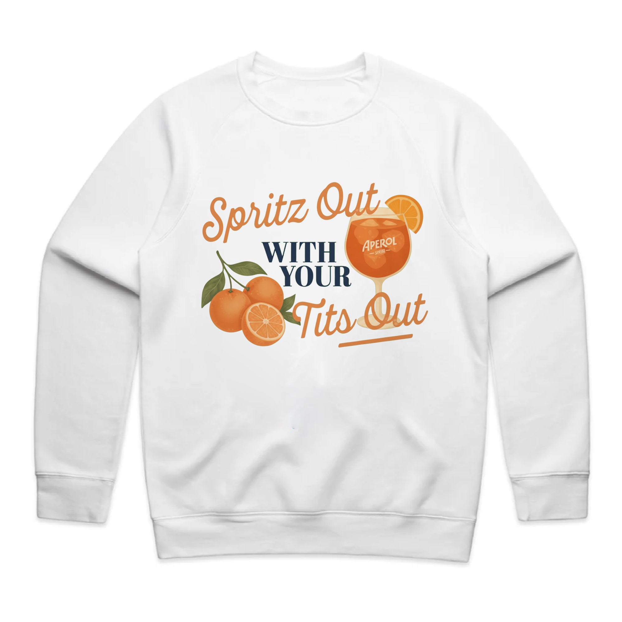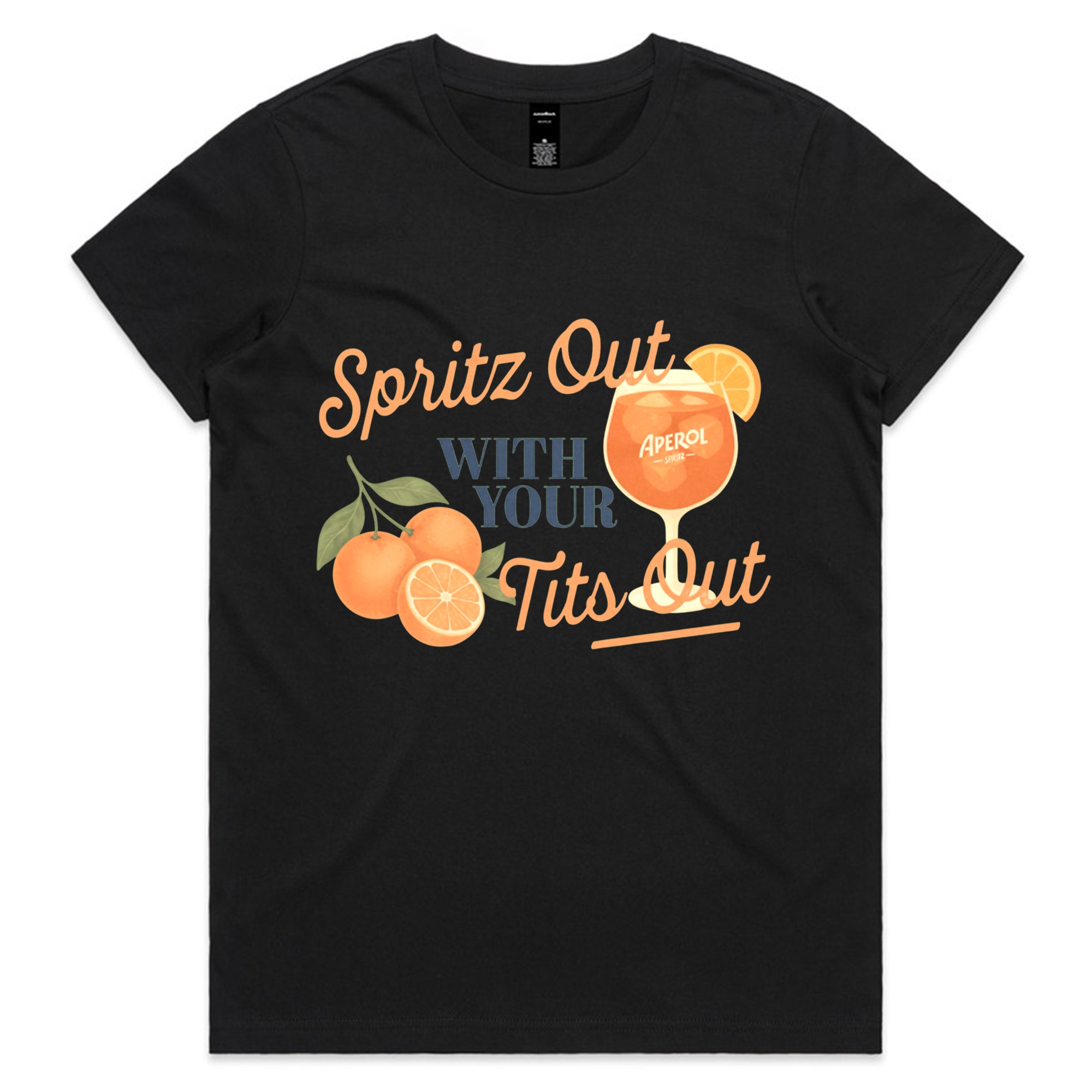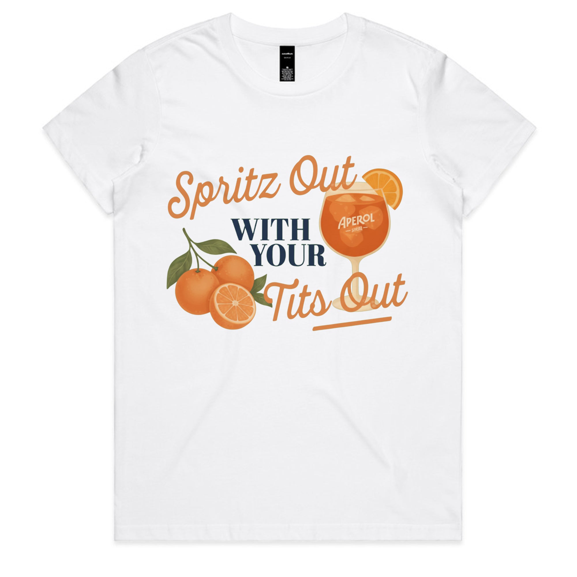 A white T-shirt featuring a vintage-inspired graphic of three oranges and a glass of Aperol Spritz.
