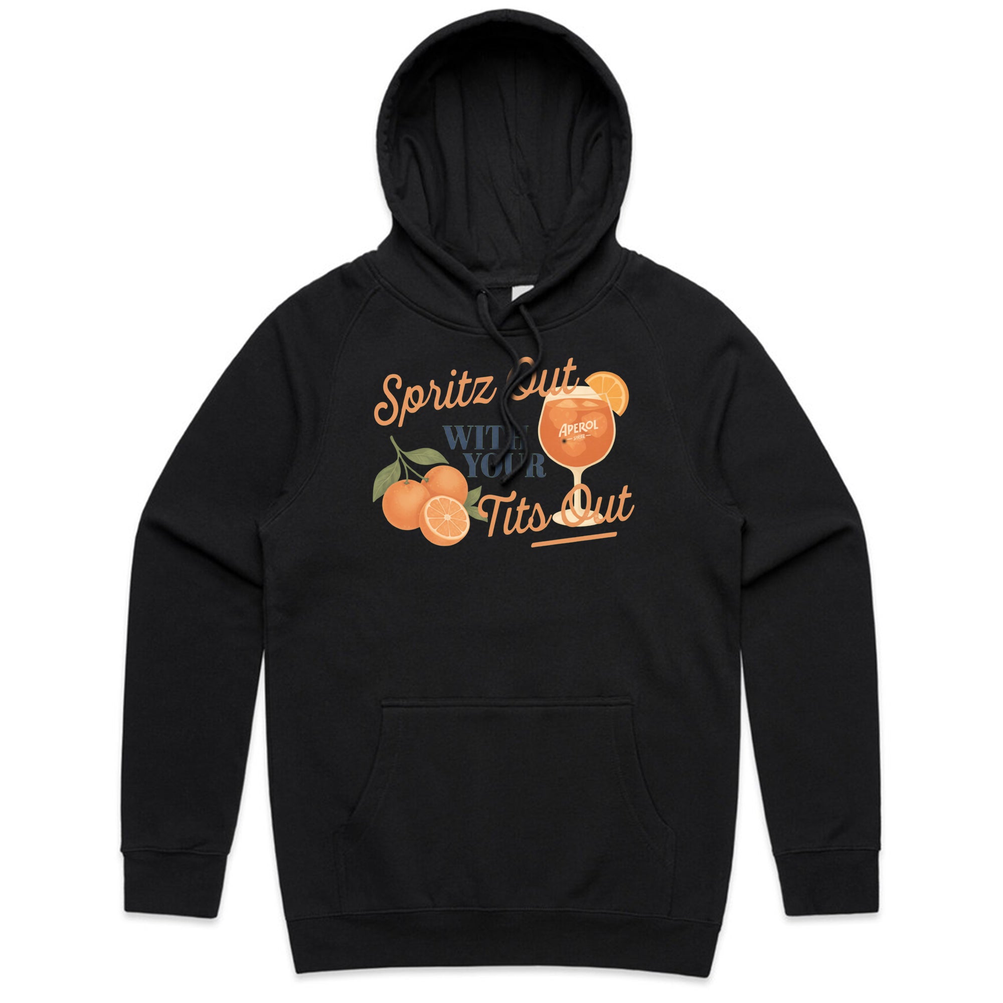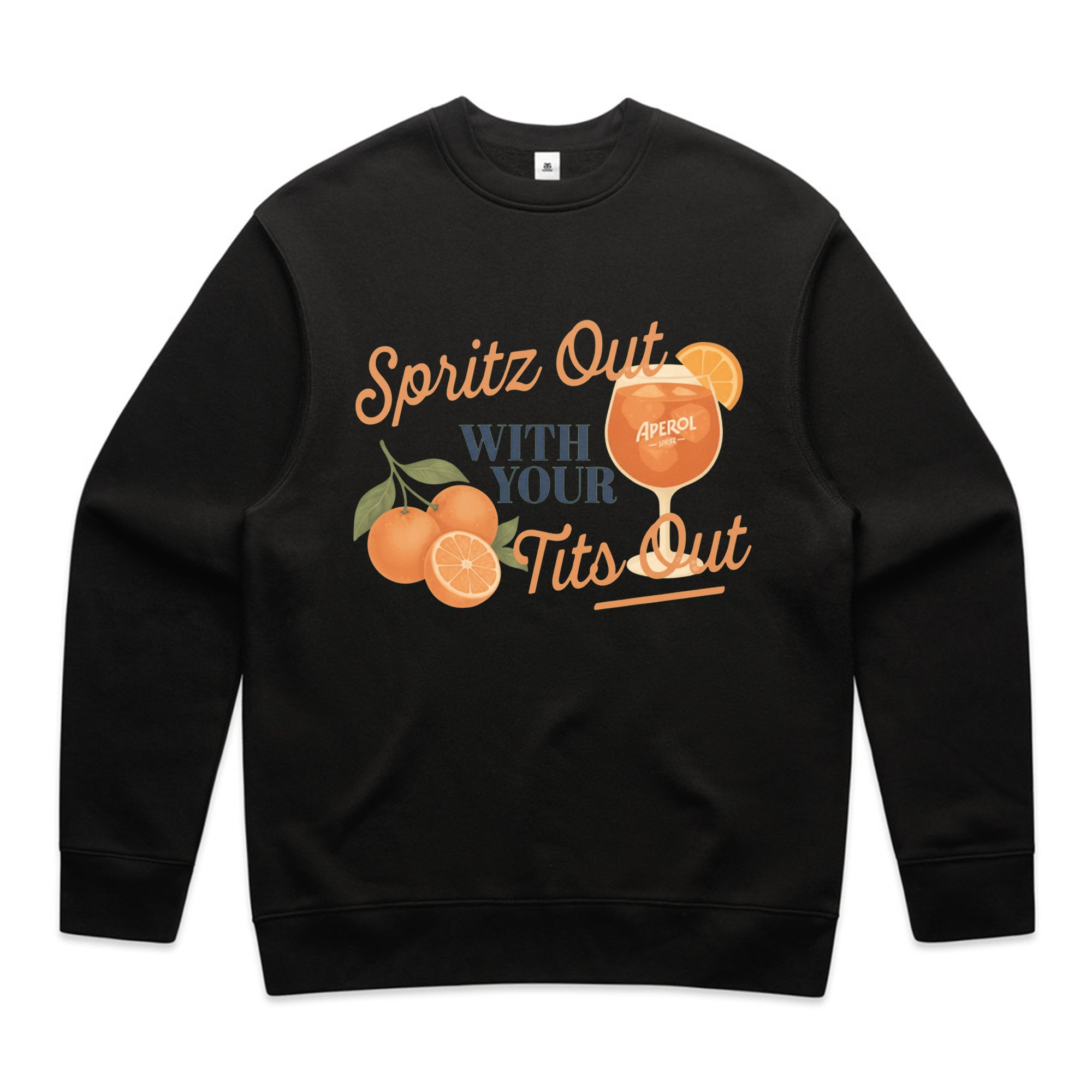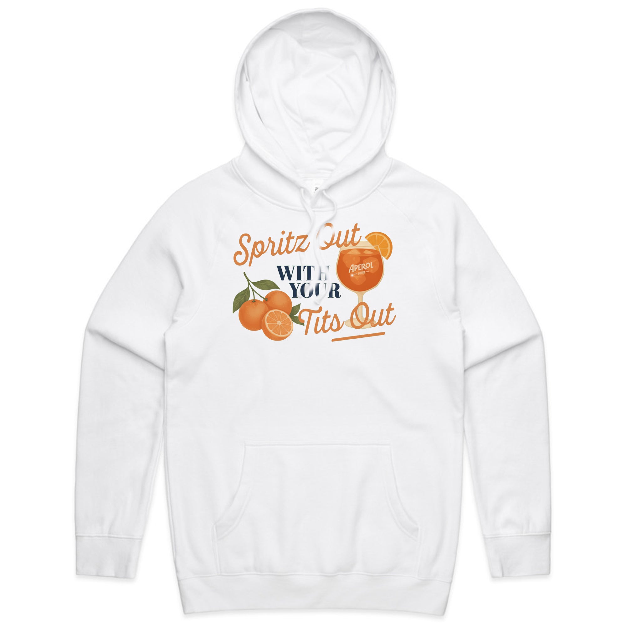 A white T-shirt featuring a vintage-inspired graphic of three oranges and a glass of Aperol Spritz.