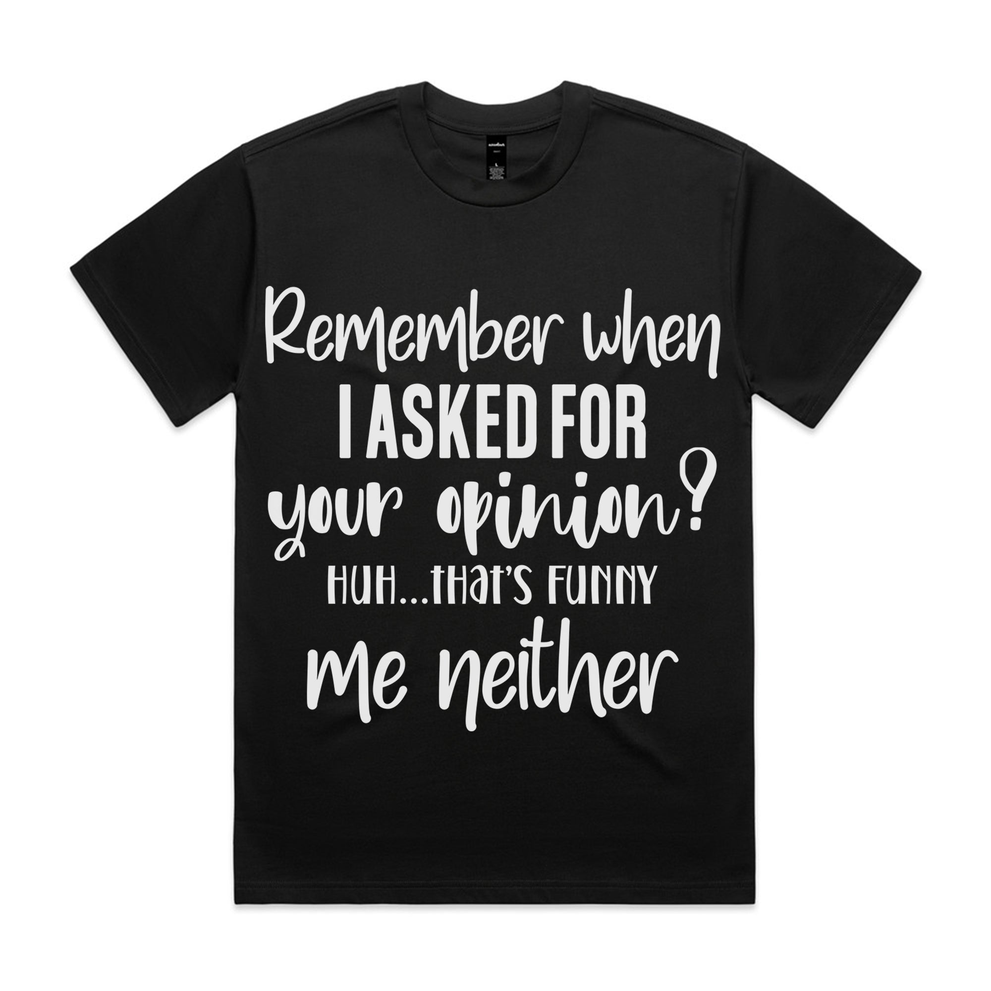 Bring the sass with this bold and hilarious graphic tee! Featuring the witty line “Remember when I asked for your opinion? Huh… that’s funny, me neither”, this shirt is perfect for anyone who loves sarcasm served with style.