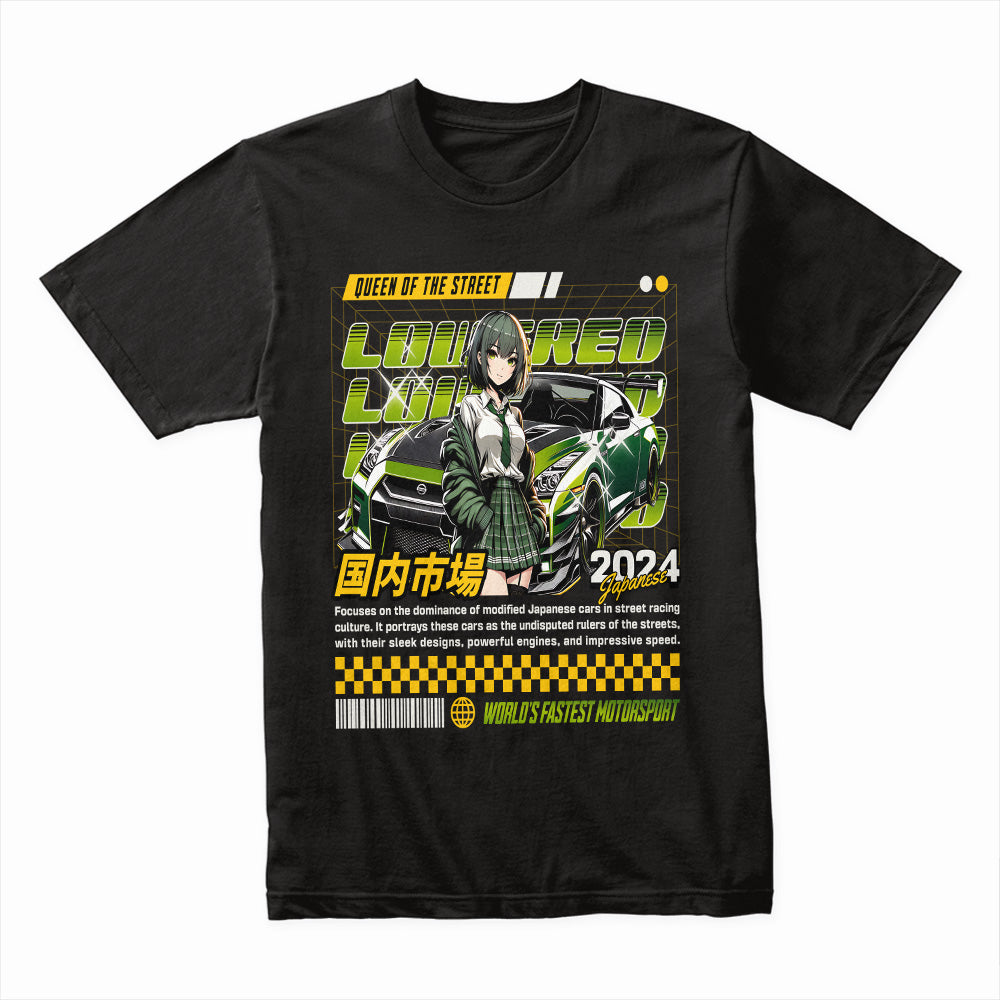 Own the streets with the Queen of the Street T-Shirt, where Japanese street racing meets anime culture. Featuring a fierce anime girl, a modified JDM car, and bold typography, this design captures the heart of modern street racing and otaku style.