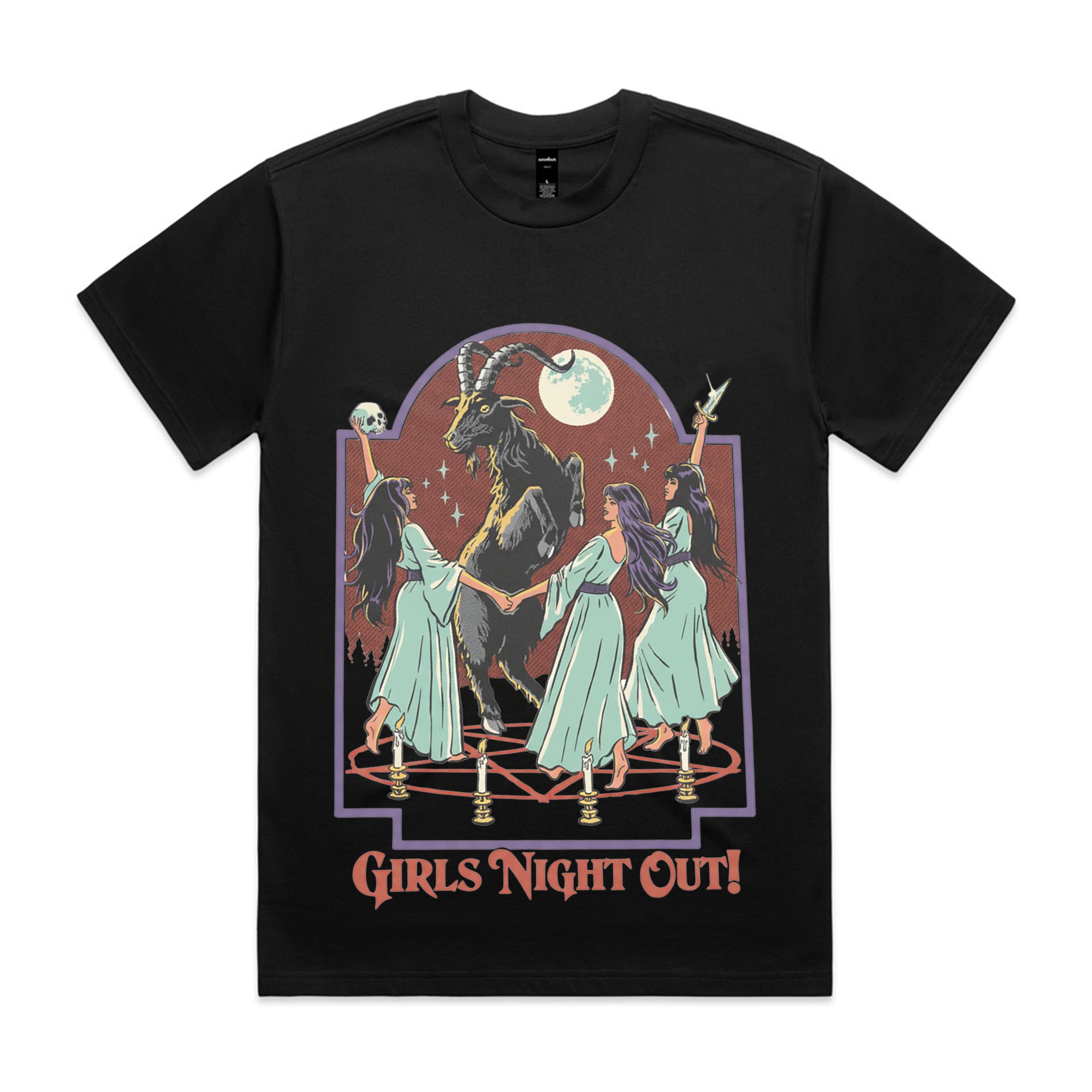 Witches unite! Three women dance around a demonic goat under a full moon surrounded by candles and skulls. The caption “Girls Night Out!” gives this occult scene a cheeky, sisterhood twist. Equal parts spooky and empowering.