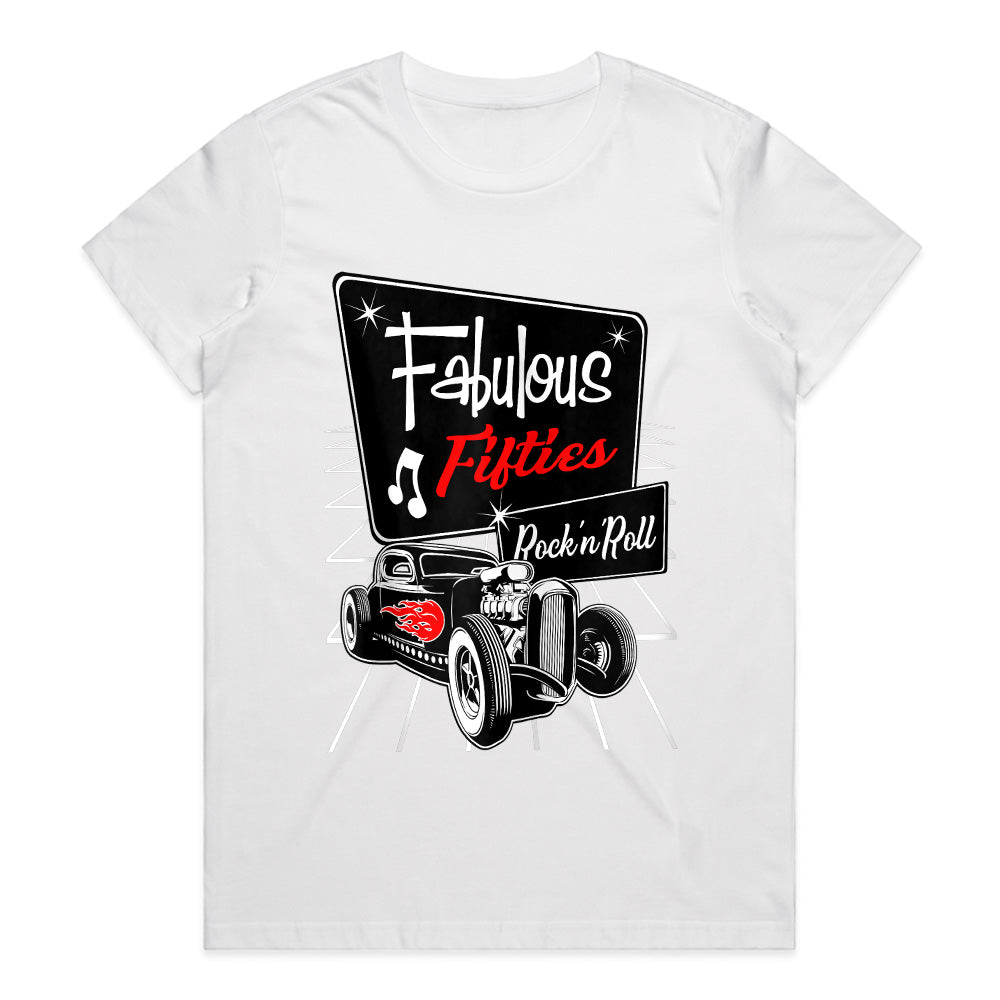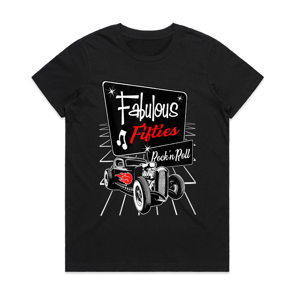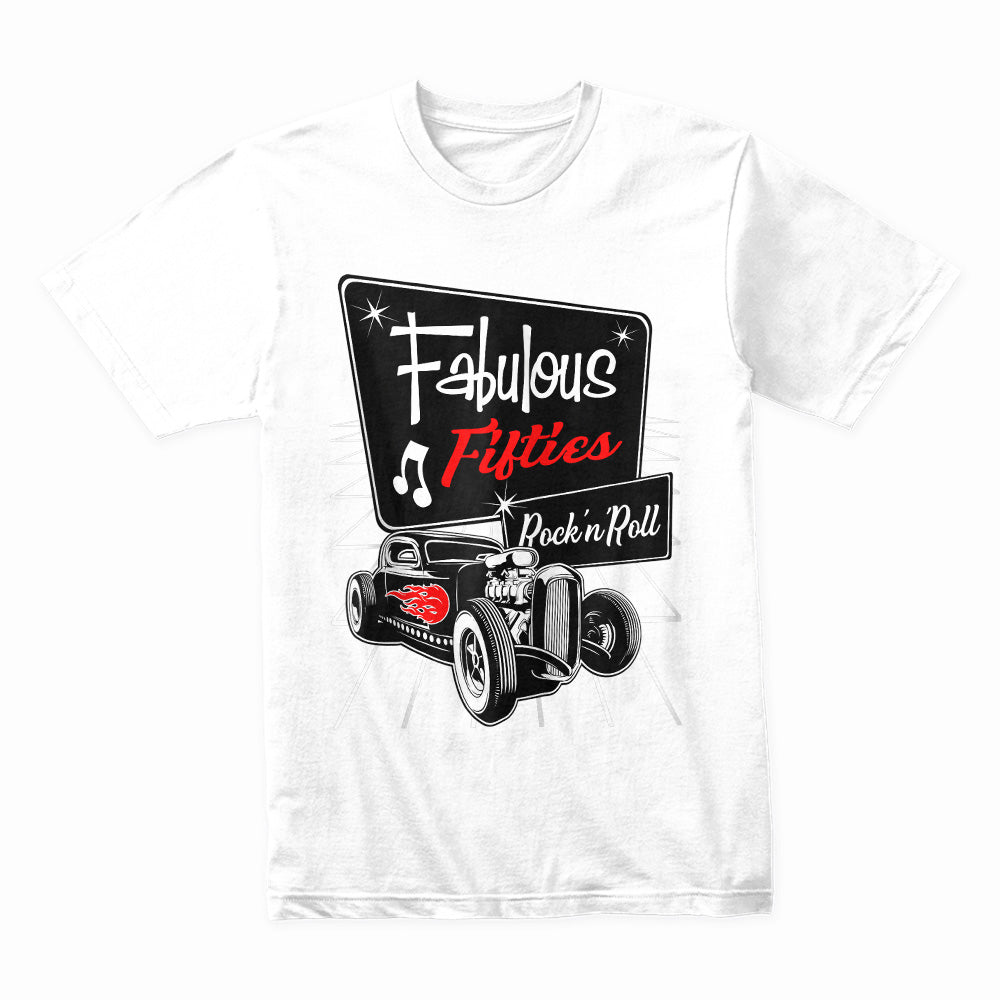 Step into the iconic era of the 1950s with this Fabulous Fifties Rock 'n Roll T-Shirt! Featuring a classic vintage hot rod with flame details, a retro diner-style sign, and nostalgic music notes, this design embodies the golden age of rockabilly culture, sock hops, and old-school car cruising.
