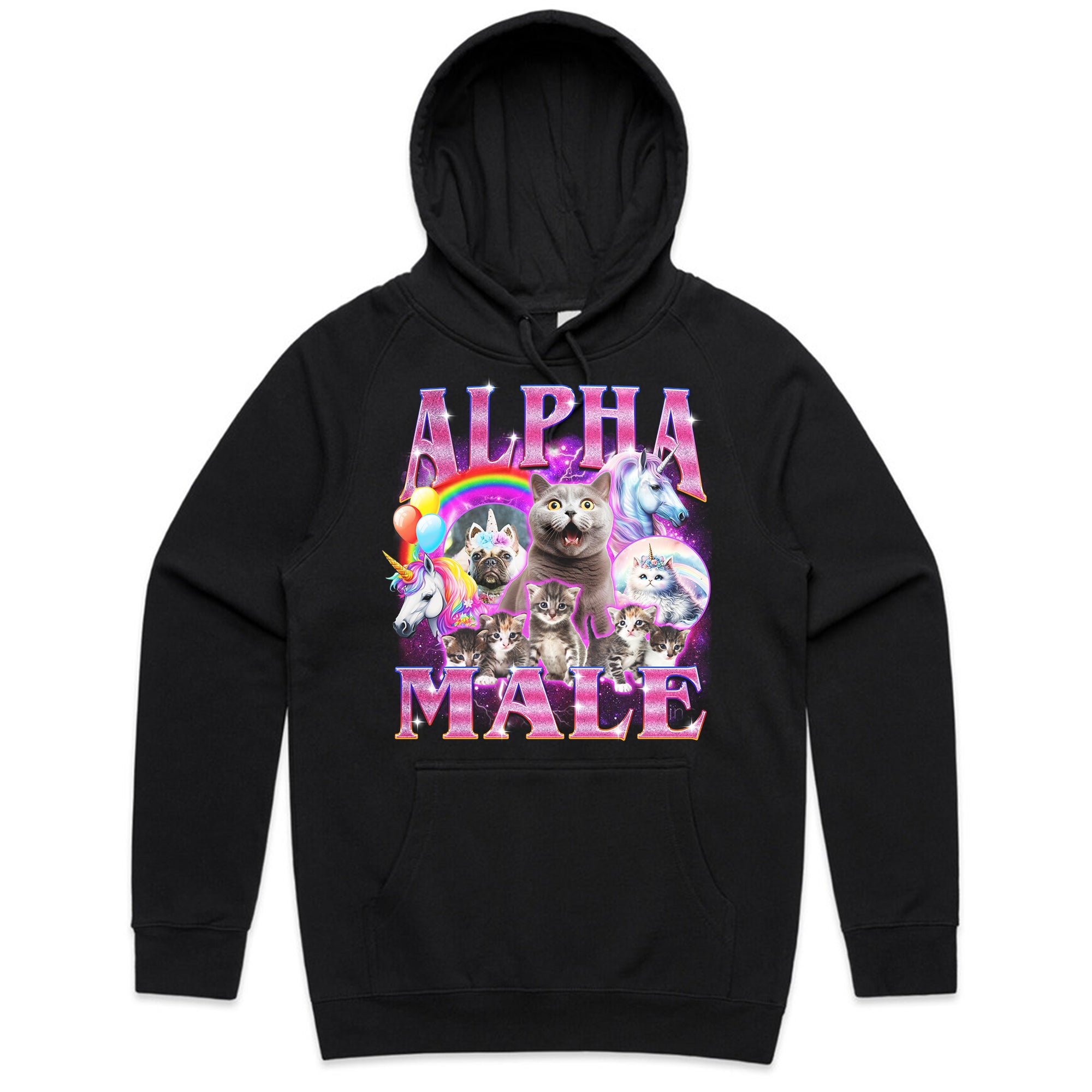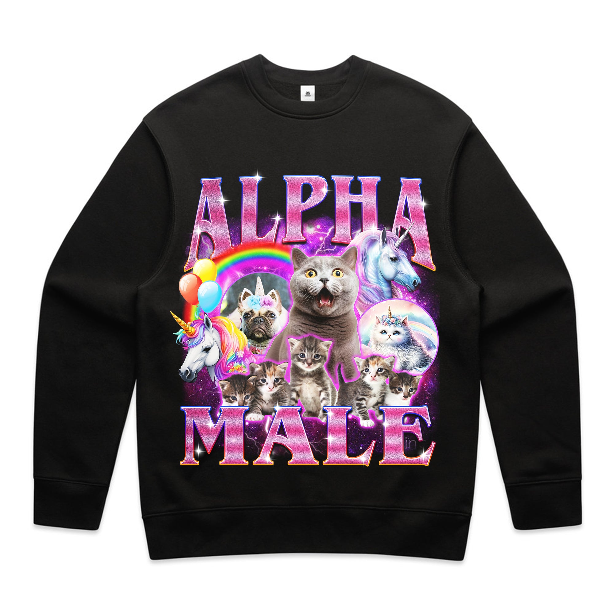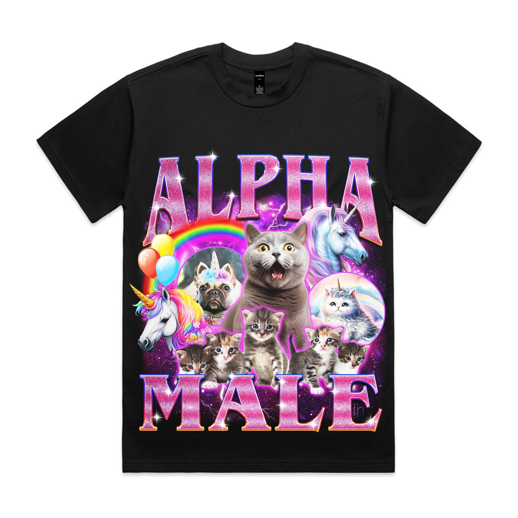 Unleash your playful side with the Alpha Male Graphic Tee. Featuring an over-the-top mix of cats, dogs, unicorns, rainbows, and cosmic vibes, this shirt blends humor with bold attitude. Perfect for anyone who loves irony, fun designs, and standing out in the crowd.