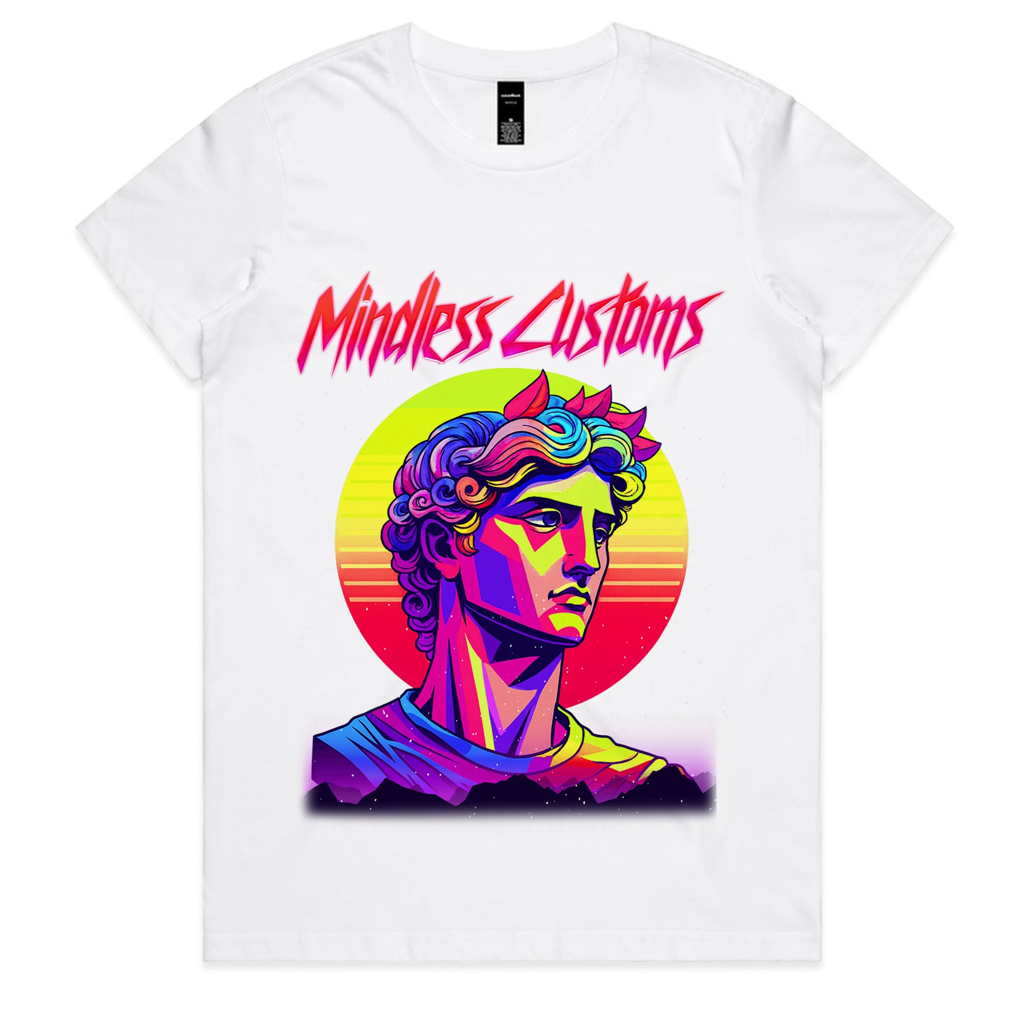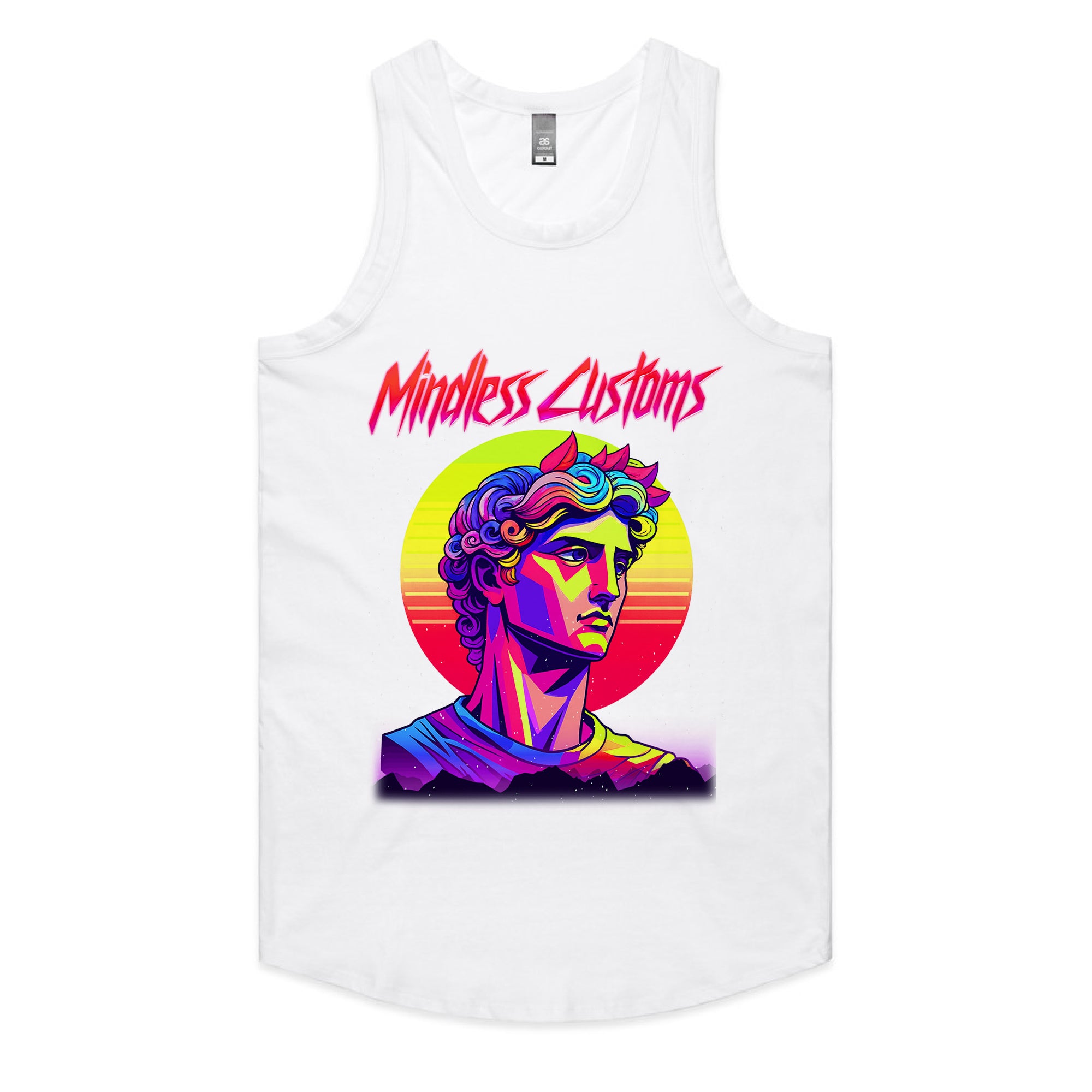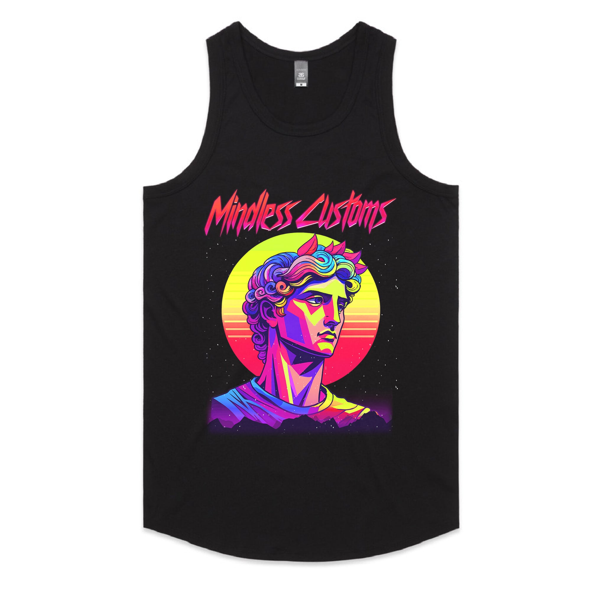 Channel retro vibes with this striking design. Featuring a neon-colored statue bust set against a glowing sunset backdrop, this tank celebrates art, rebellion, and bold individuality.