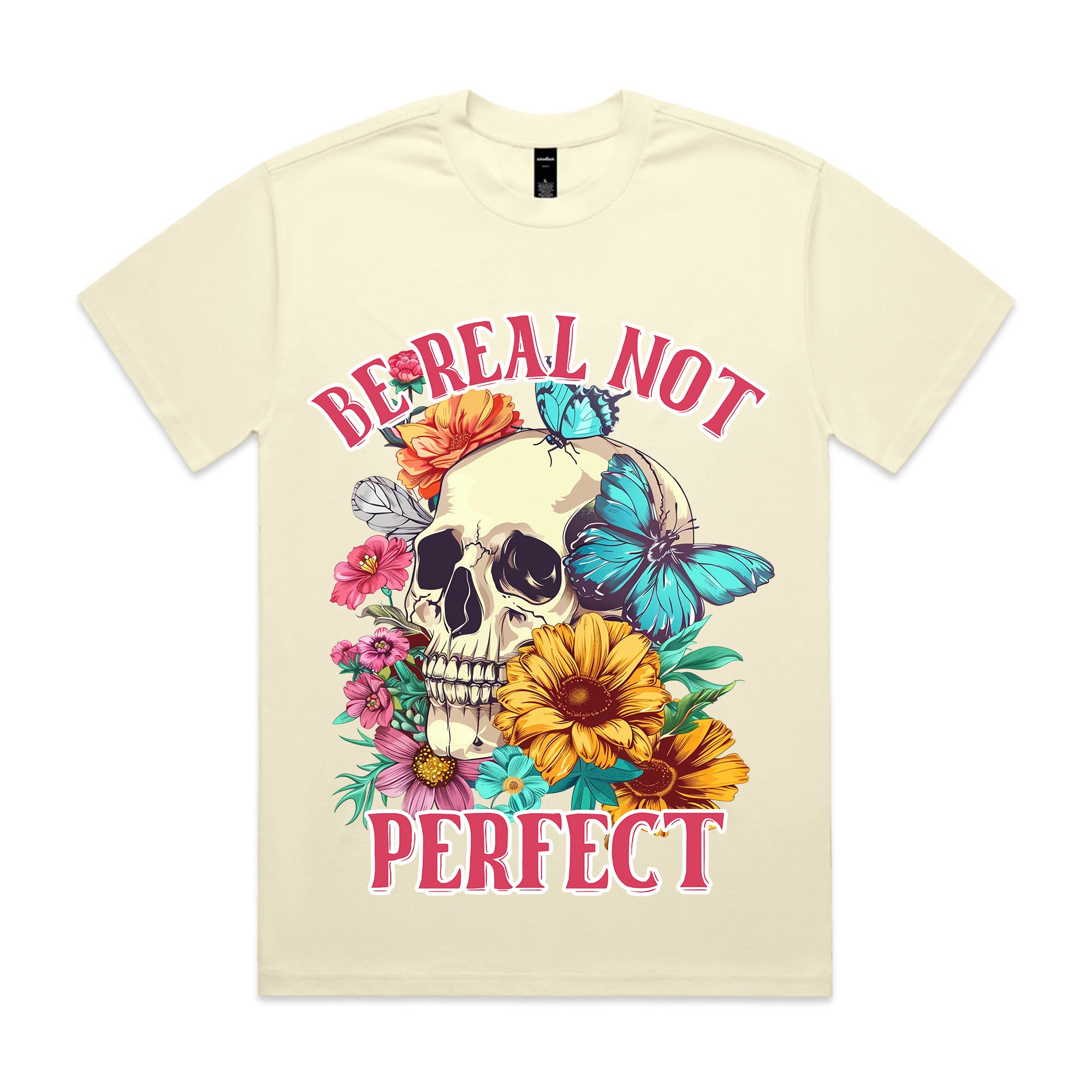 With a bold skull centerpiece surrounded by vibrant flowers and fluttering butterflies, this design blends edgy art with an uplifting life message – perfect for those who embrace authenticity over perfection.