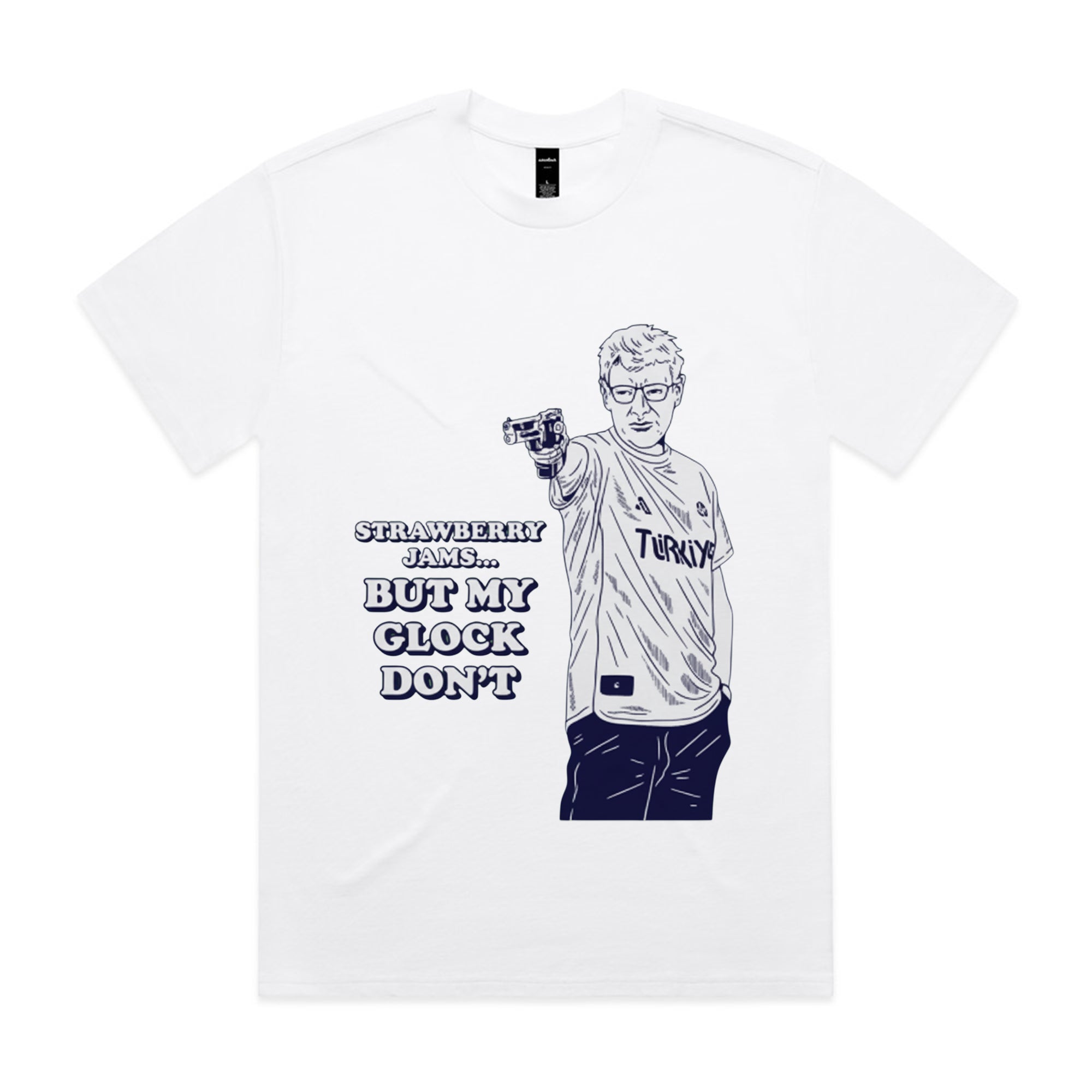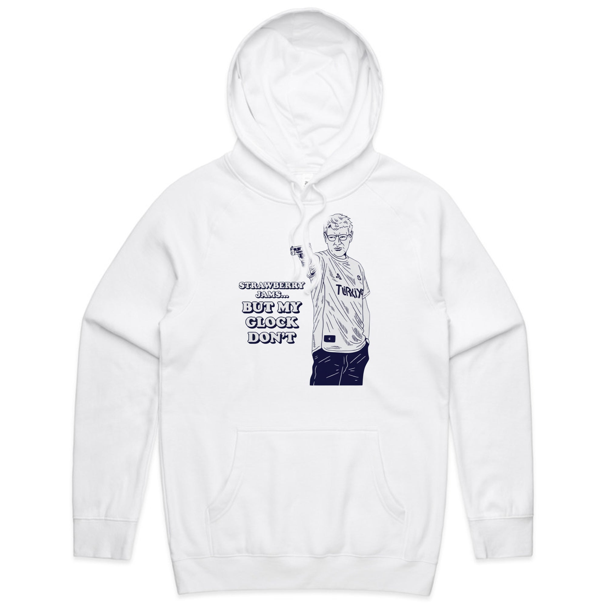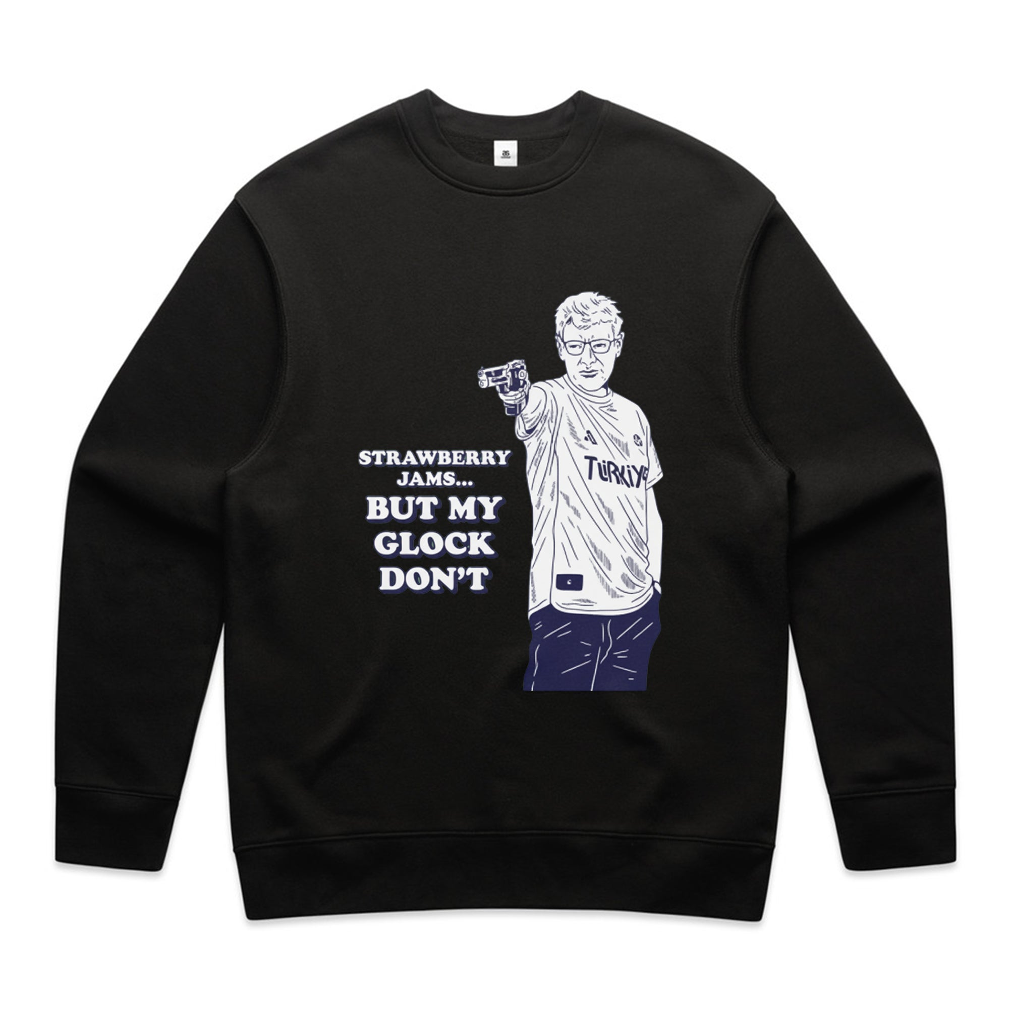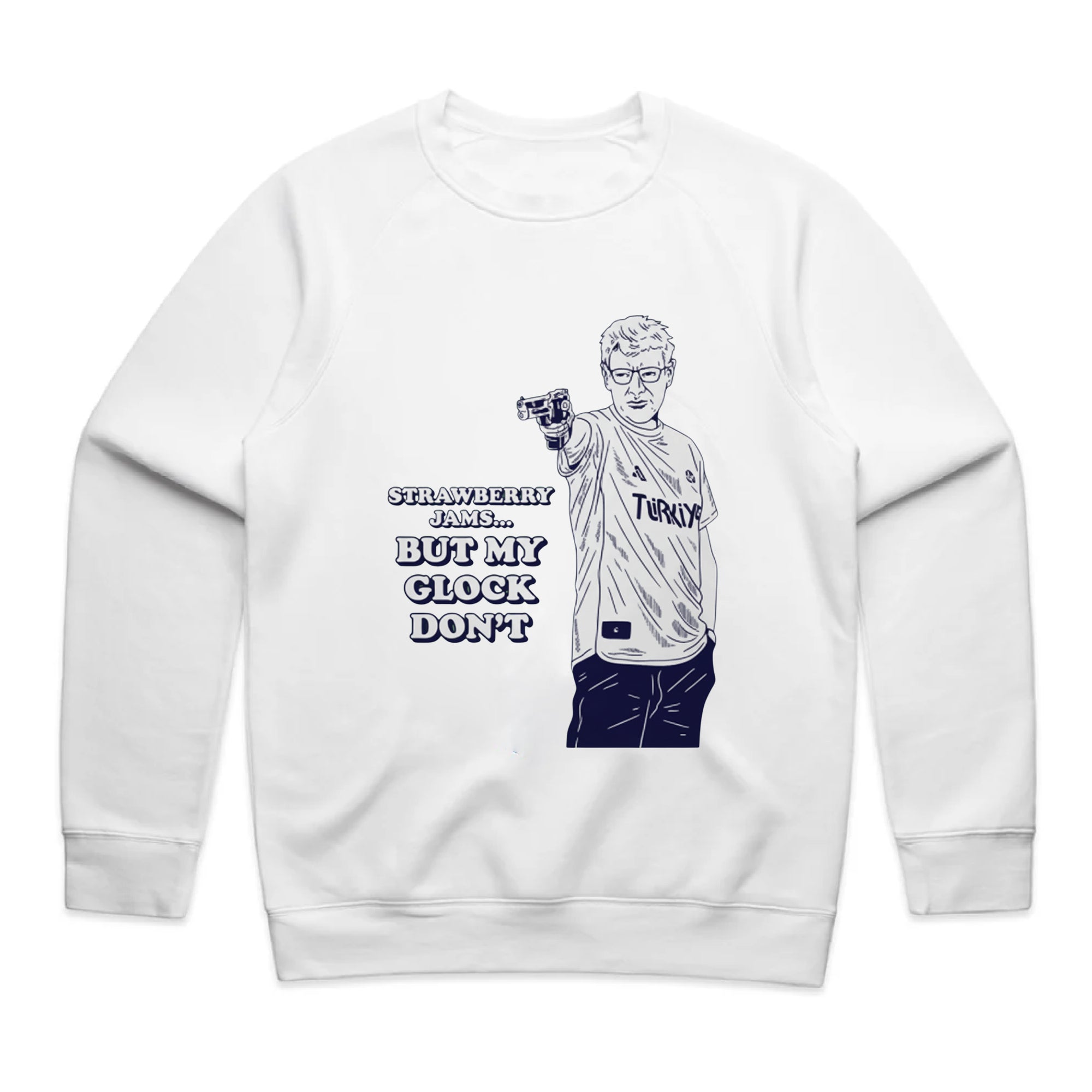A white sweatshirt featuring a navy blue line-art illustration of the famous Turkish Olympic shooter, Yusuf Dikeç, in his iconic casual shooting pose.