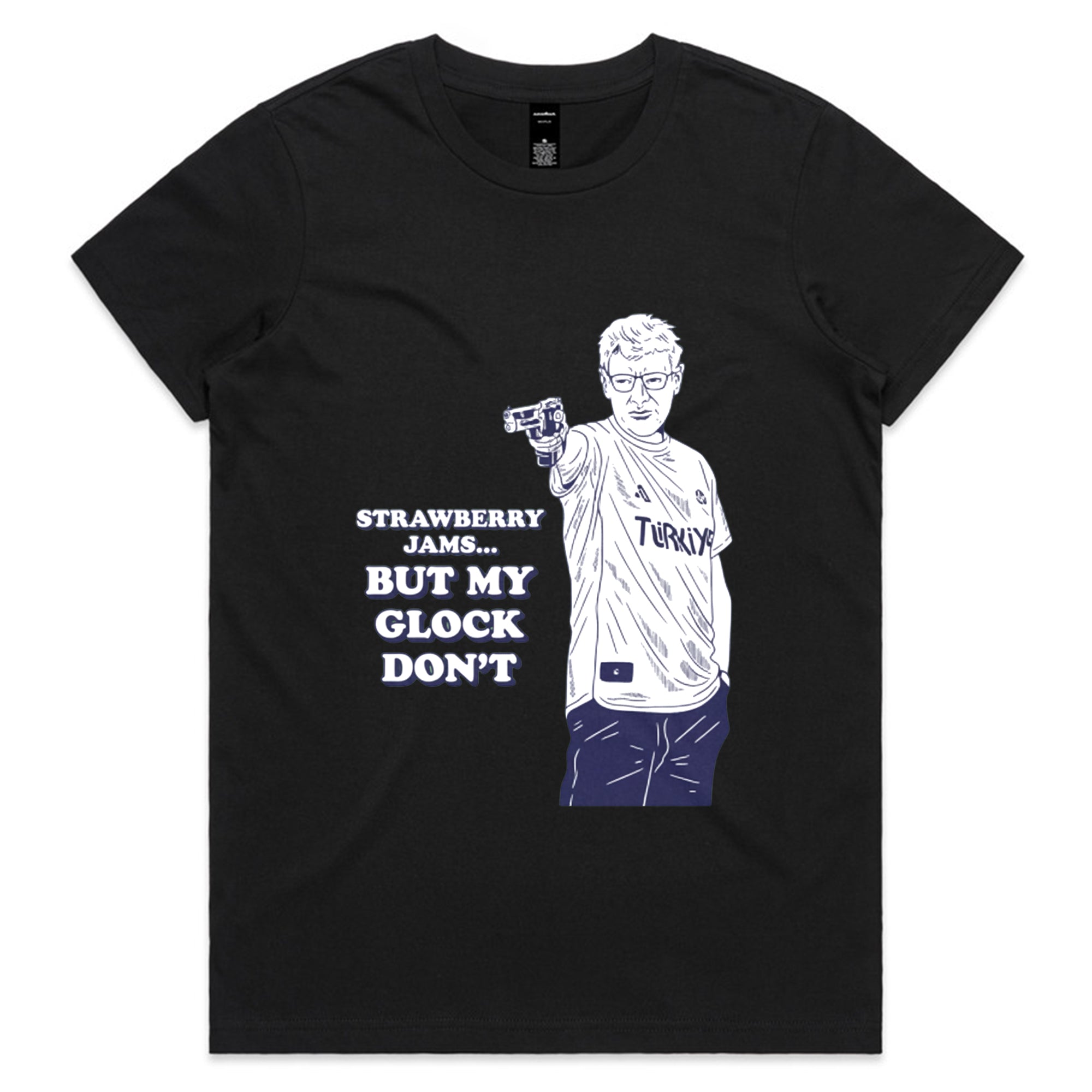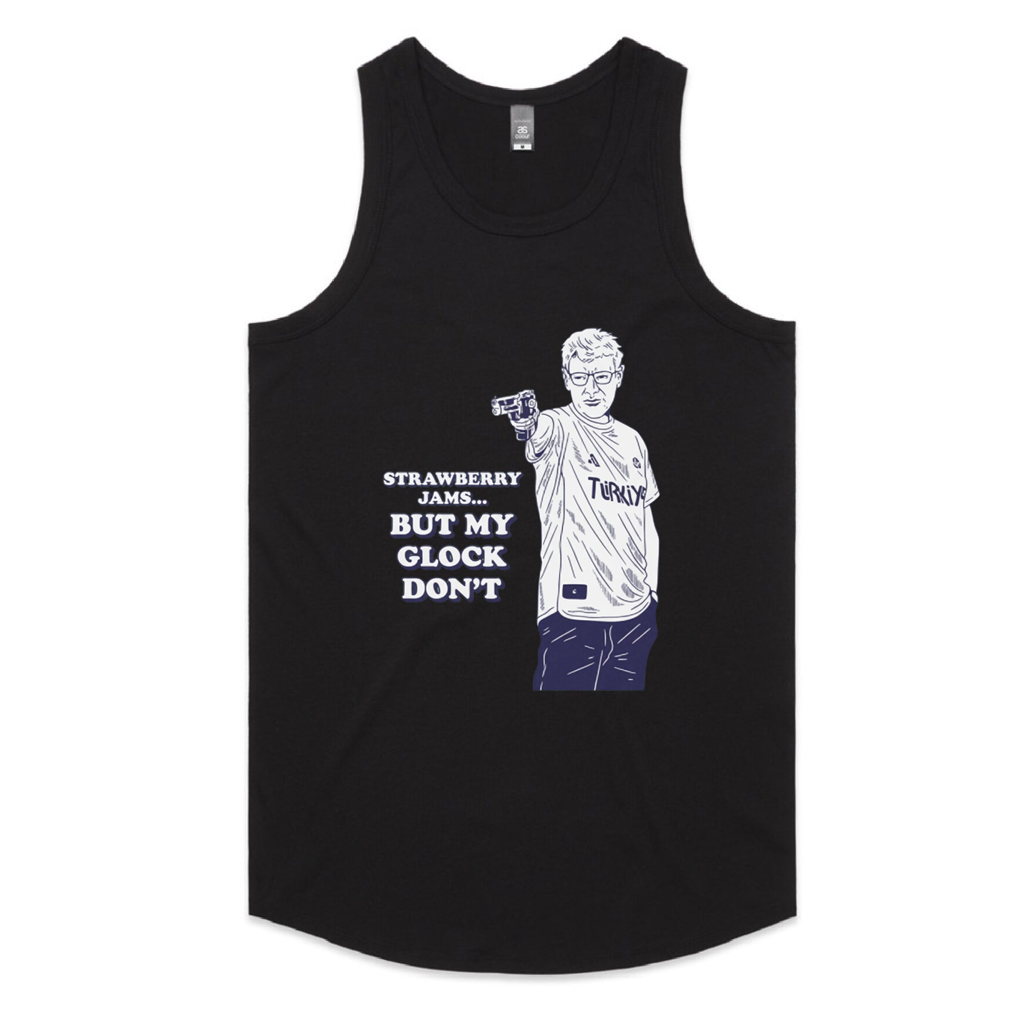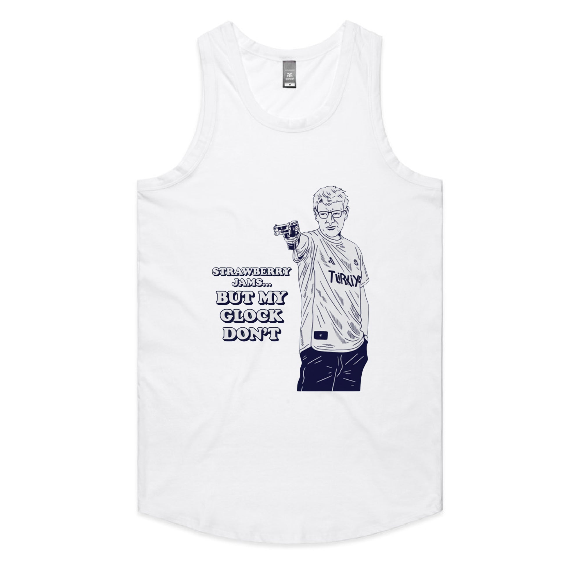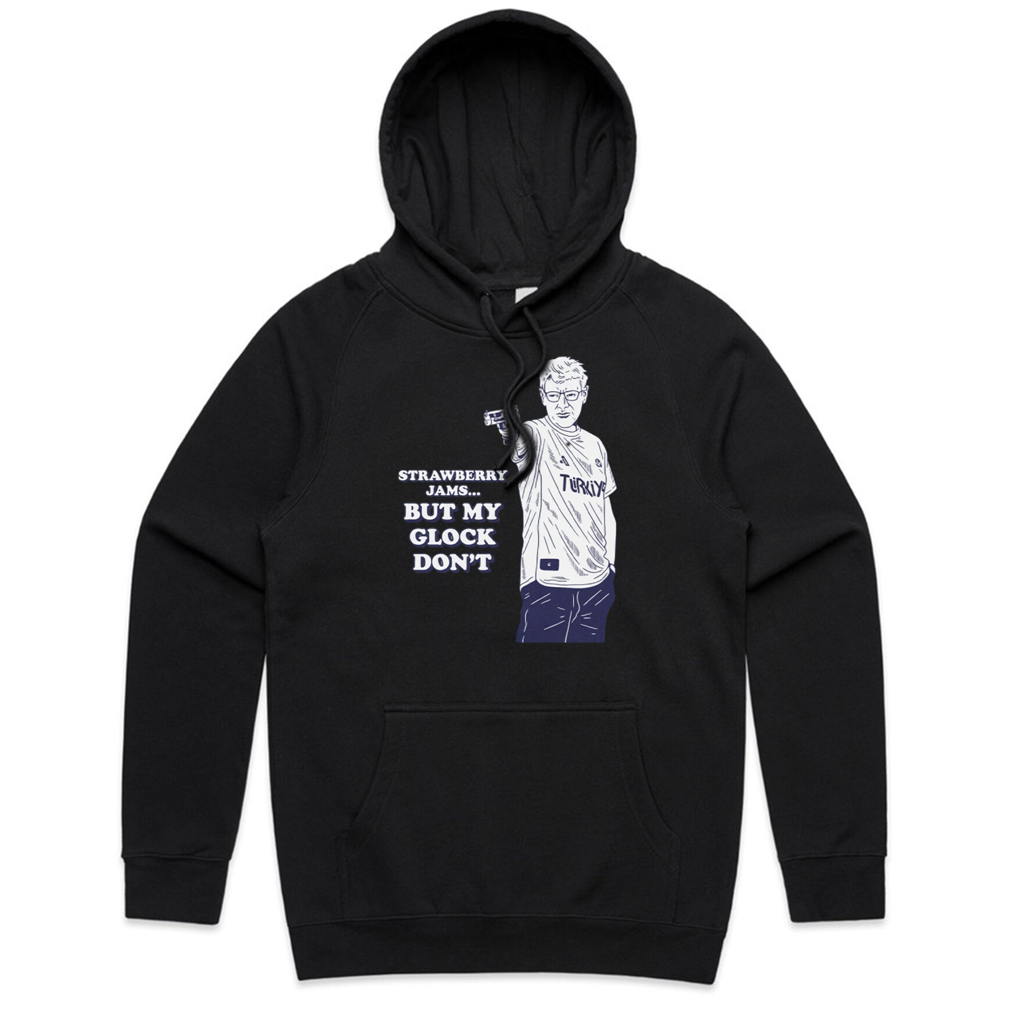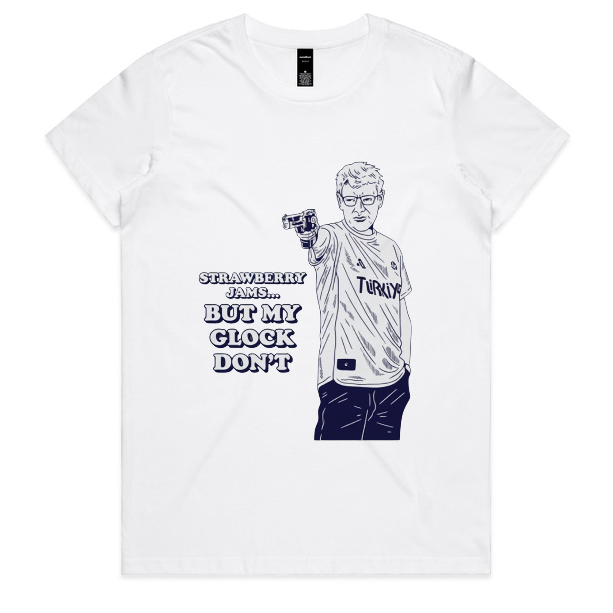 A white sweatshirt featuring a navy blue line-art illustration of the famous Turkish Olympic shooter, Yusuf Dikeç, in his iconic casual shooting pose.
