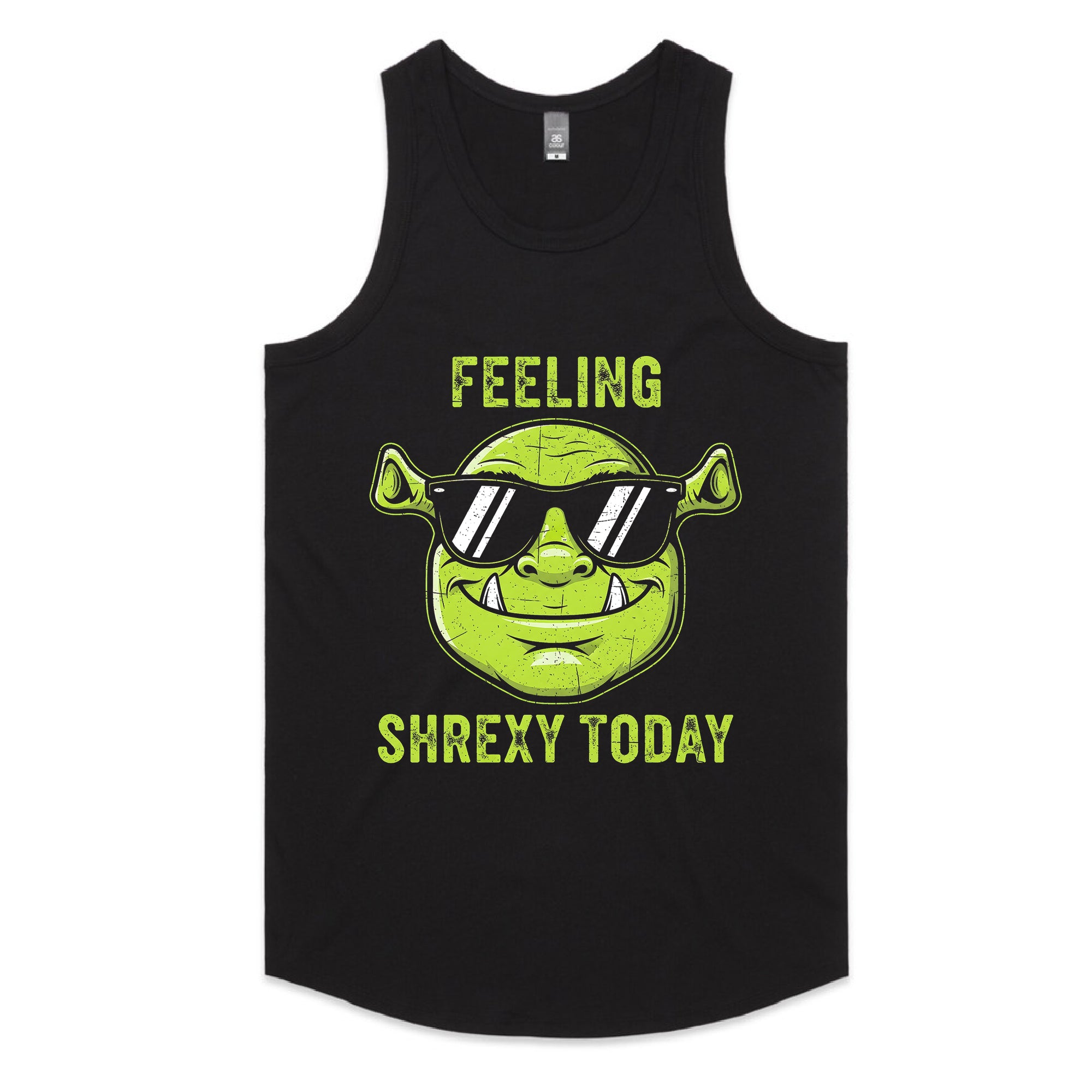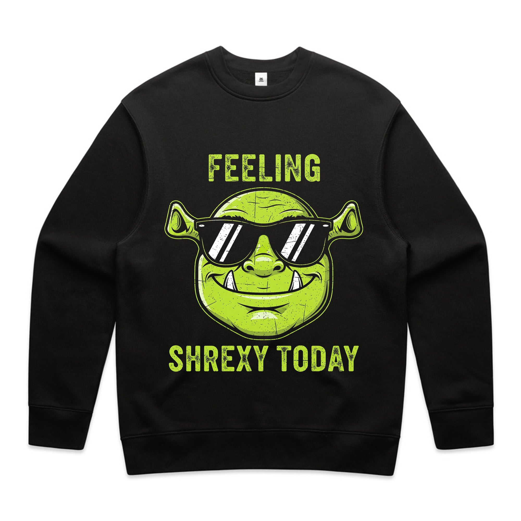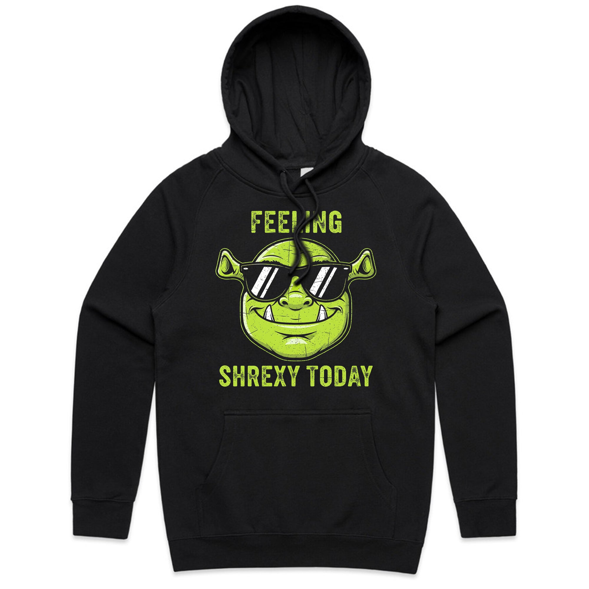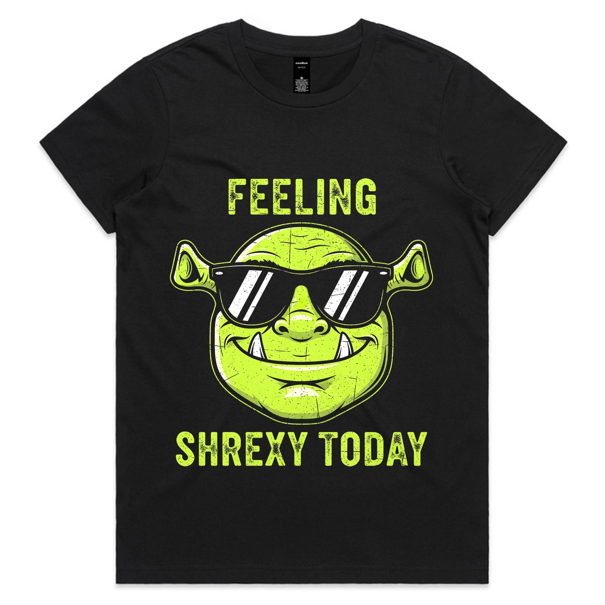 A fun parody design featuring a large green ogre face wearing cool sunglasses, smiling confidently. The text “Feeling Shrexy Today” plays on the word “sexy,” making it a humorous and lighthearted piece for pop culture fans.