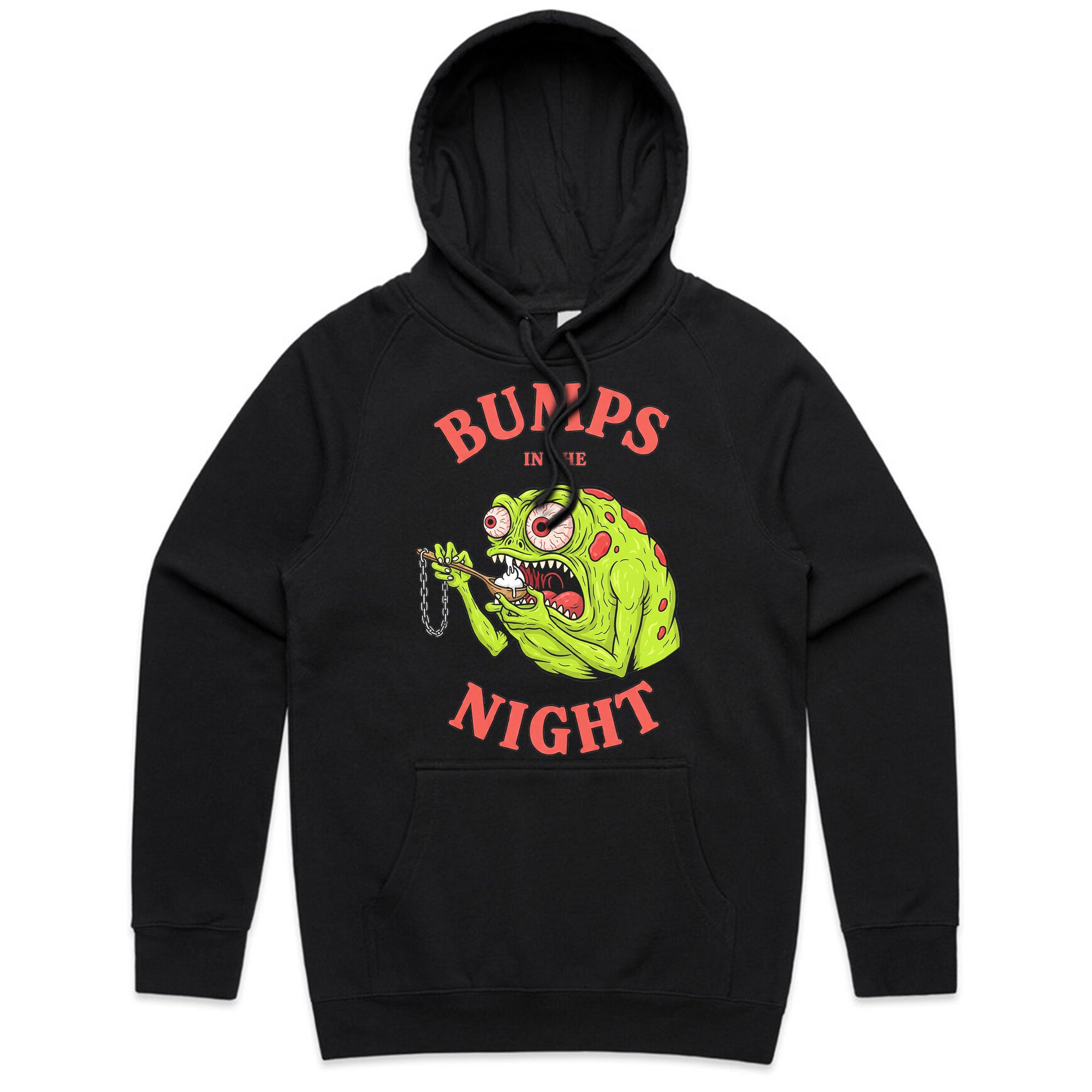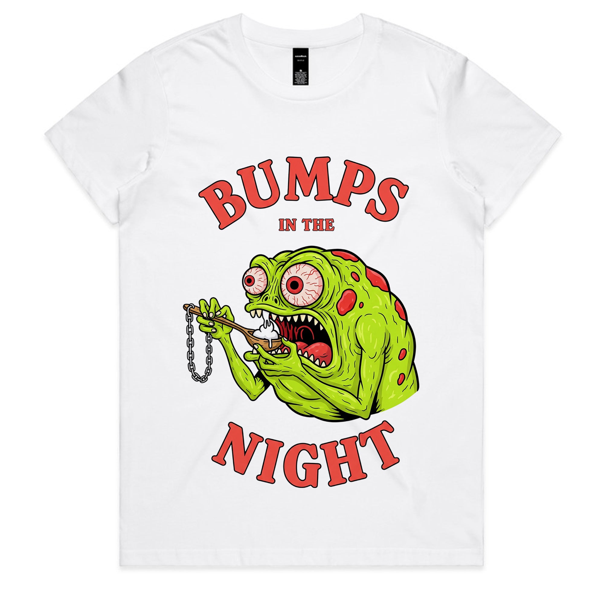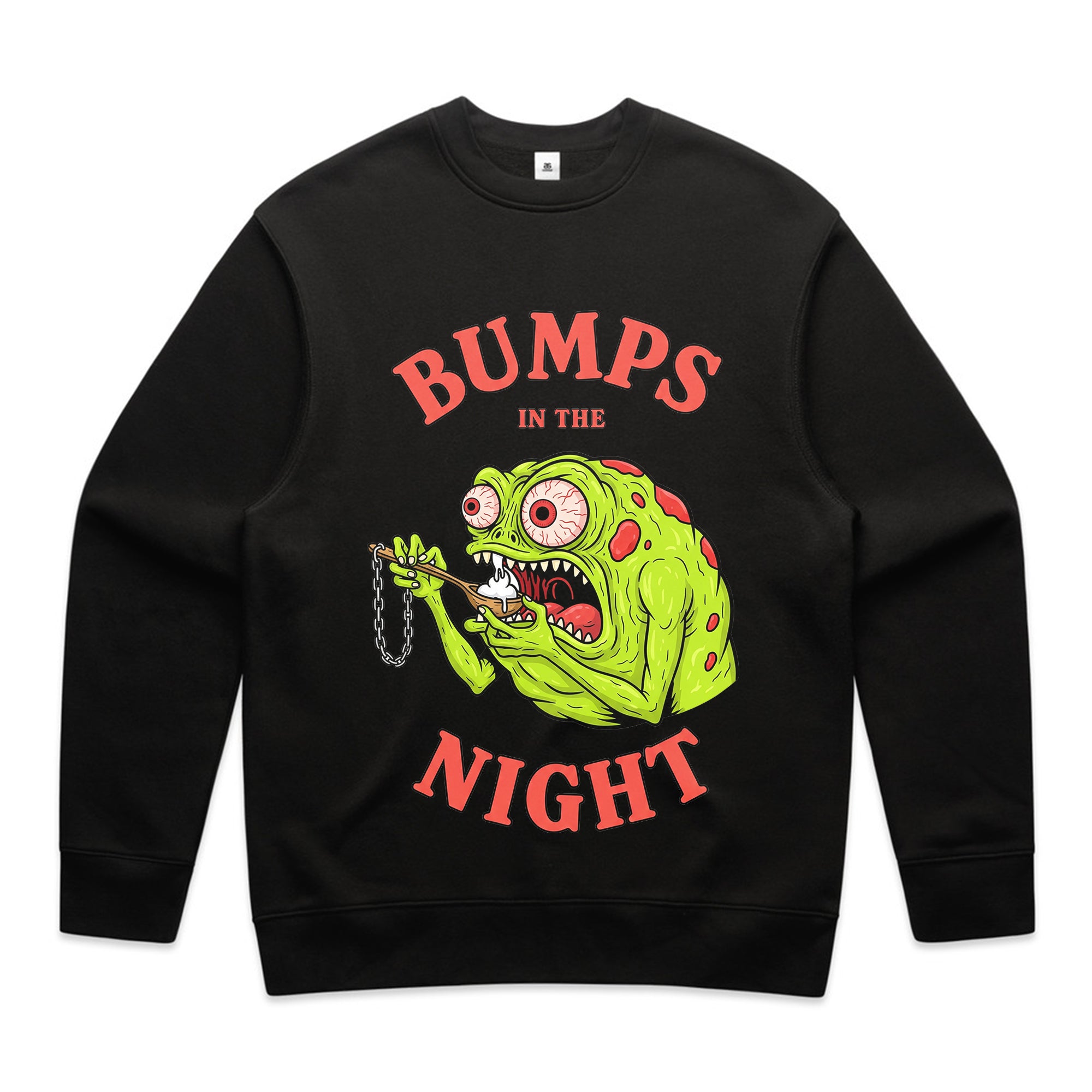 This black T-shirt features a wild and colorful cartoon creature with bulging eyes and a manic expression. The phrase “Bumps in the Night” arches above and below the character in bold red lettering, giving it a chaotic, underground vibe.