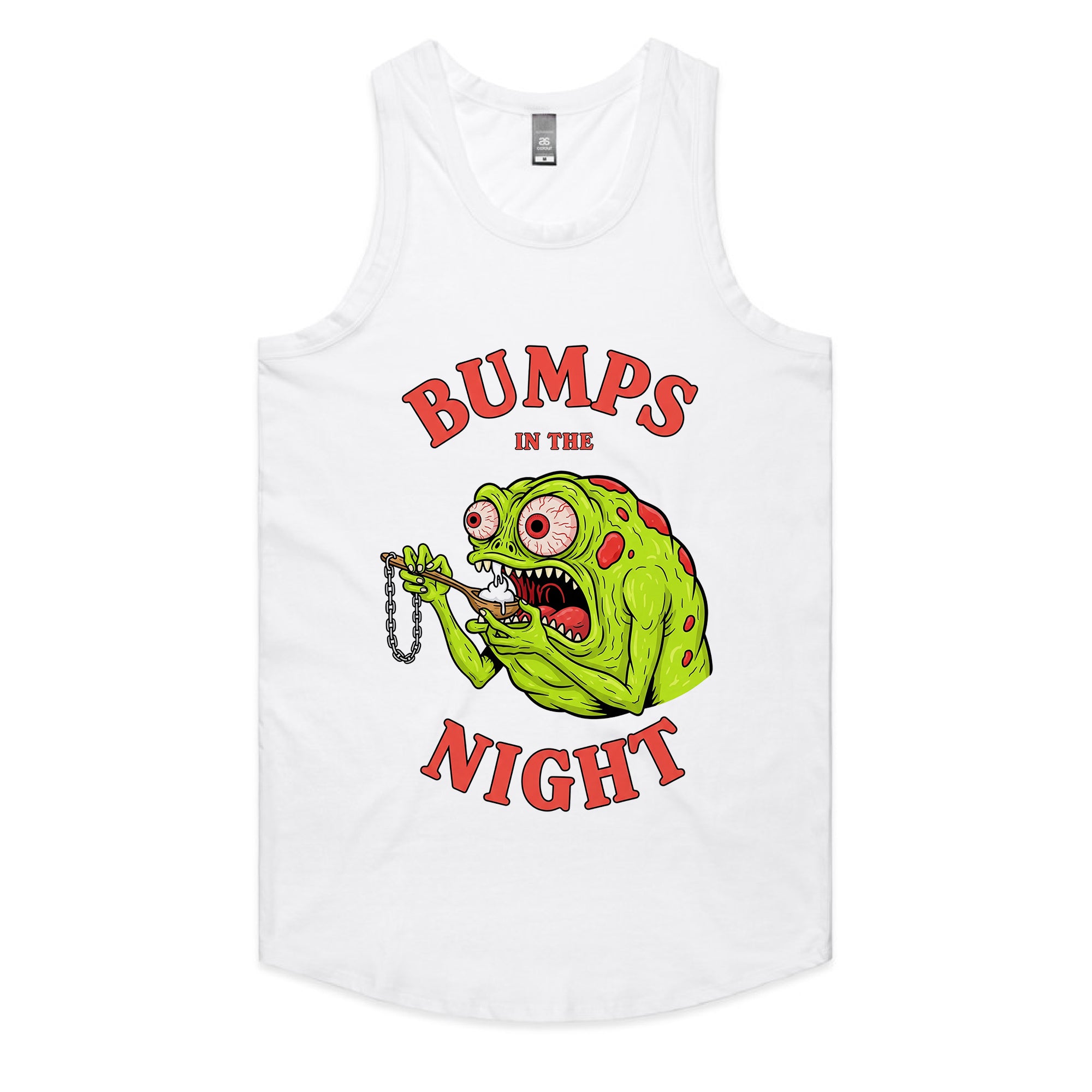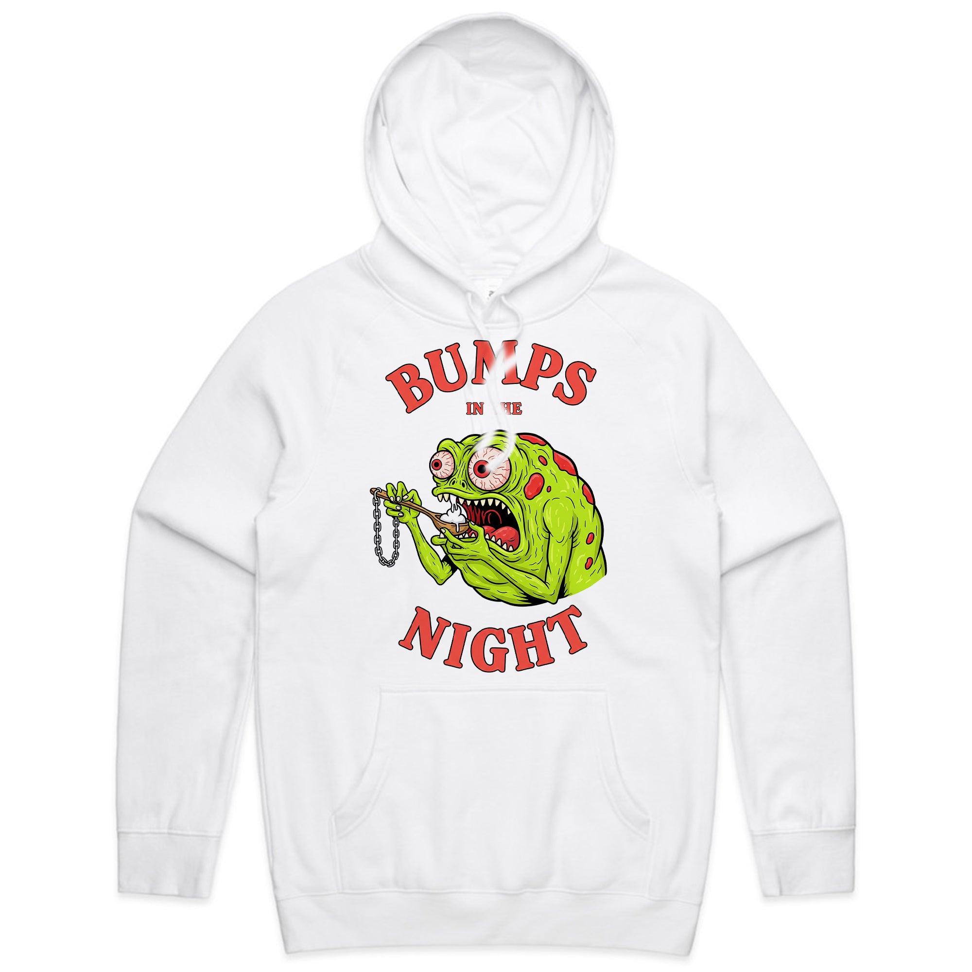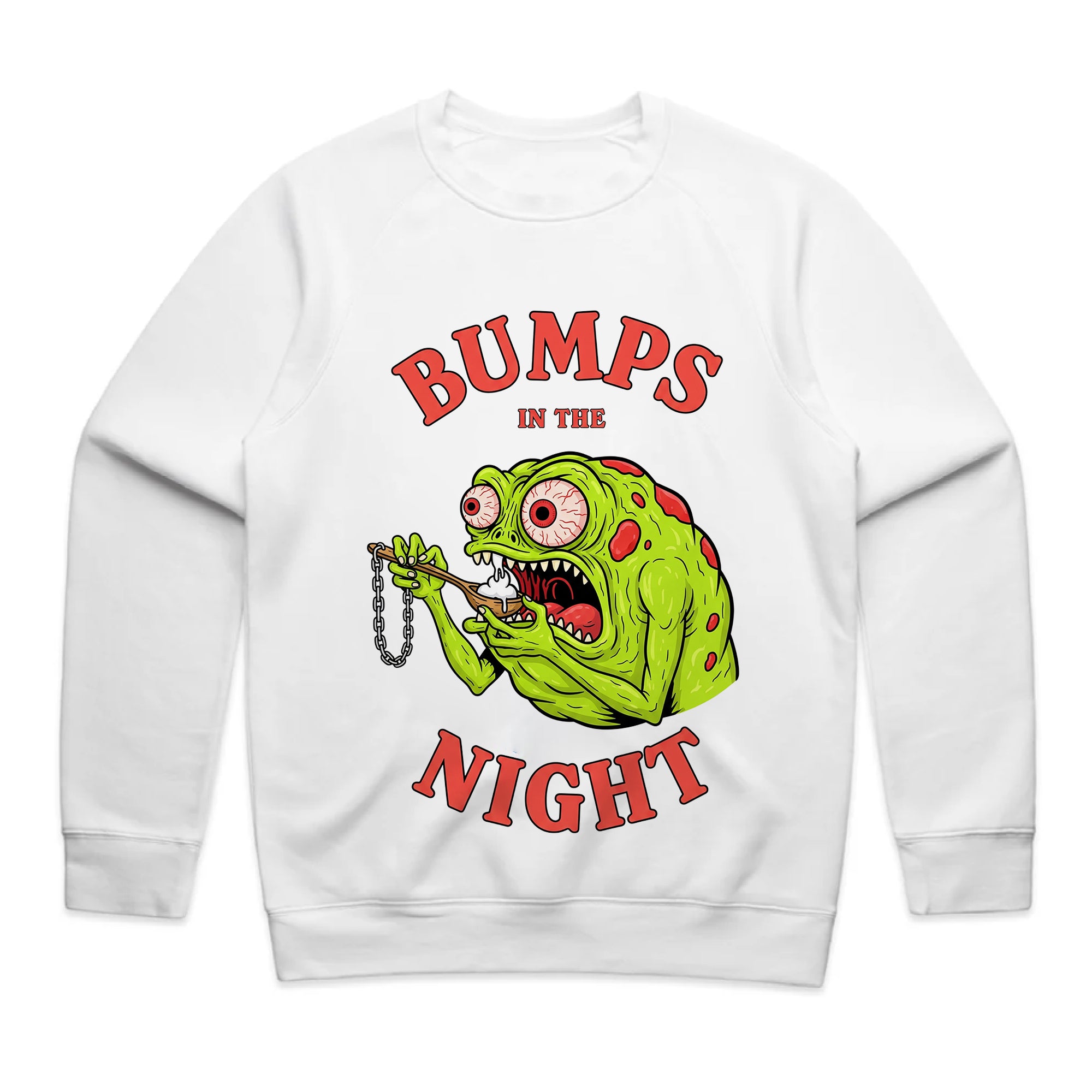 This black T-shirt features a wild and colorful cartoon creature with bulging eyes and a manic expression. The phrase “Bumps in the Night” arches above and below the character in bold red lettering, giving it a chaotic, underground vibe.