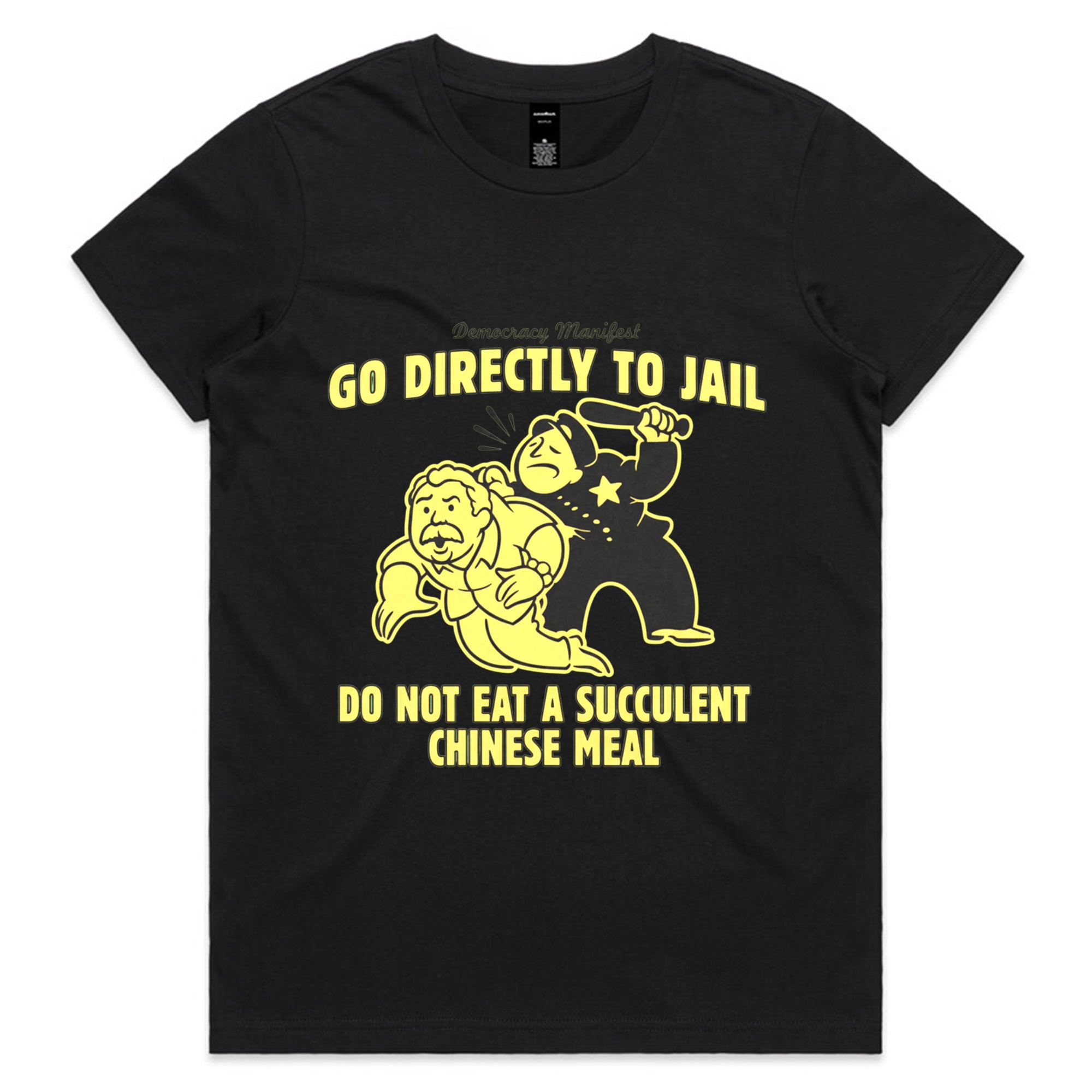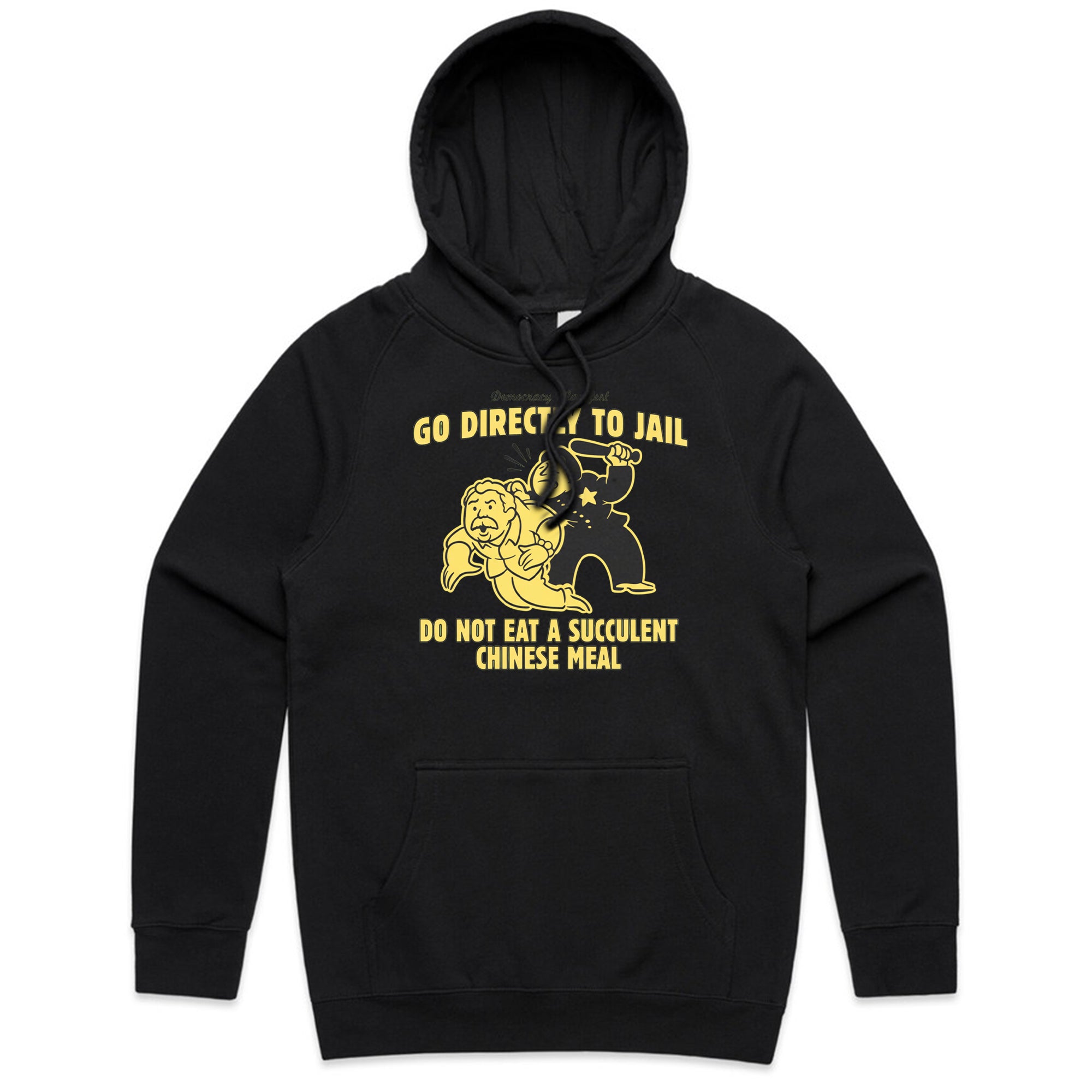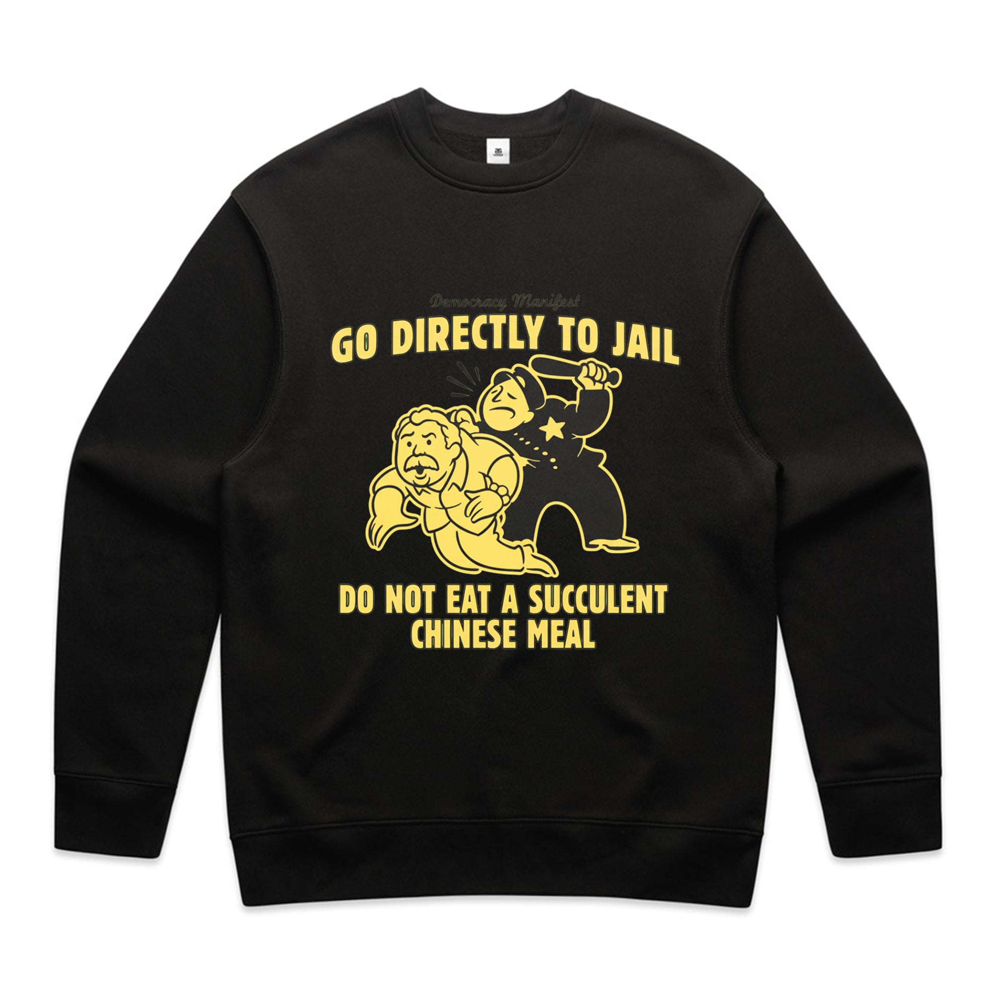 A parody of the Monopoly "Go To Jail" card. It features a line-art illustration of a man being apprehended by a police officer with the text: "GO DIRECTLY TO JAIL - DO NOT EAT A SUCCULENT CHINESE MEAL.