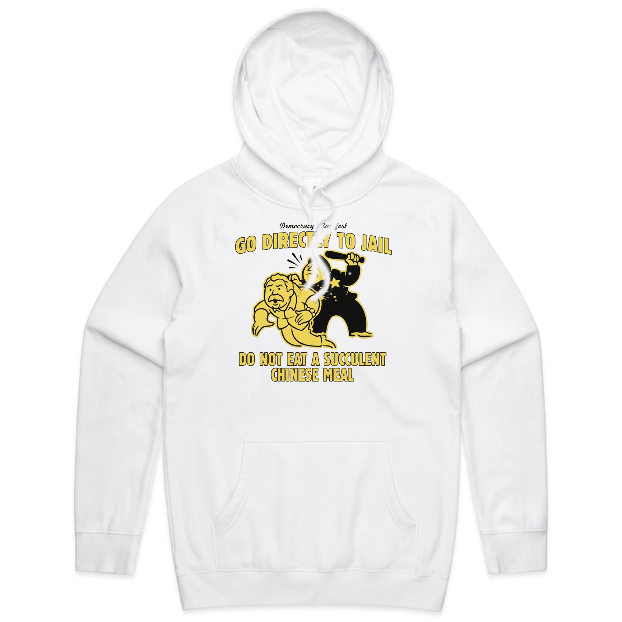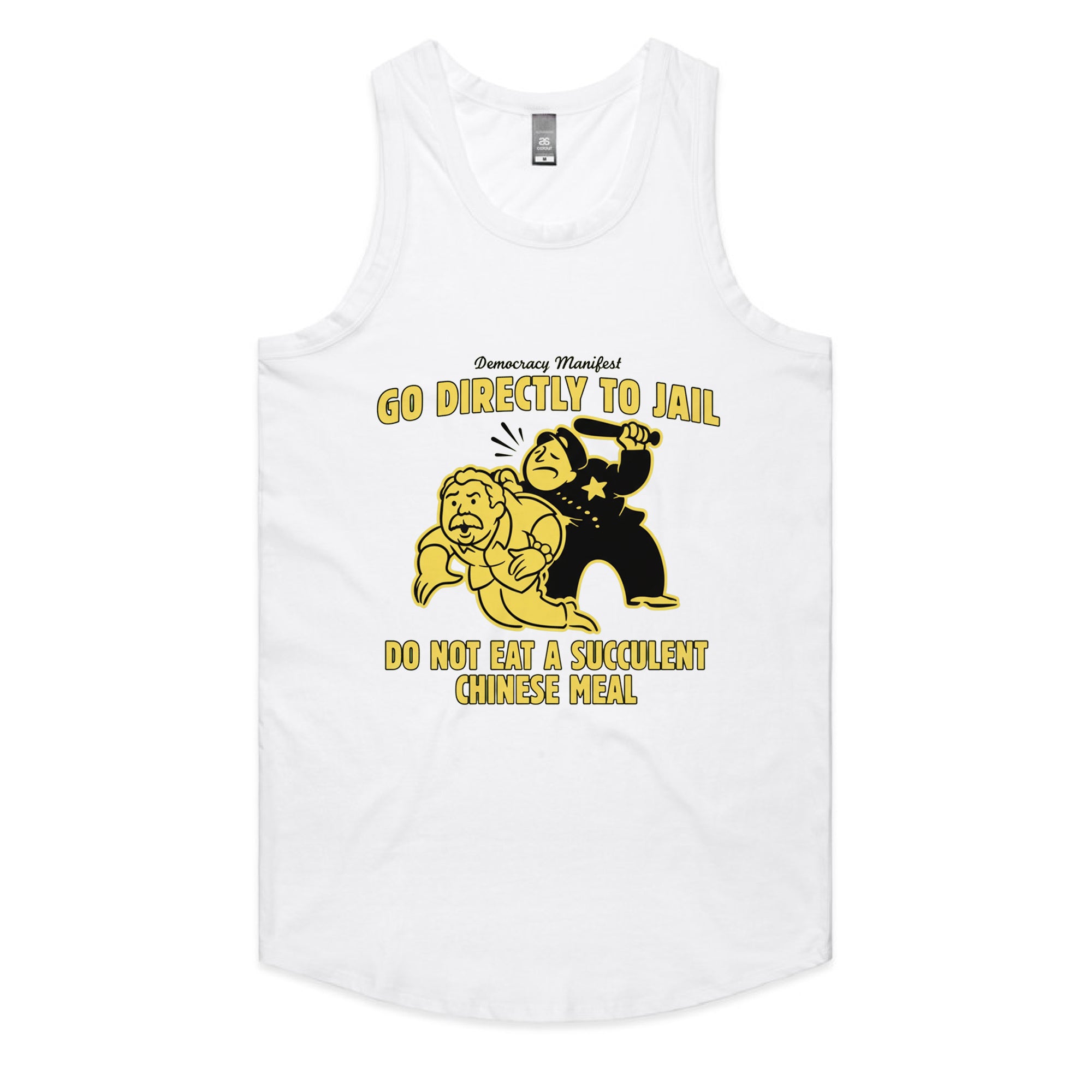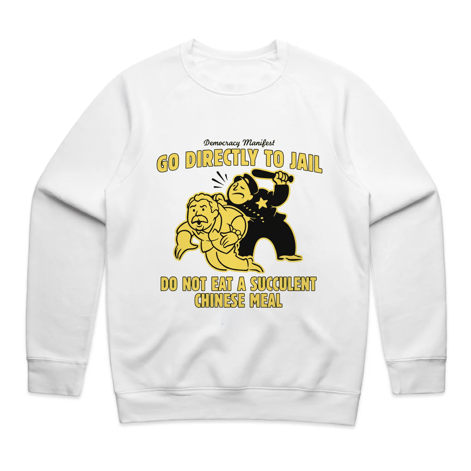 A parody of the Monopoly "Go To Jail" card. It features a line-art illustration of a man being apprehended by a police officer with the text: "GO DIRECTLY TO JAIL - DO NOT EAT A SUCCULENT CHINESE MEAL.