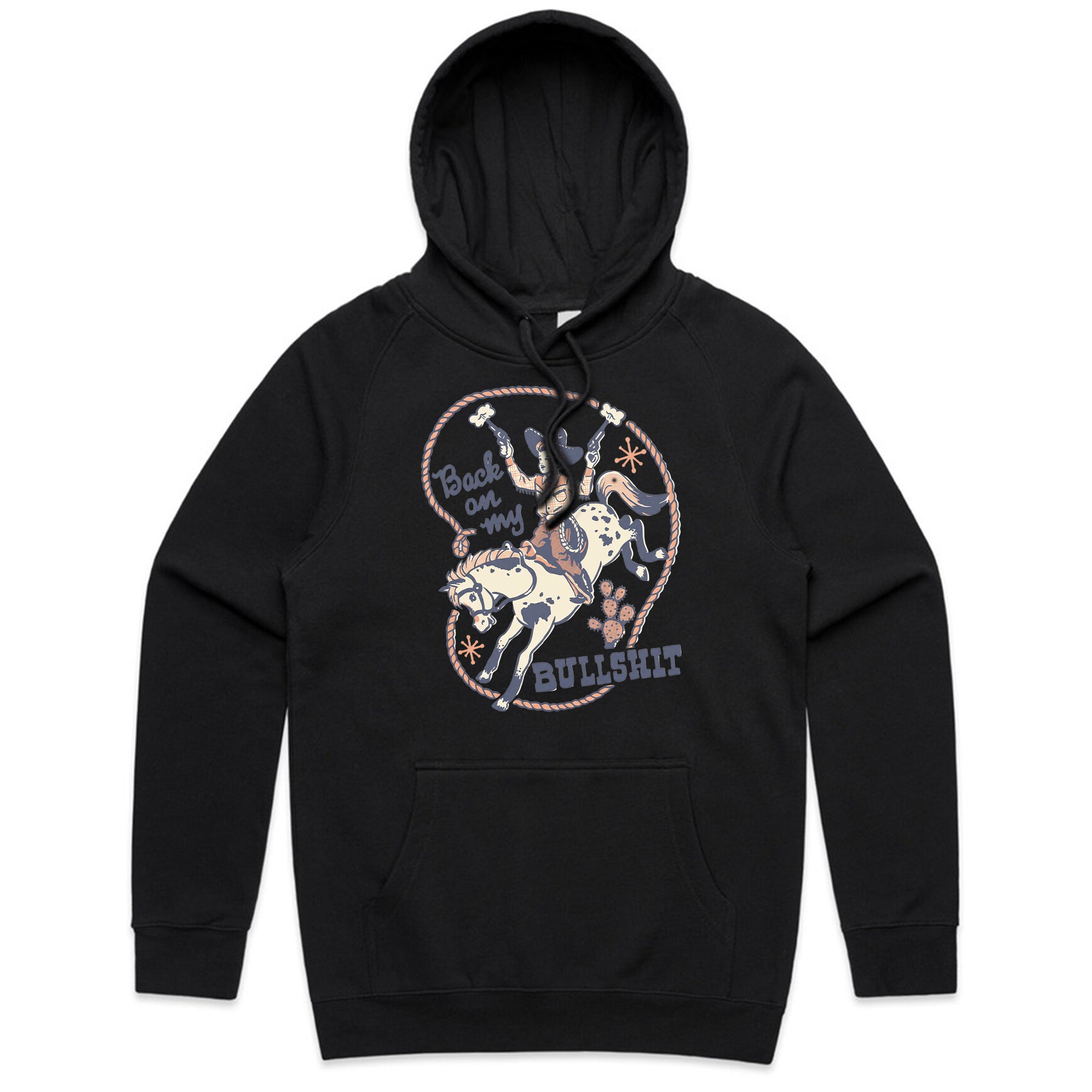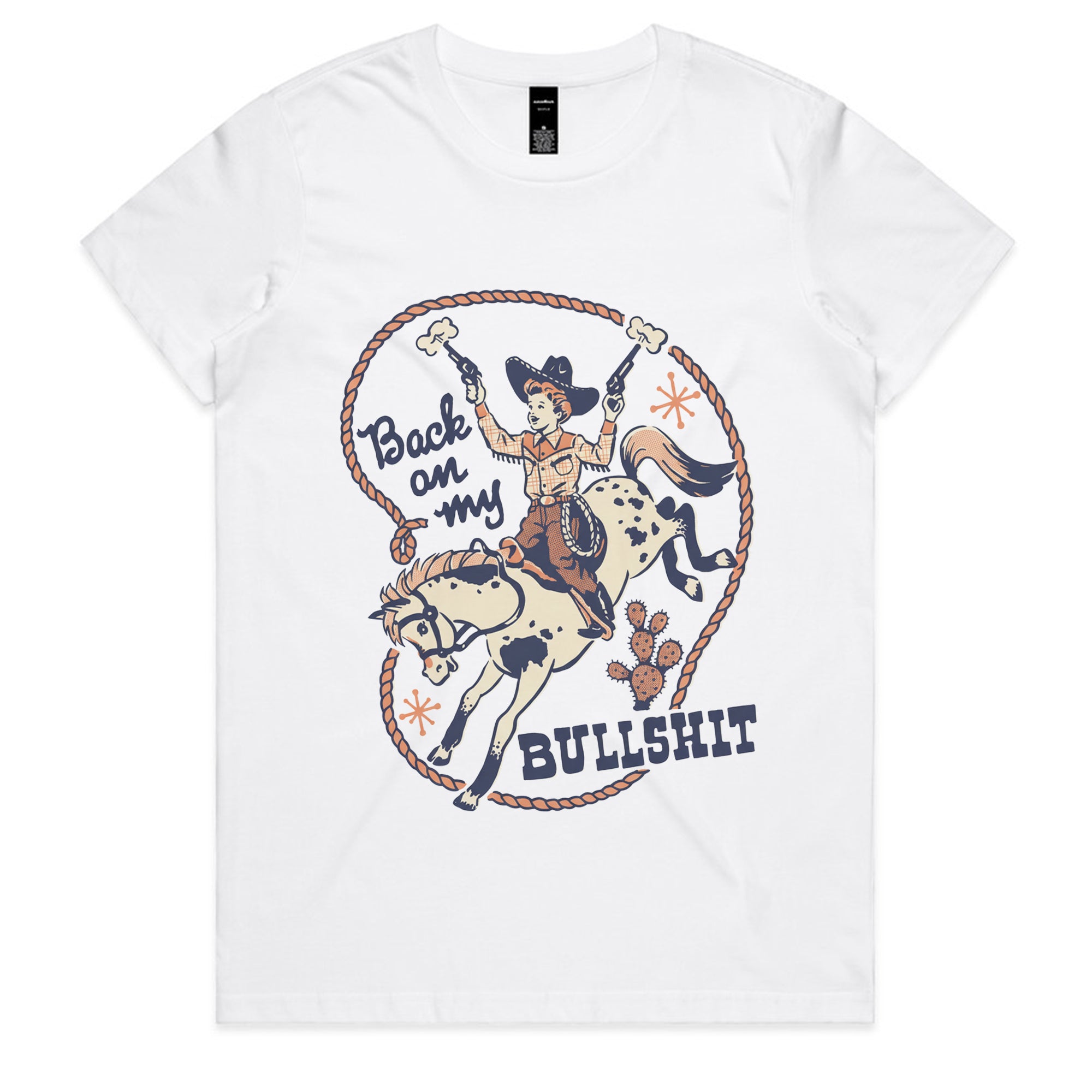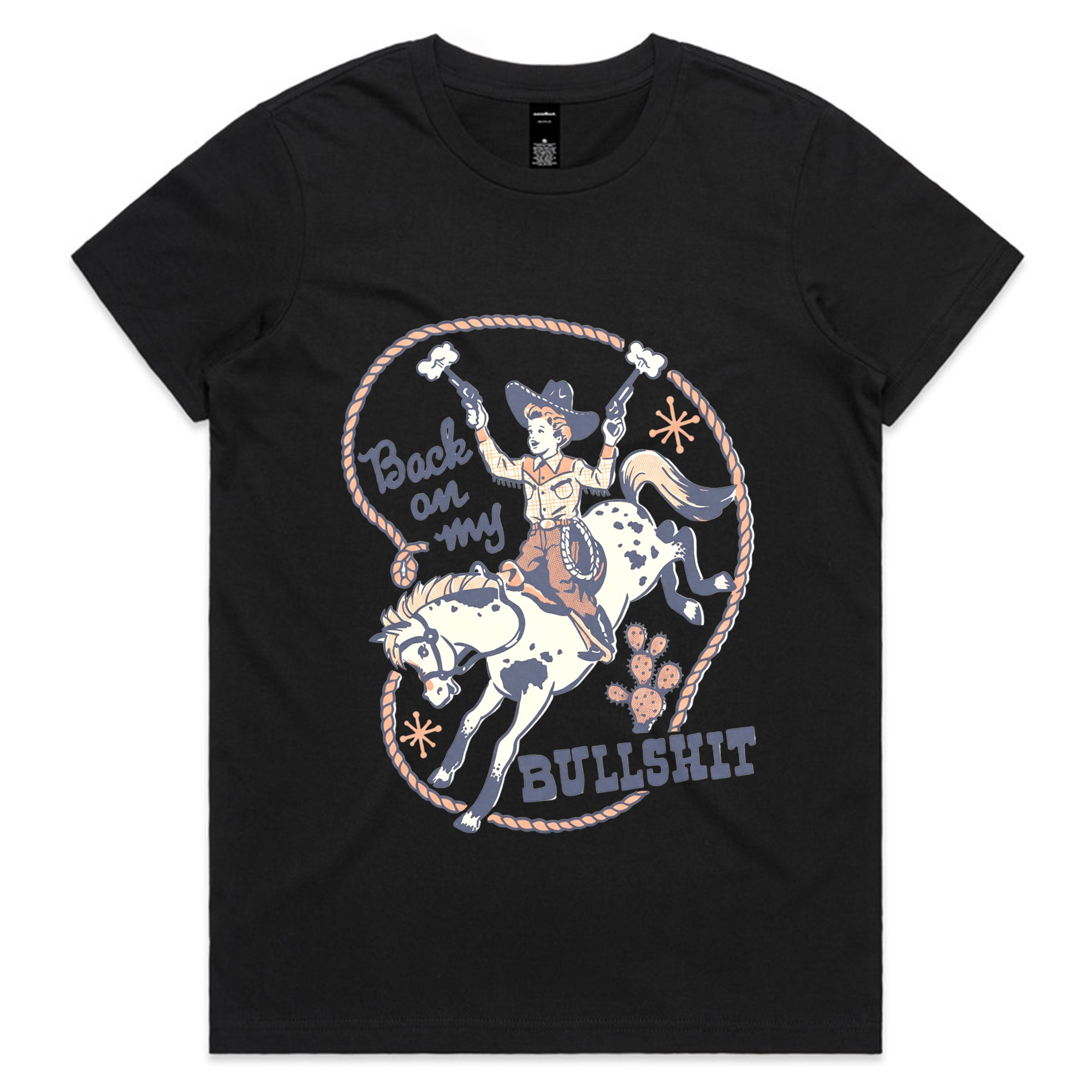 Saddle up and embrace your inner chaos. This retro western design shows a cowgirl riding a bucking horse, guns blazing, surrounded by rope and desert blooms. The bold caption “Back on My Bullshit” says it all — fun, fearless, and unapologetically wild.