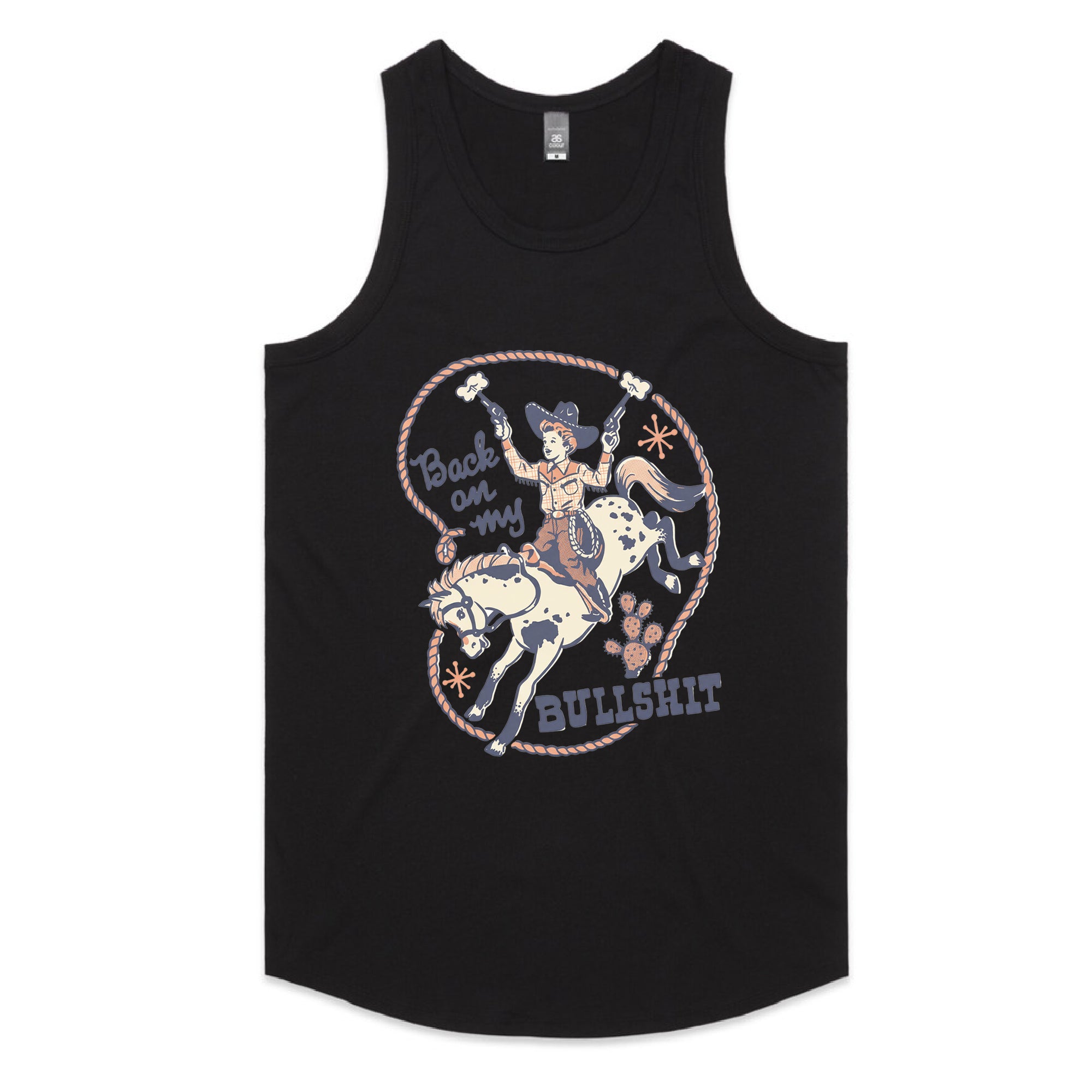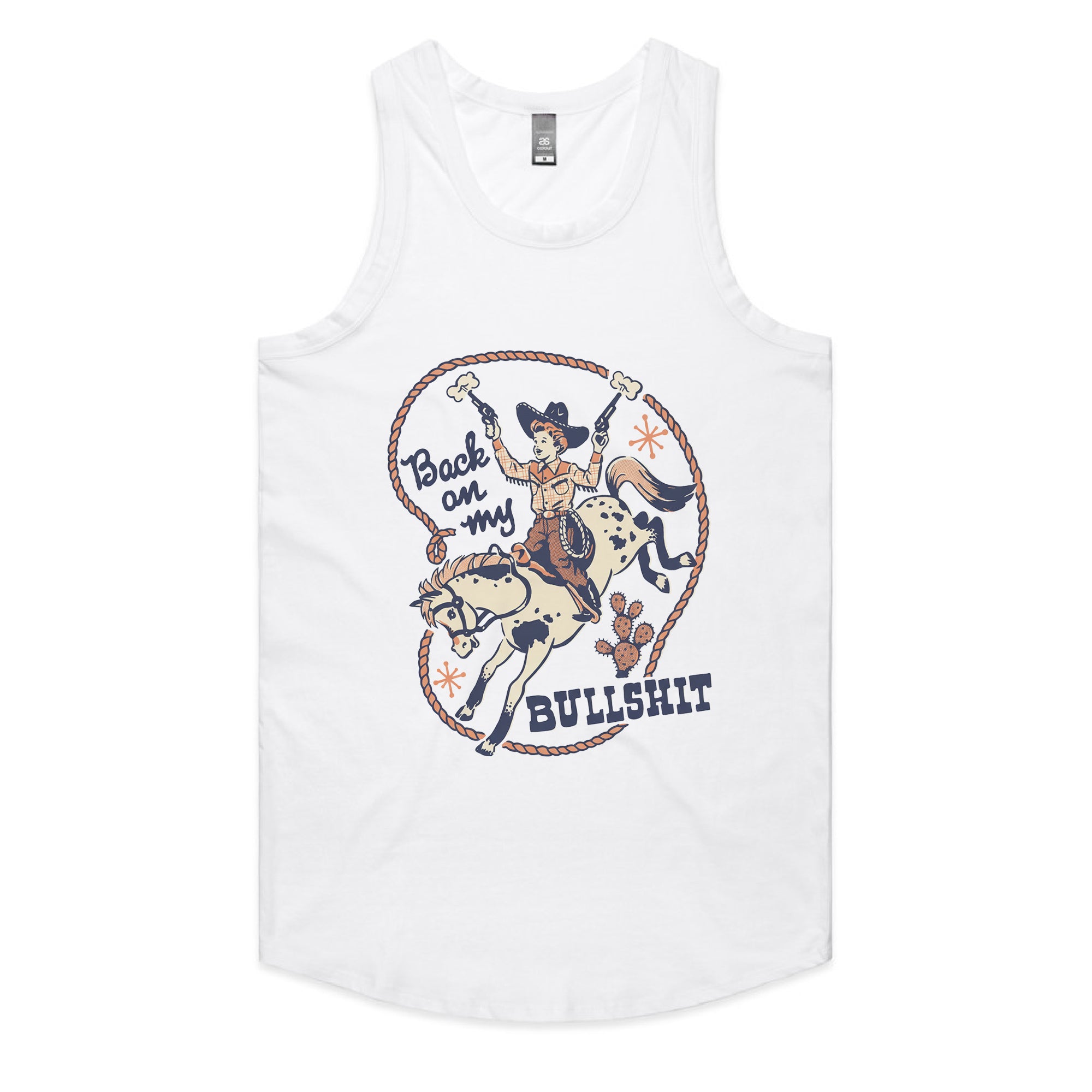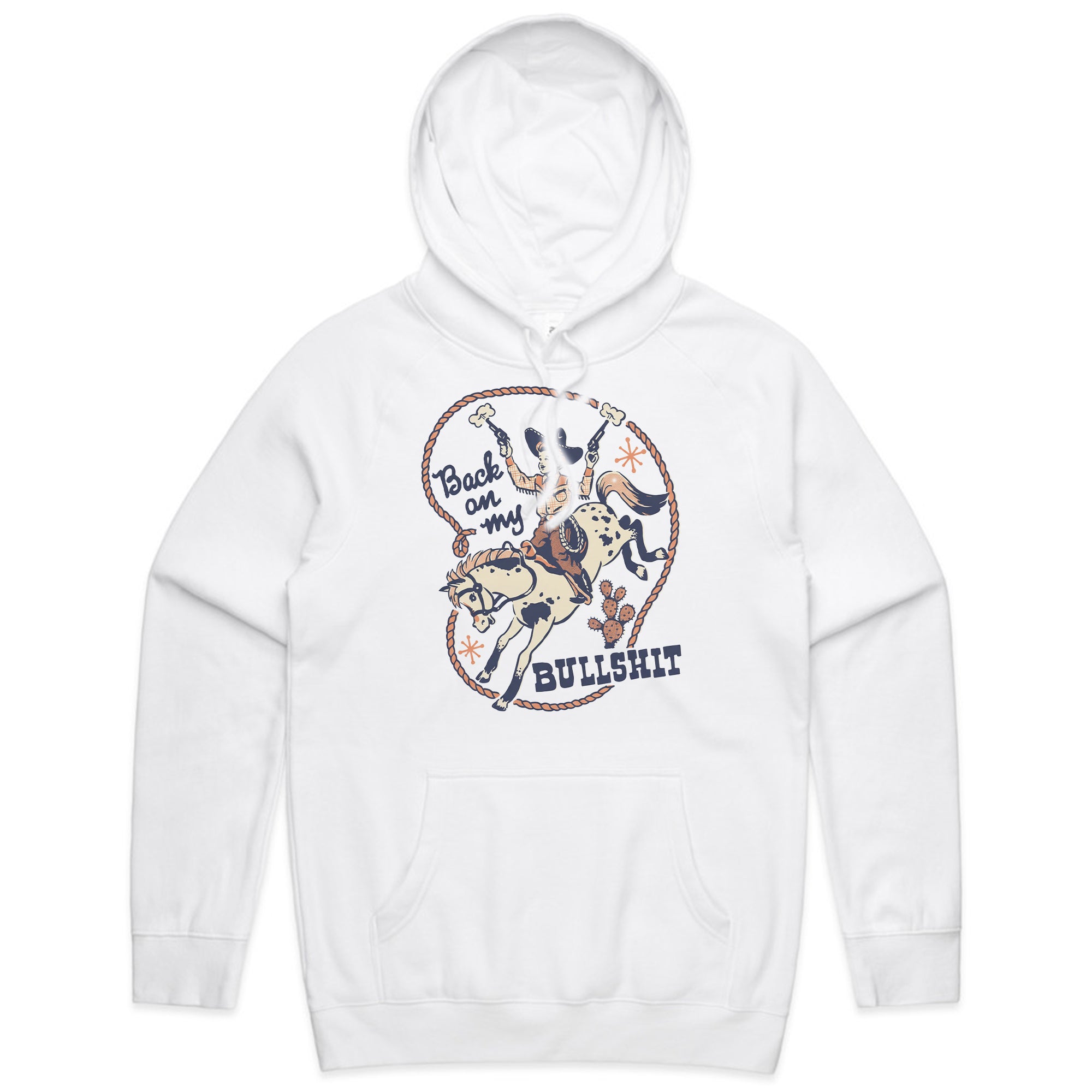 Saddle up and embrace your inner chaos. This retro western design shows a cowgirl riding a bucking horse, guns blazing, surrounded by rope and desert blooms. The bold caption “Back on My Bullshit” says it all — fun, fearless, and unapologetically wild.