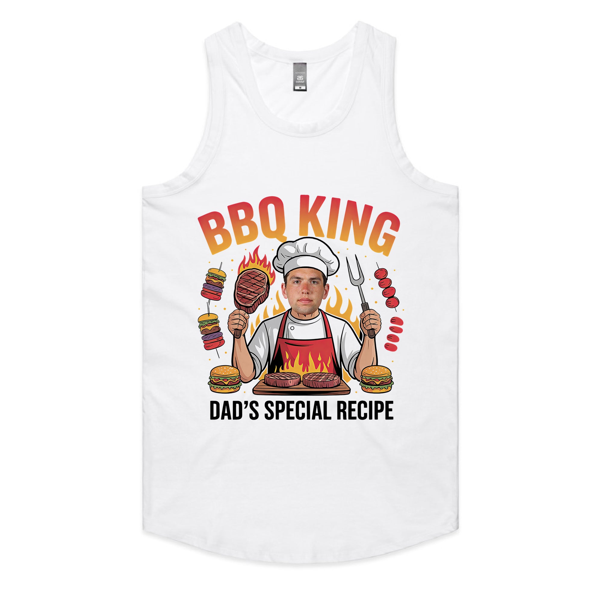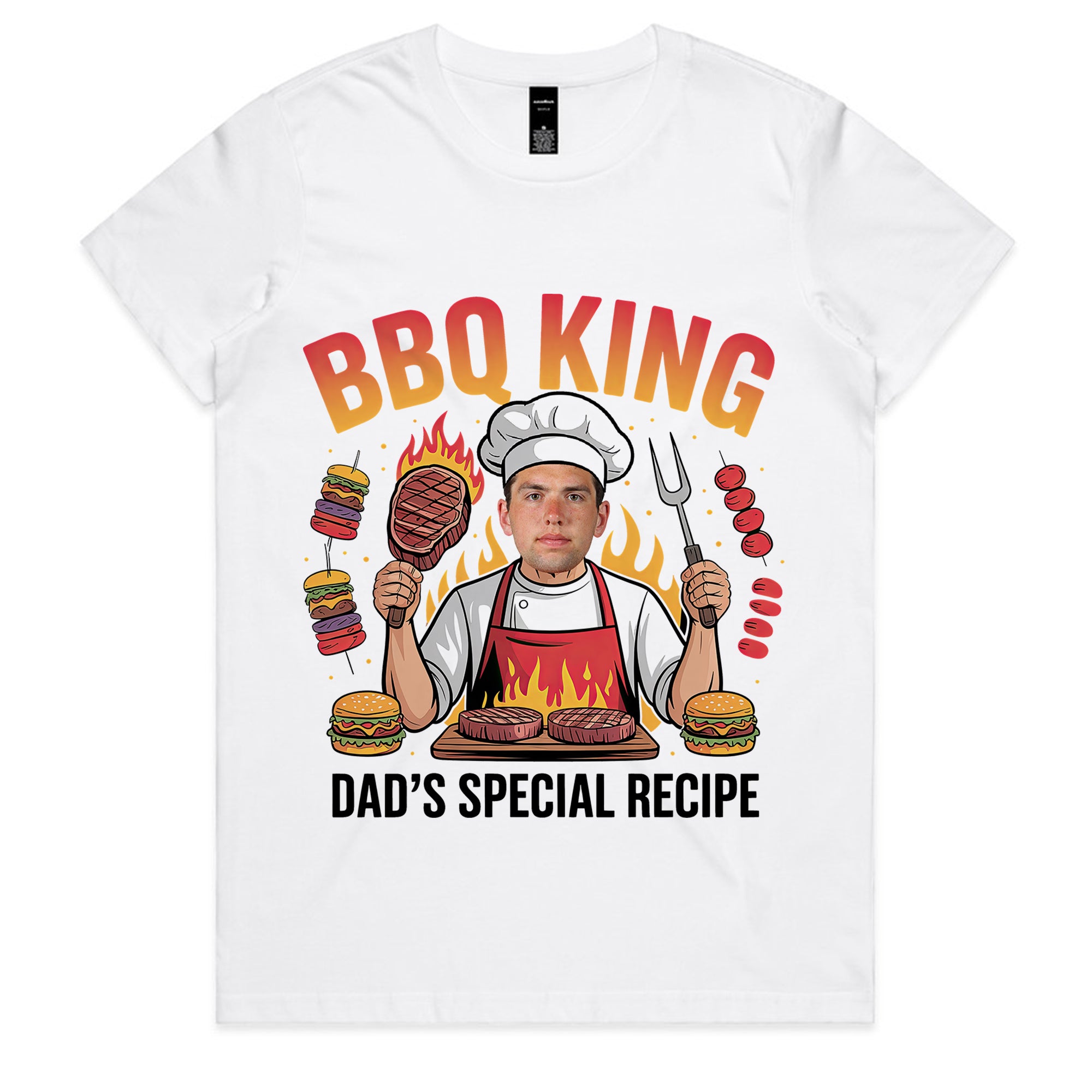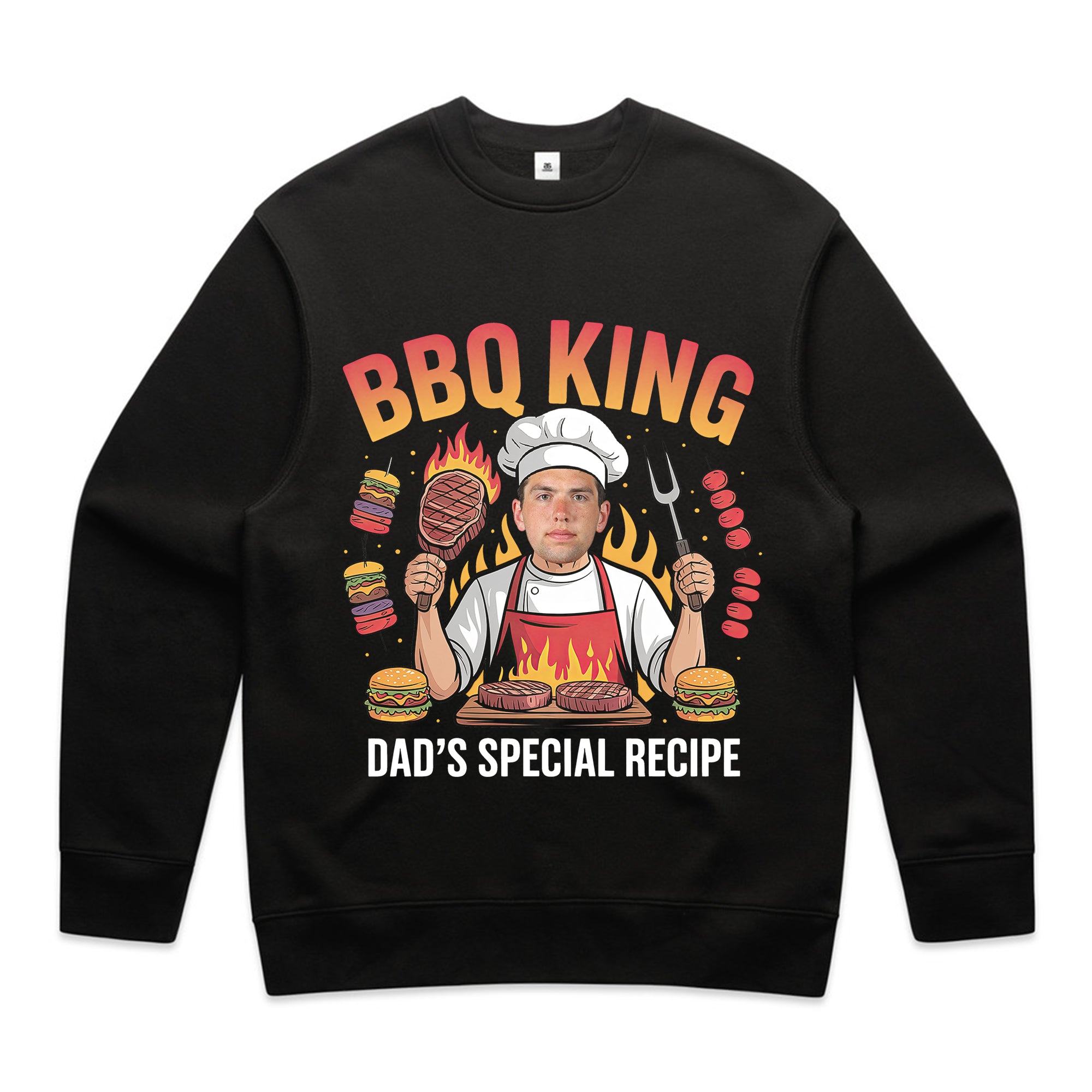 Bring the fun to every cookout with this bold “BBQ King” design. Featuring a chef in a flaming apron, holding a juicy steak and grilling fork, it celebrates the ultimate master of the grill. Surrounded by burgers, skewers, and sizzling flames, this artwork makes the perfect tribute to Dad’s legendary backyard recipes.