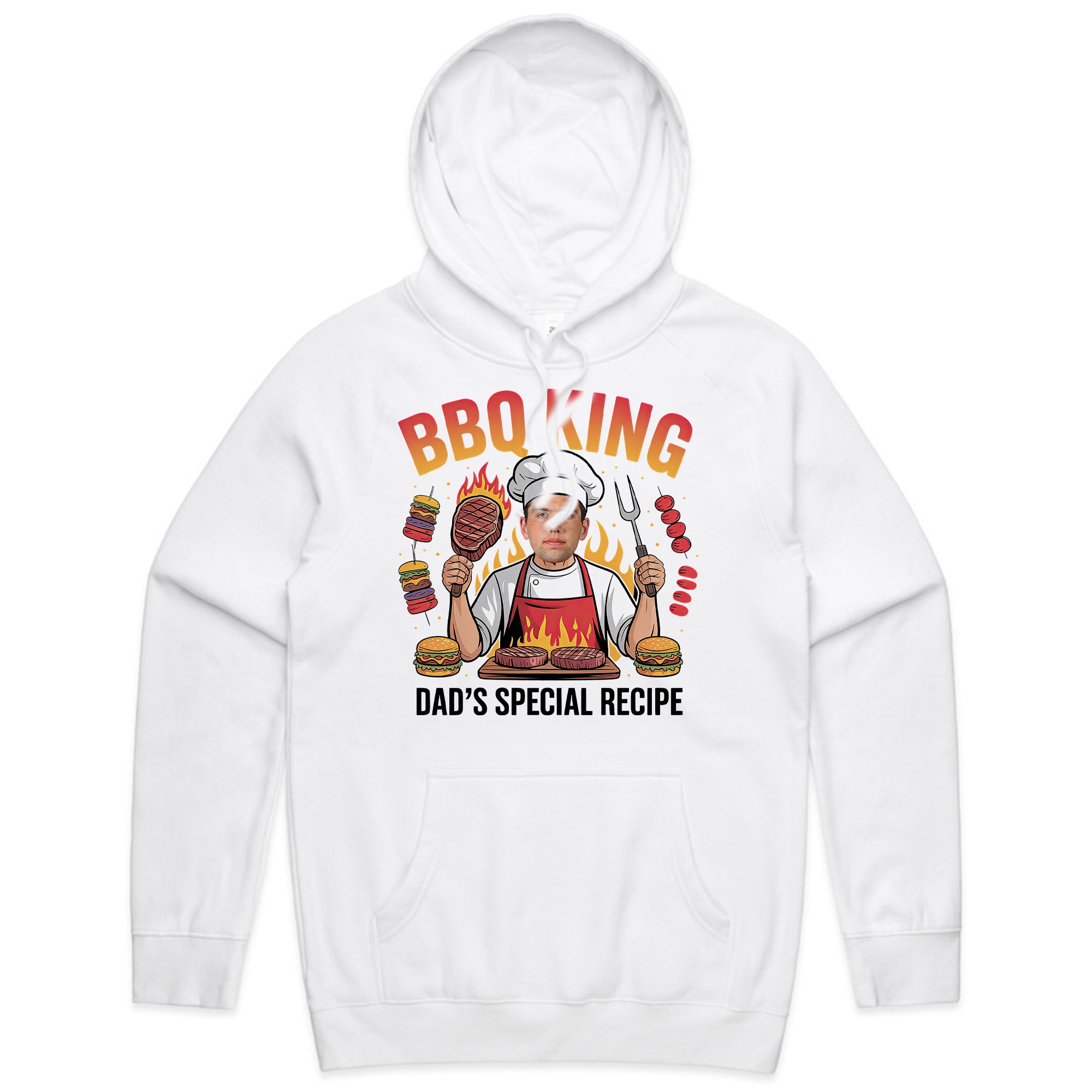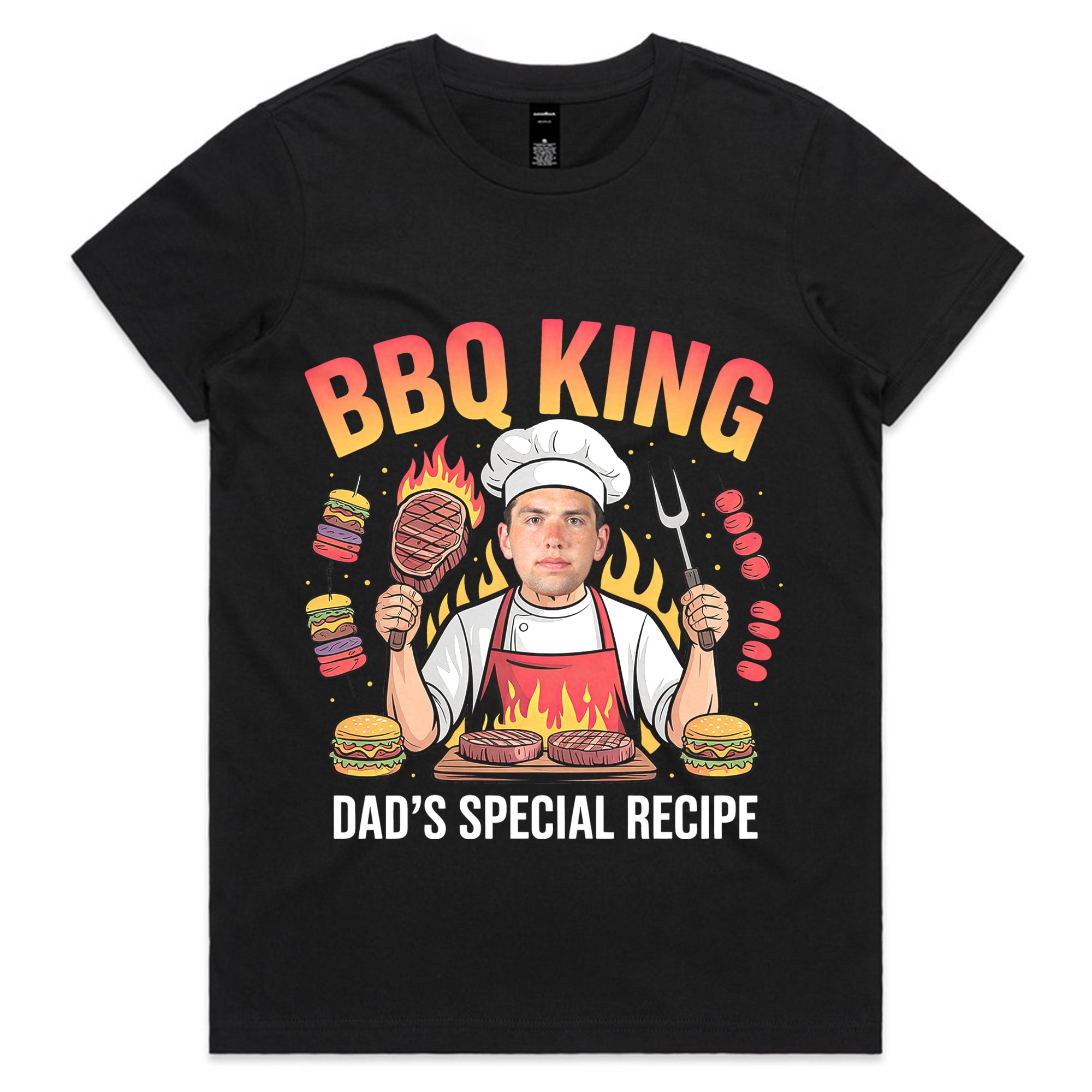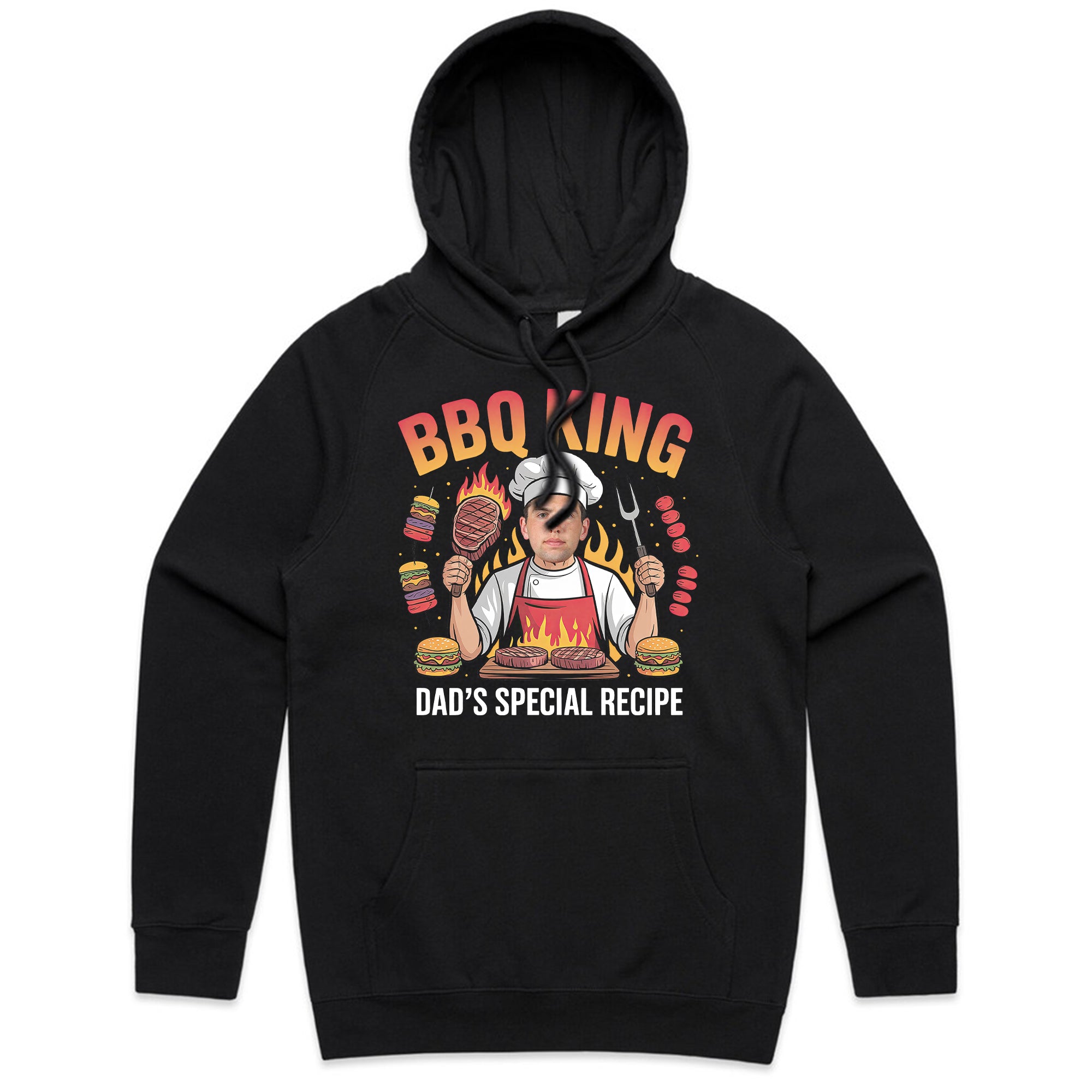 Bring the fun to every cookout with this bold “BBQ King” design. Featuring a chef in a flaming apron, holding a juicy steak and grilling fork, it celebrates the ultimate master of the grill. Surrounded by burgers, skewers, and sizzling flames, this artwork makes the perfect tribute to Dad’s legendary backyard recipes.