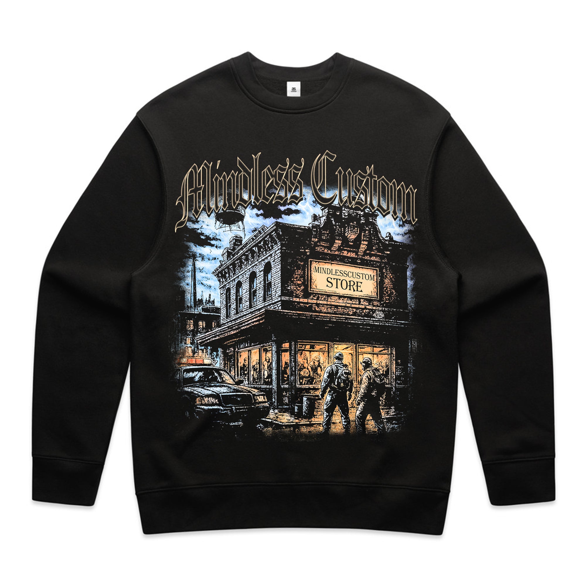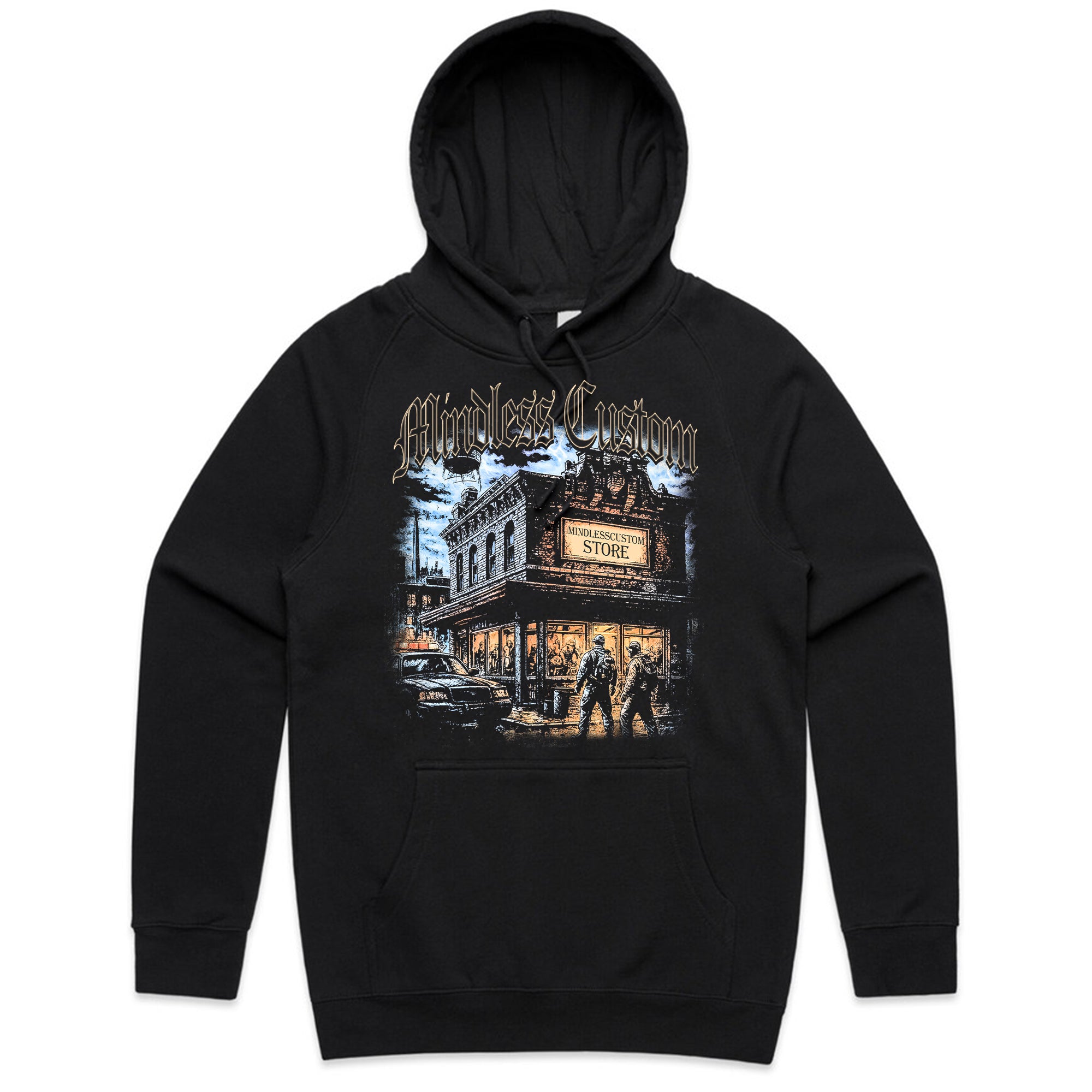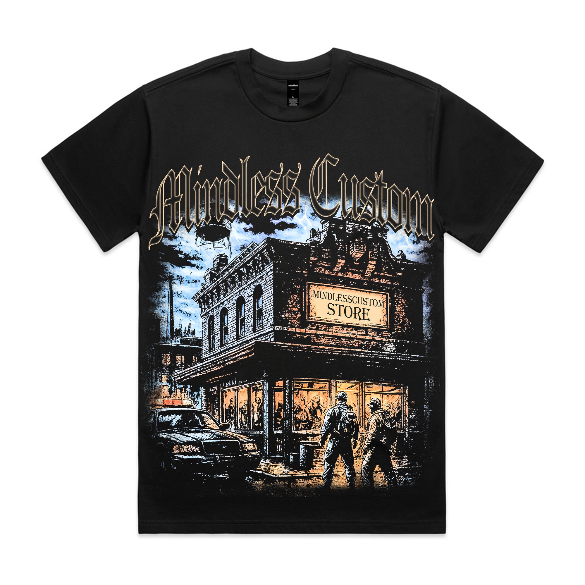 Step into the dark side of the city with this bold streetwear piece. Featuring a dramatic storefront scene under stormy skies, lit windows, and gritty urban details, this tee captures the raw energy of underground street culture. With gothic “Mindless Custom” lettering towering above, it’s a design that screams attitude and individuality.