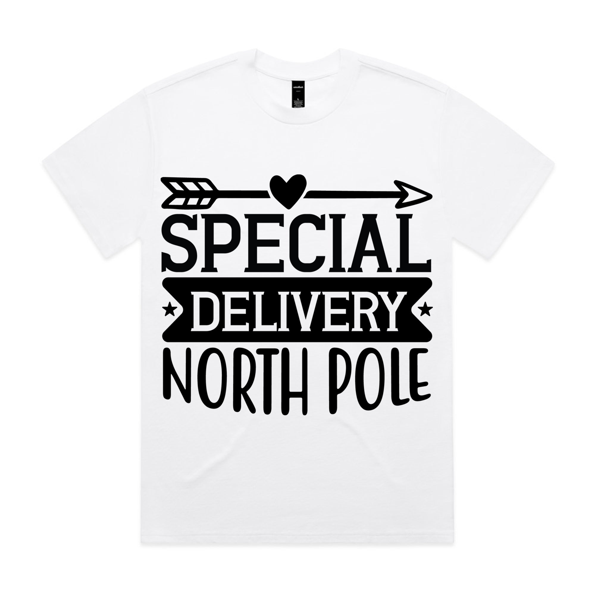 Send a special message this Christmas with this 'Special Delivery' t-shirt, featuring a fun arrow pointing to the North Pole. Perfect for those who love the holiday spirit!