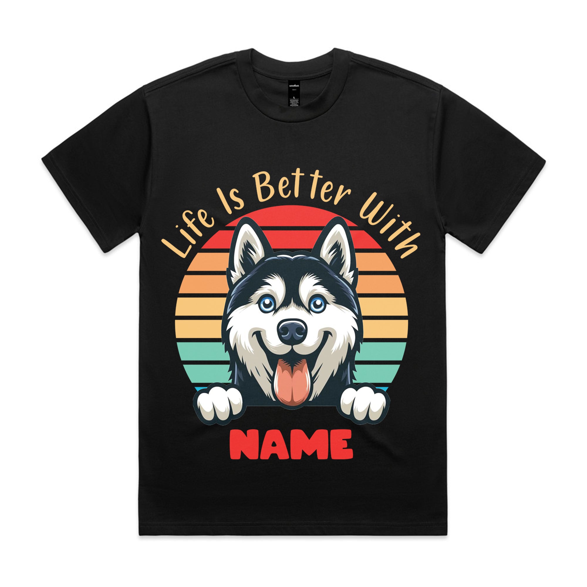 This T-shirt features a cheerful and heartwarming design that celebrates the joy of having a dog. The text “Life Is Better With [Name]” is displayed in playful, rounded letters, with the word “Name” customizable to include your pet’s name. At the center is a cute illustration of a happy Husky with bright blue eyes and its tongue out, adding a lively and friendly touch.