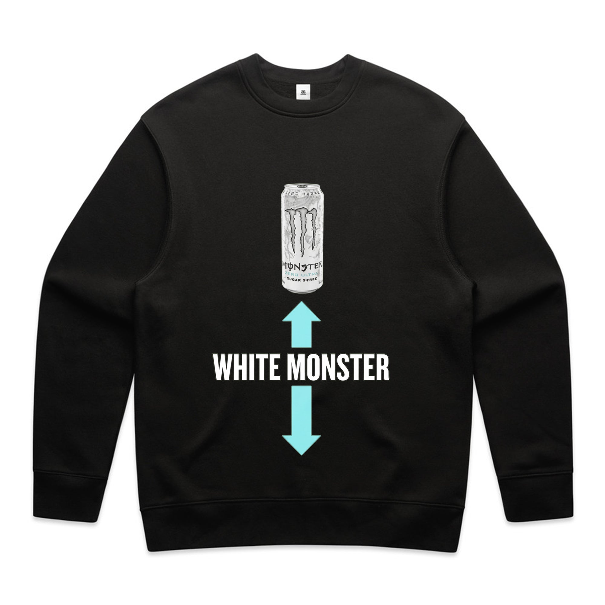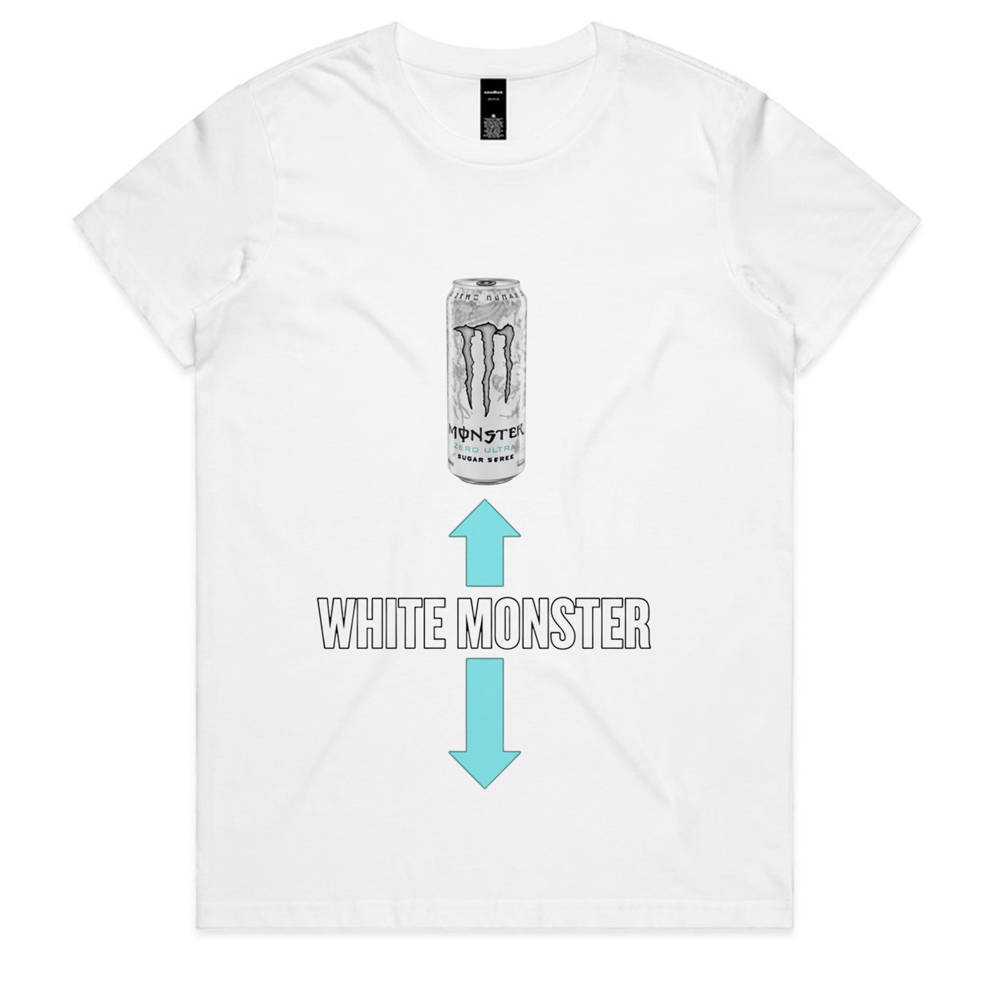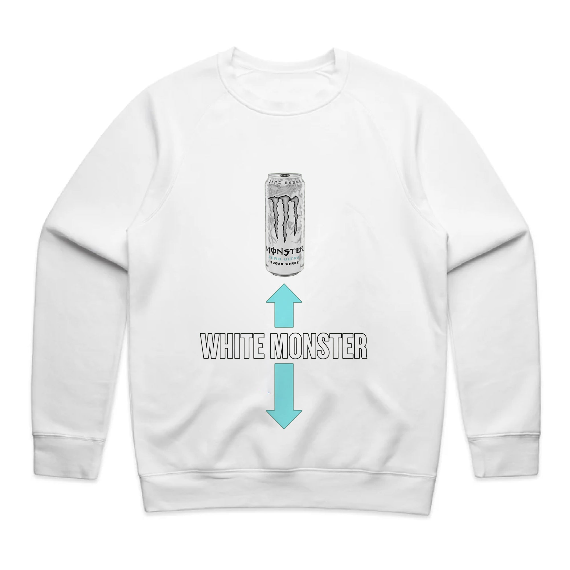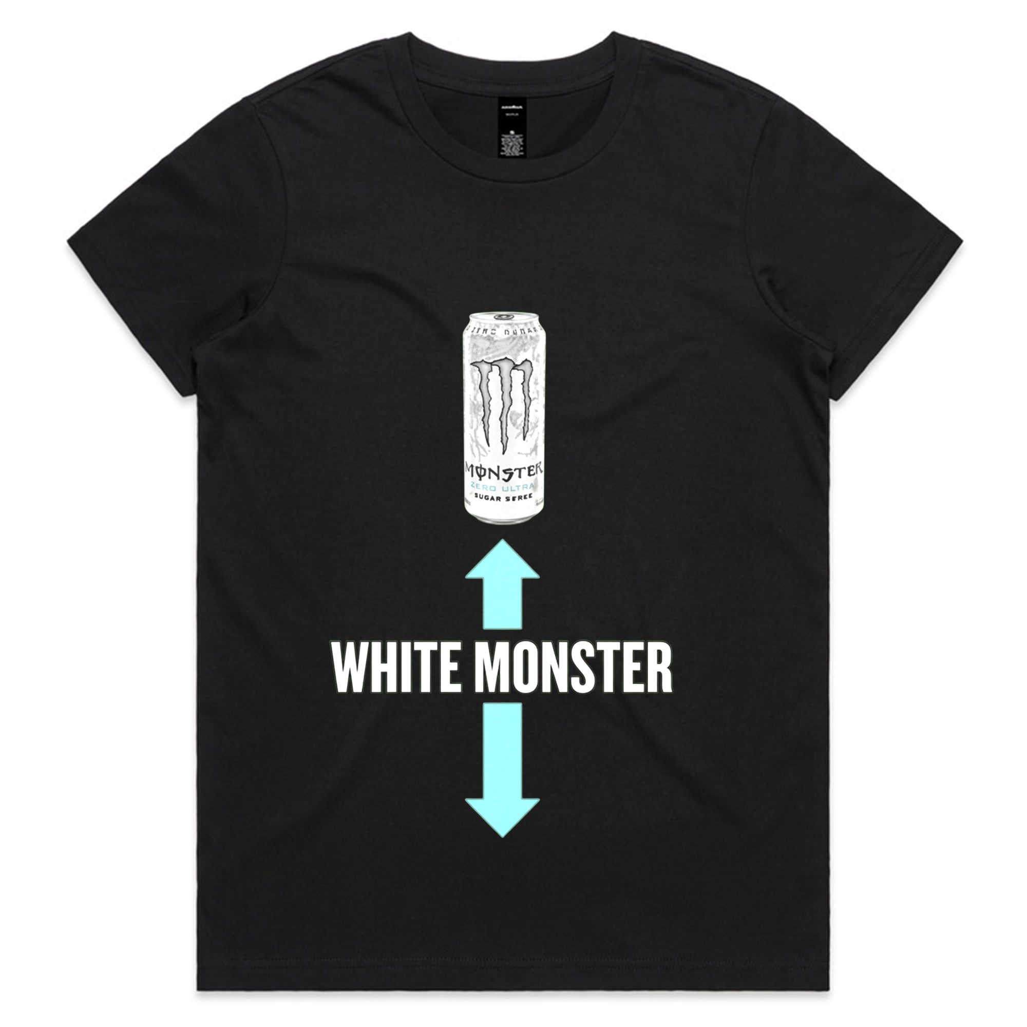 A minimalist and humorous design centered on a high-detail graphic of a Monster Energy Zero Ultra (the "White Monster") can. Below the can is a vertical double-headed light blue arrow that intersects with the bold, white sans-serif text "WHITE MONSTER." The layout mimics a diagram or a meme-style infographic.