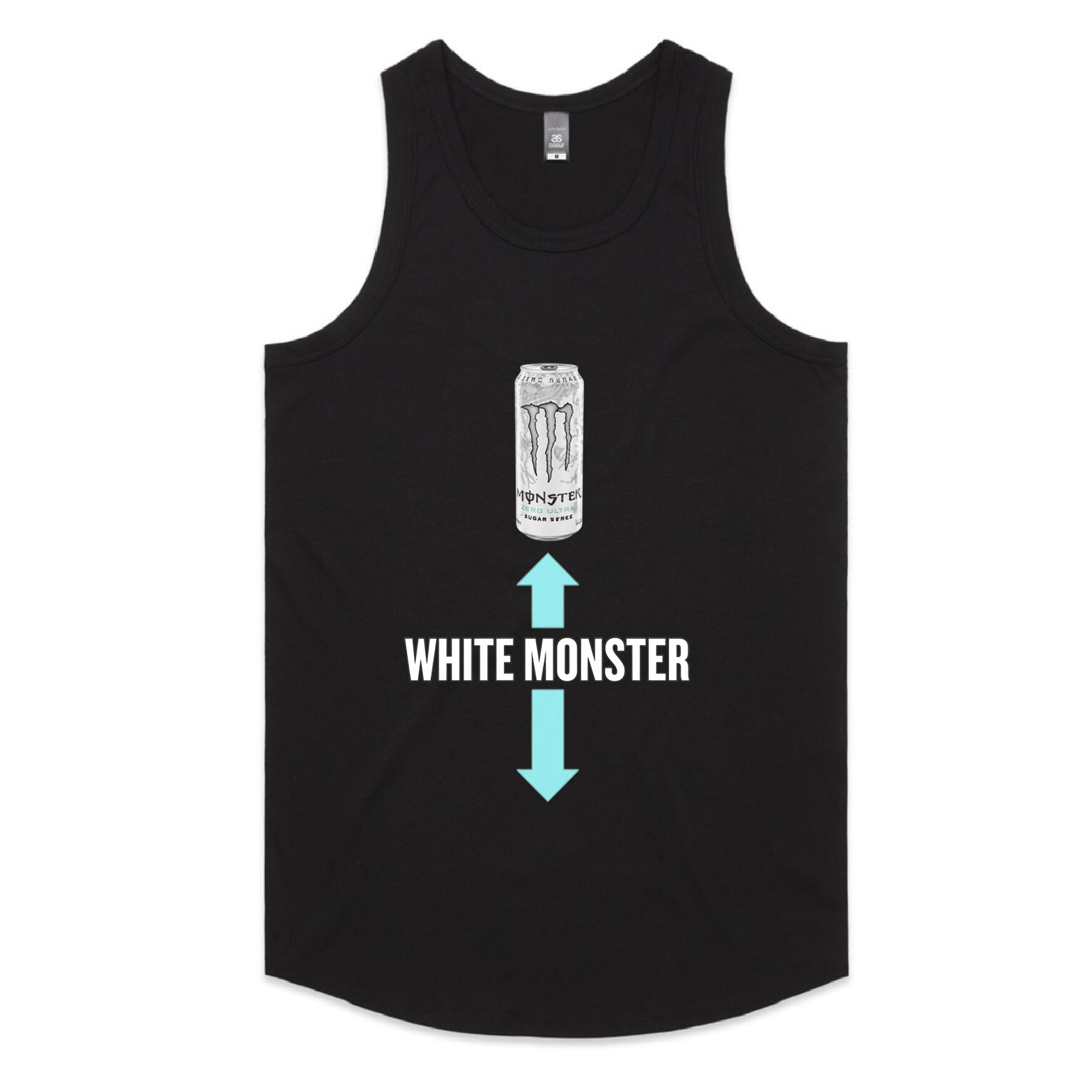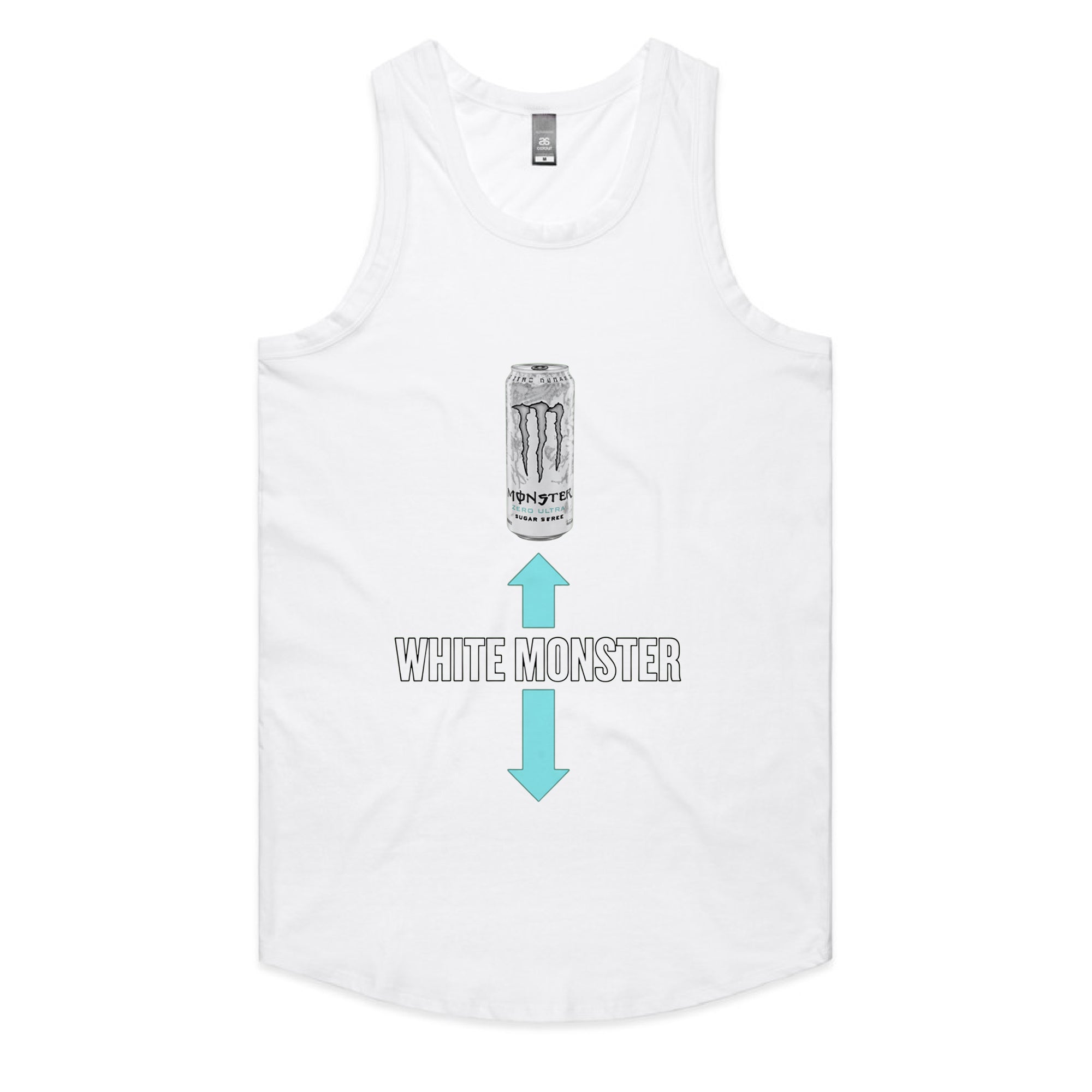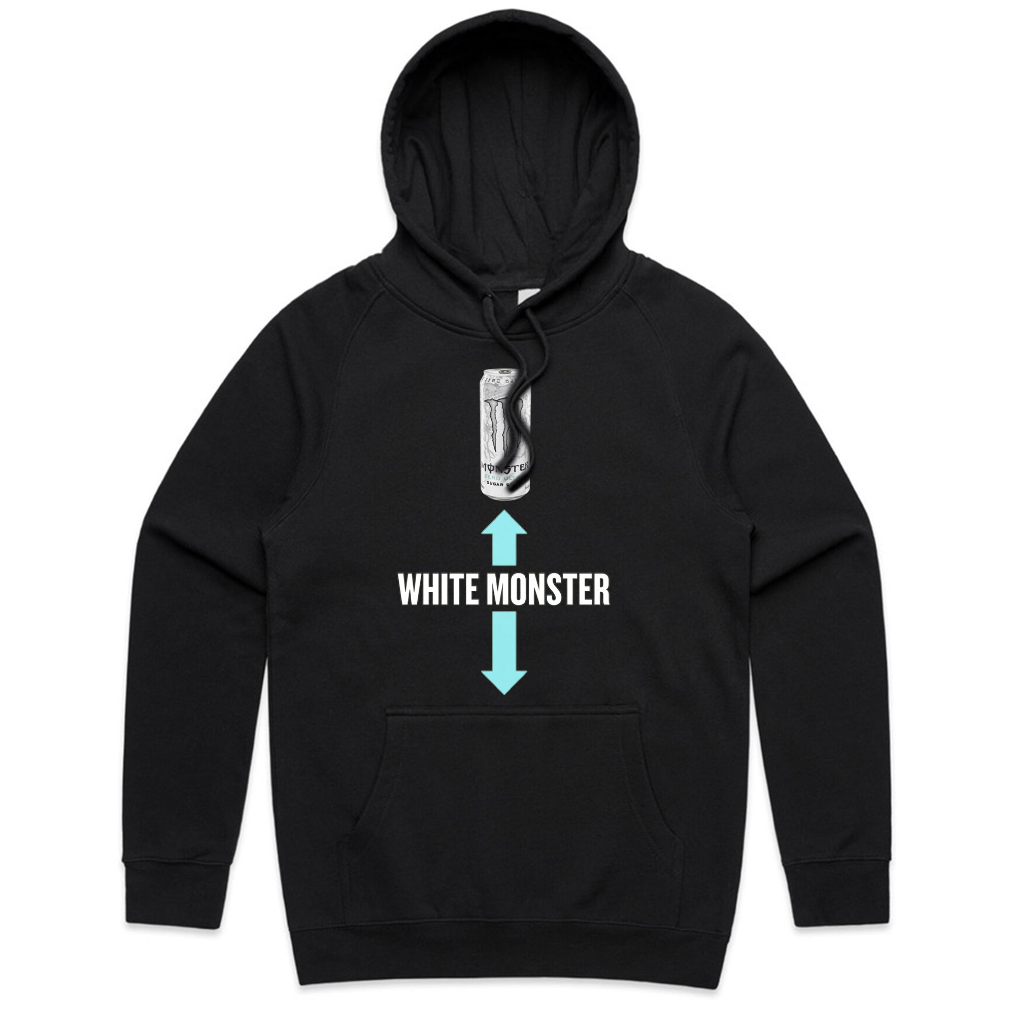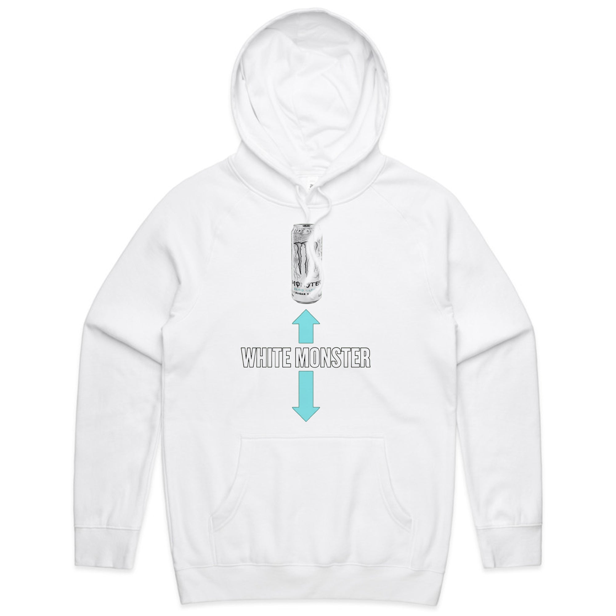 A minimalist and humorous design centered on a high-detail graphic of a Monster Energy Zero Ultra (the "White Monster") can. Below the can is a vertical double-headed light blue arrow that intersects with the bold, white sans-serif text "WHITE MONSTER." The layout mimics a diagram or a meme-style infographic.
