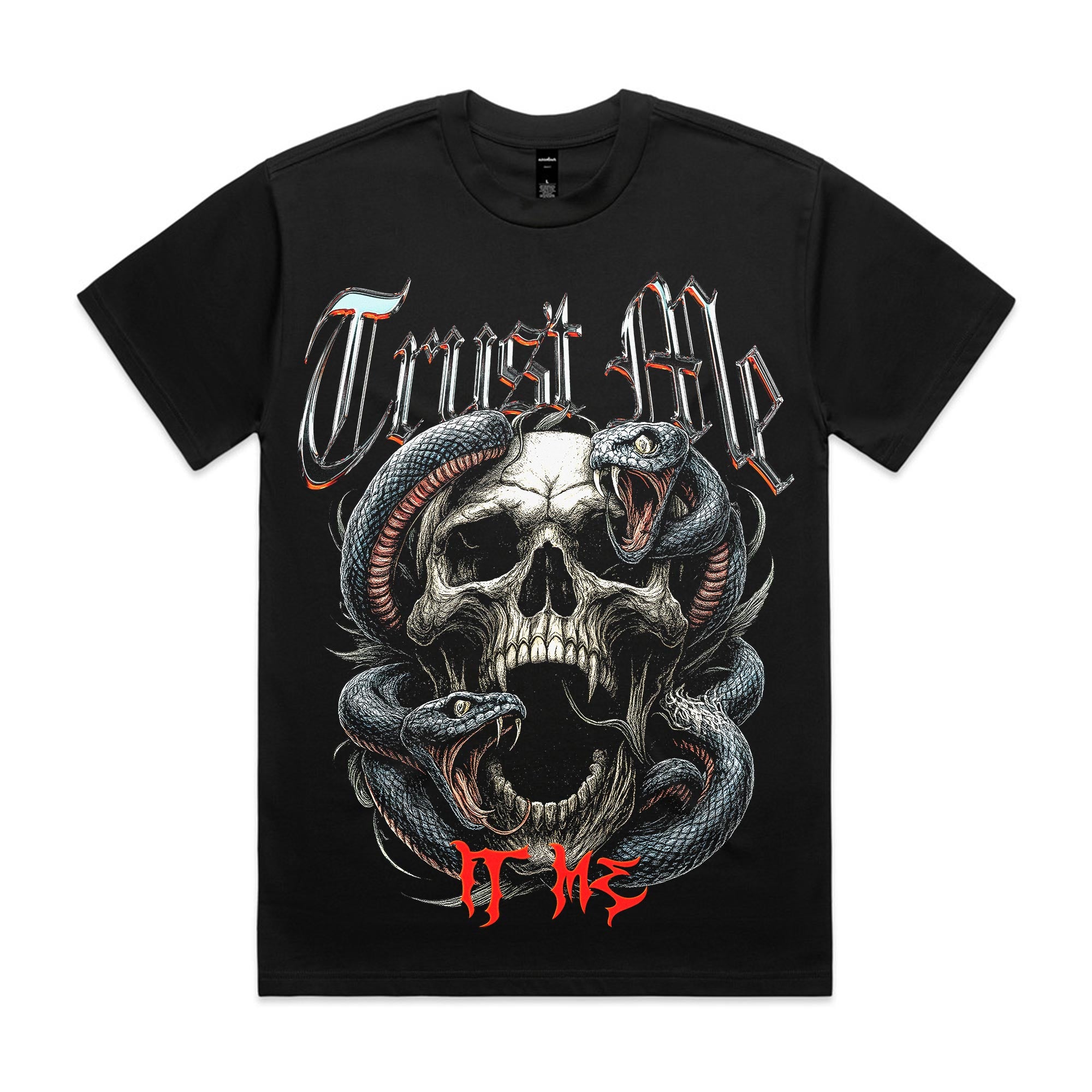 For the ones who mix charm with danger, this T-shirt is the ultimate warning. Featuring a menacing skull wrapped in serpents with bold gothic lettering, it’s dark, edgy, and unforgettable.
