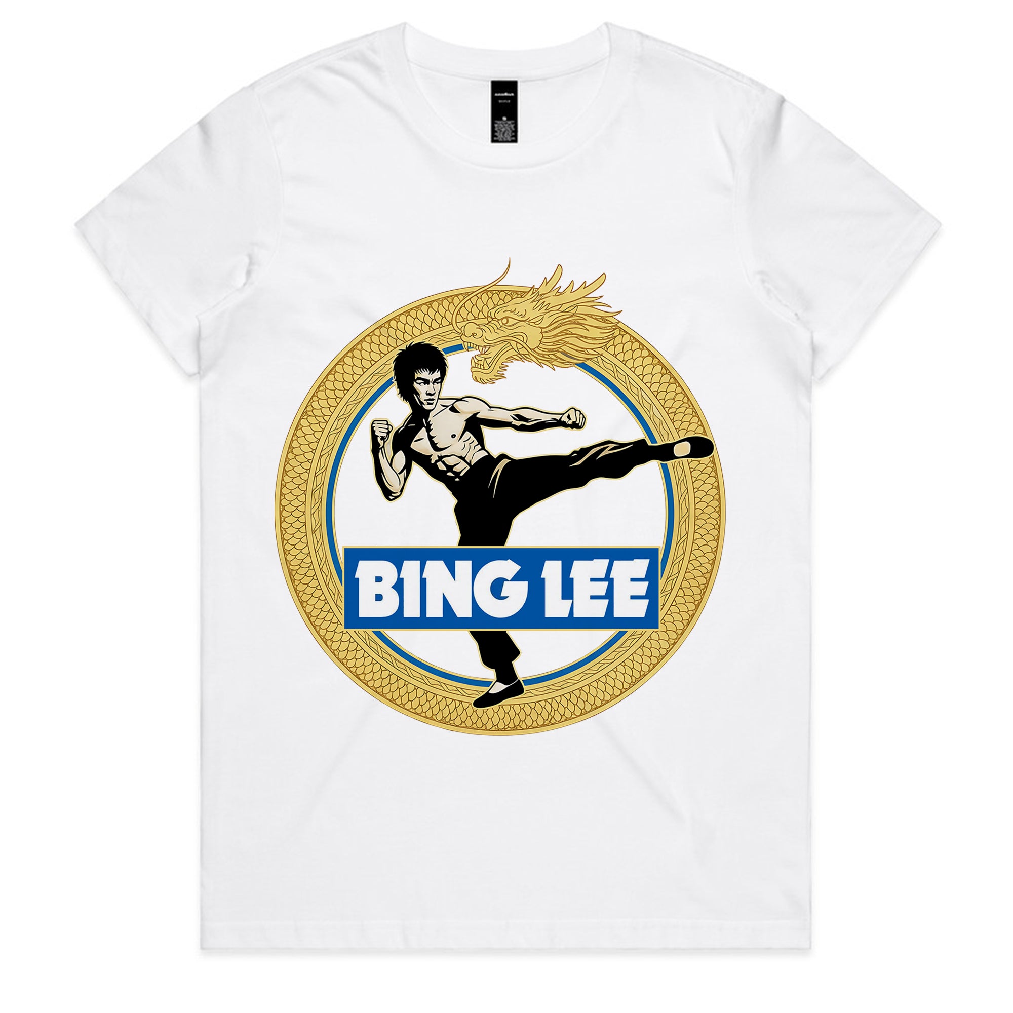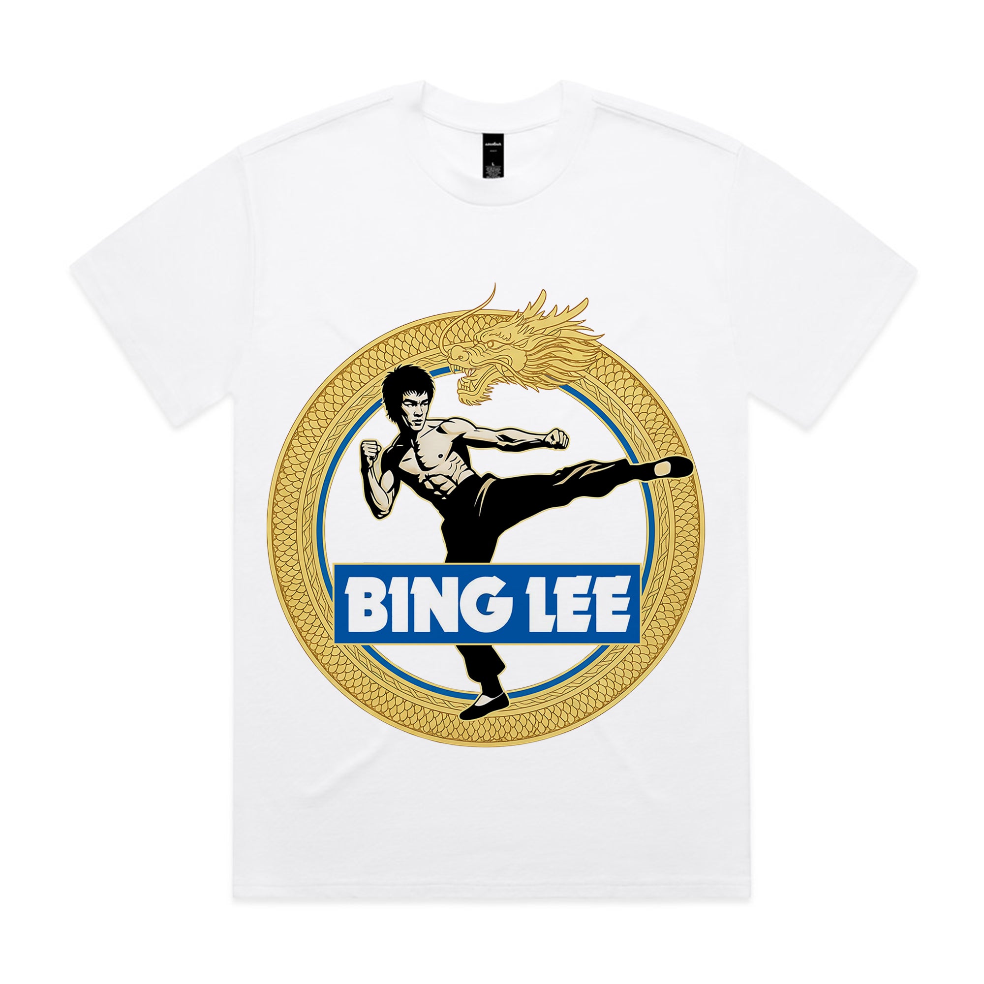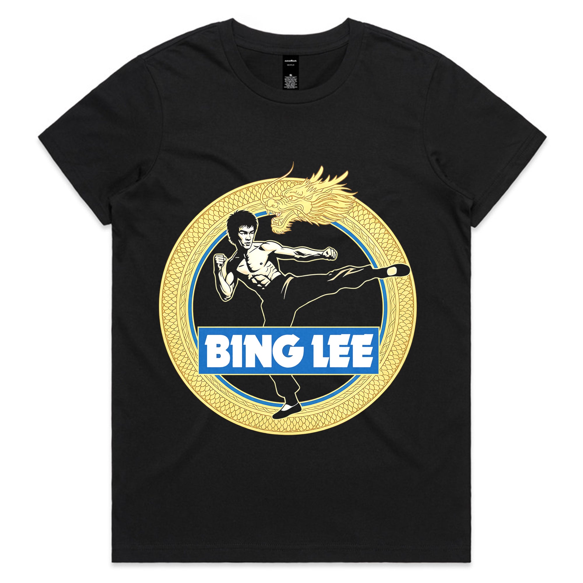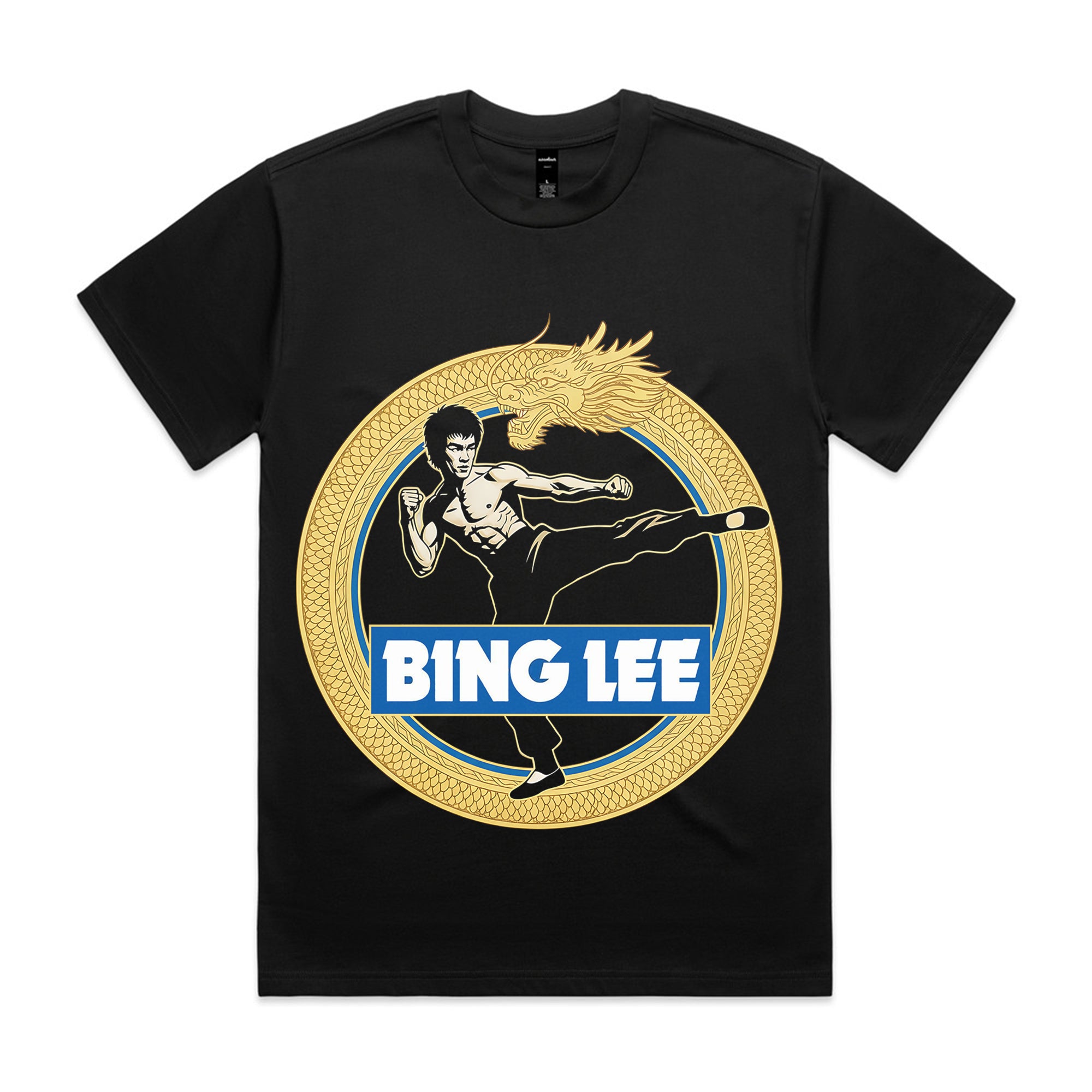 A bold black tee featuring a dynamic martial arts pose surrounded by a golden dragon emblem. The center showcases the playful text āBING LEEā in striking blue and white, giving it a humorous twist on classic action-inspired designs. Perfect for those who love pop culture mashups with attitude.