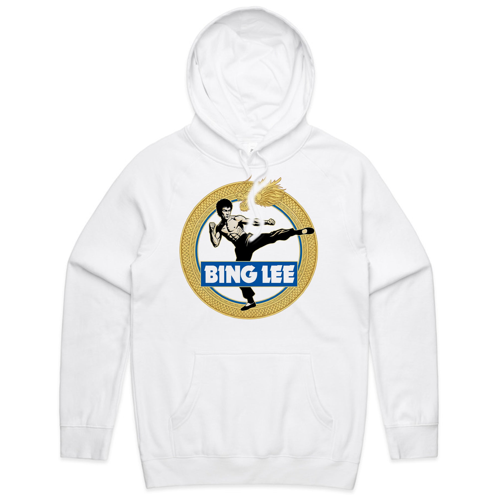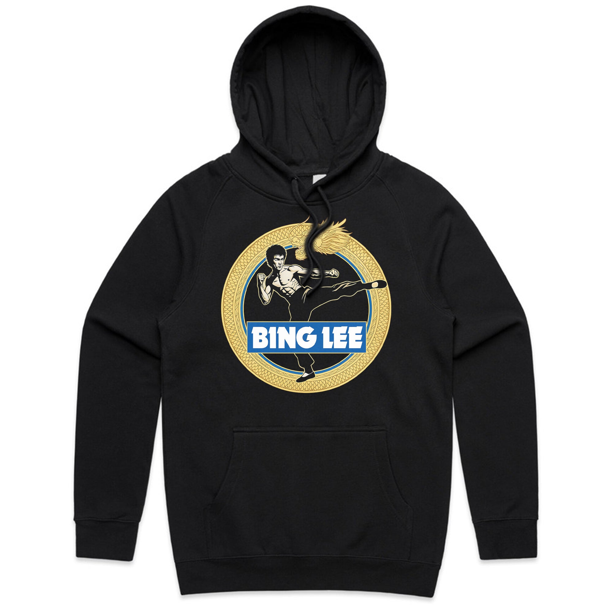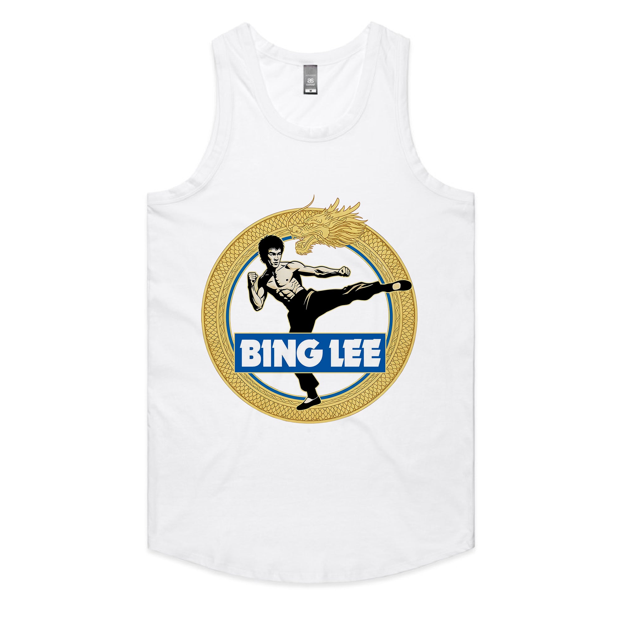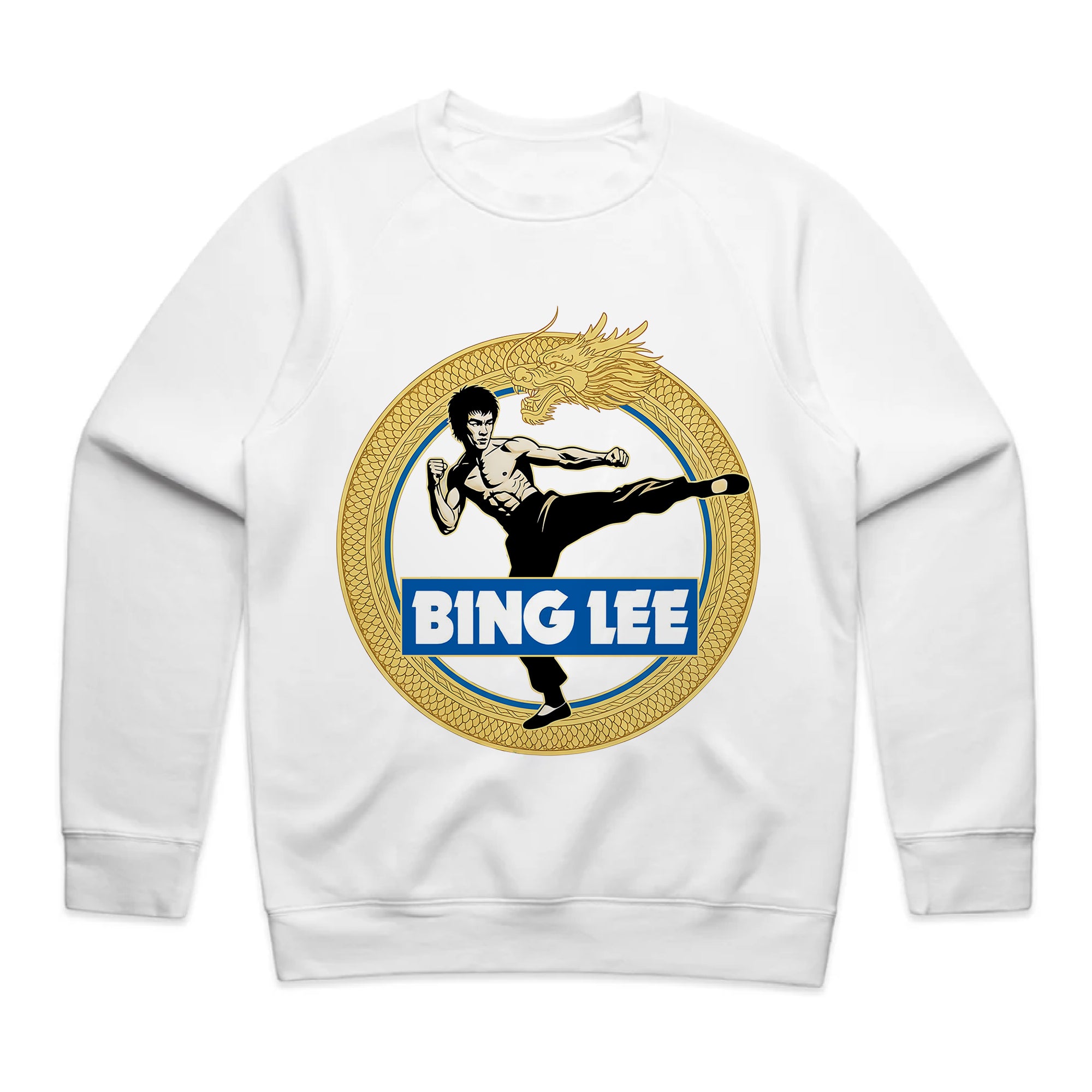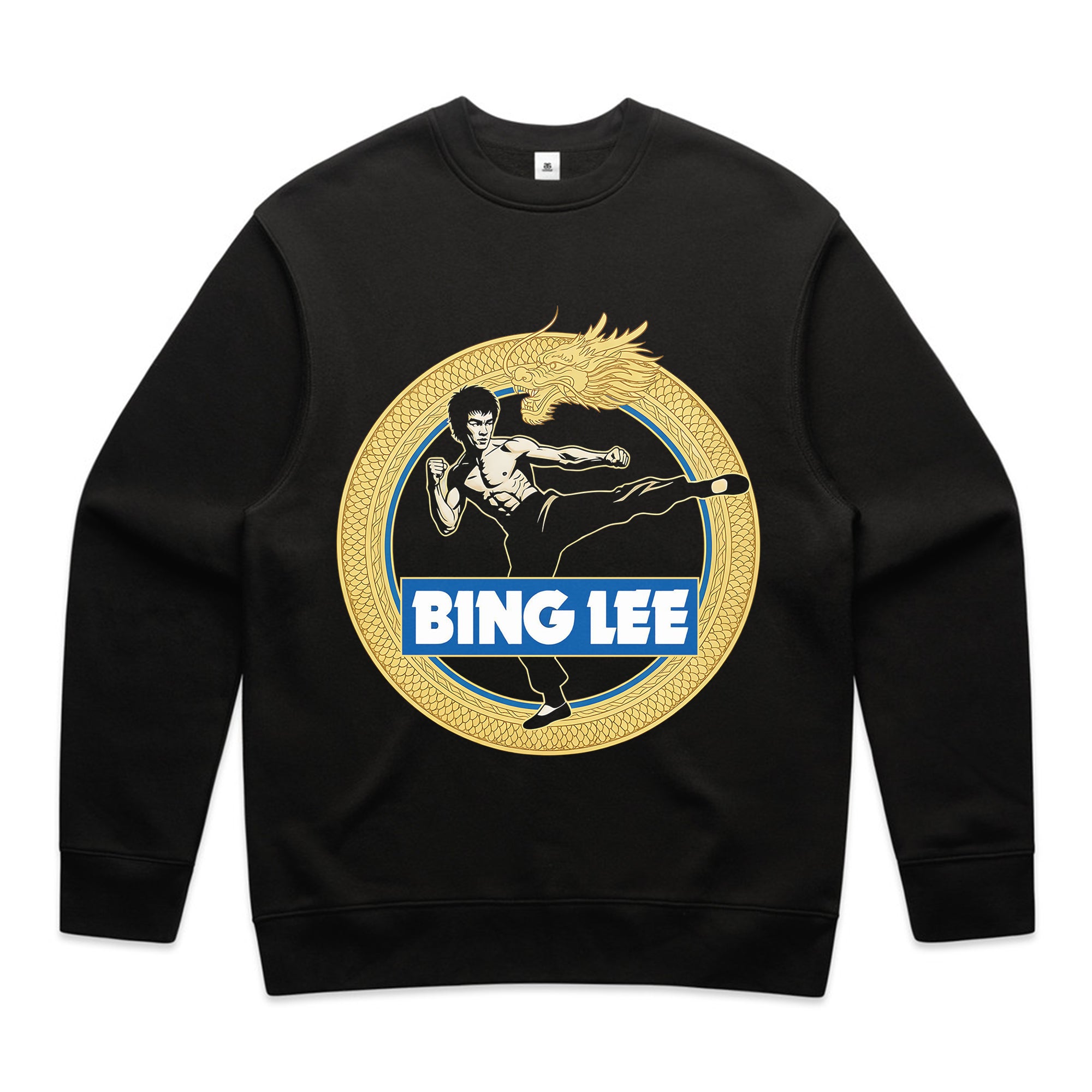 A bold black tee featuring a dynamic martial arts pose surrounded by a golden dragon emblem. The center showcases the playful text āBING LEEā in striking blue and white, giving it a humorous twist on classic action-inspired designs. Perfect for those who love pop culture mashups with attitude.