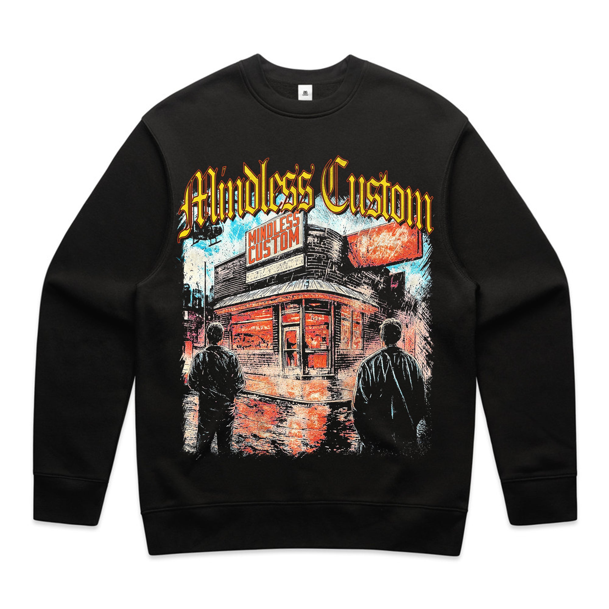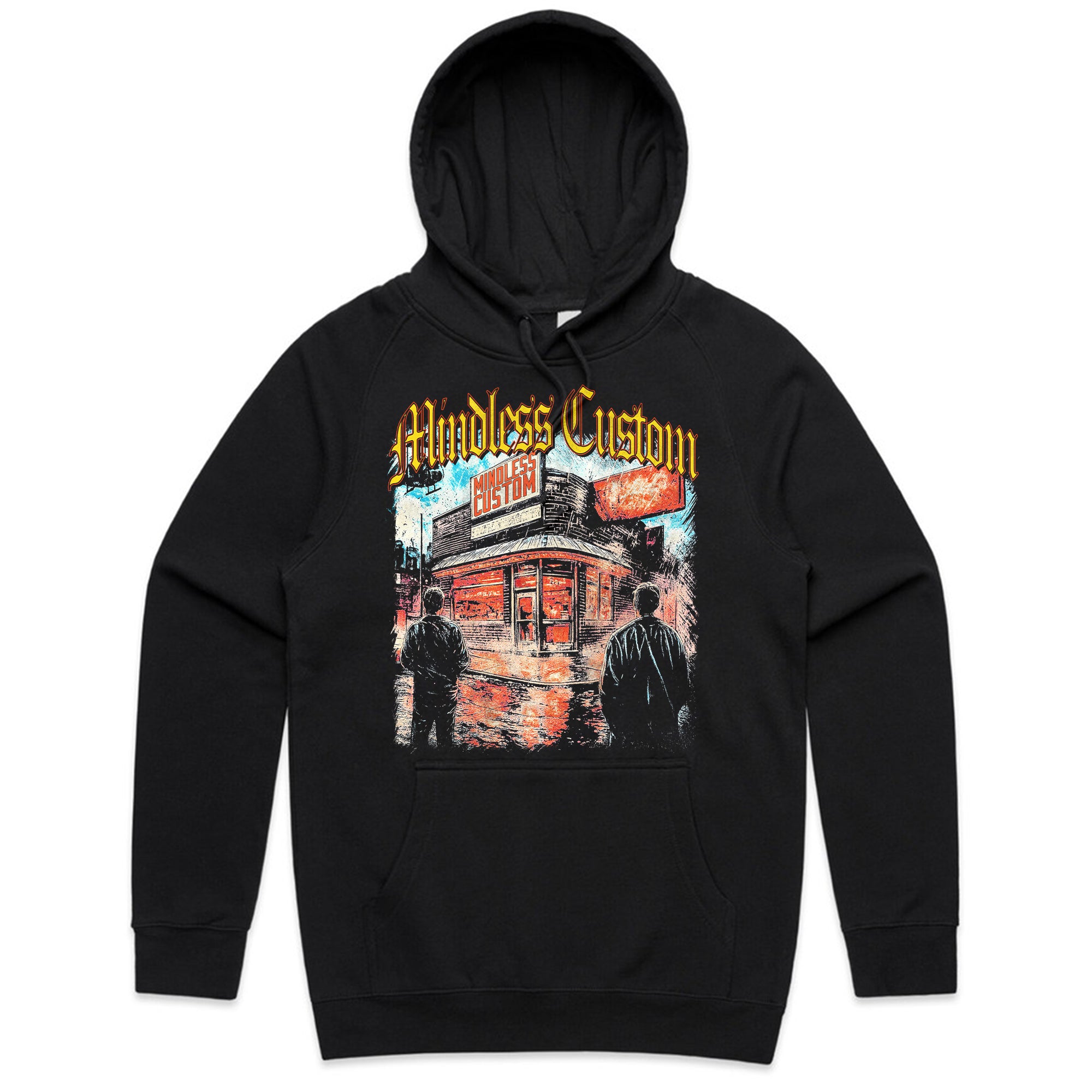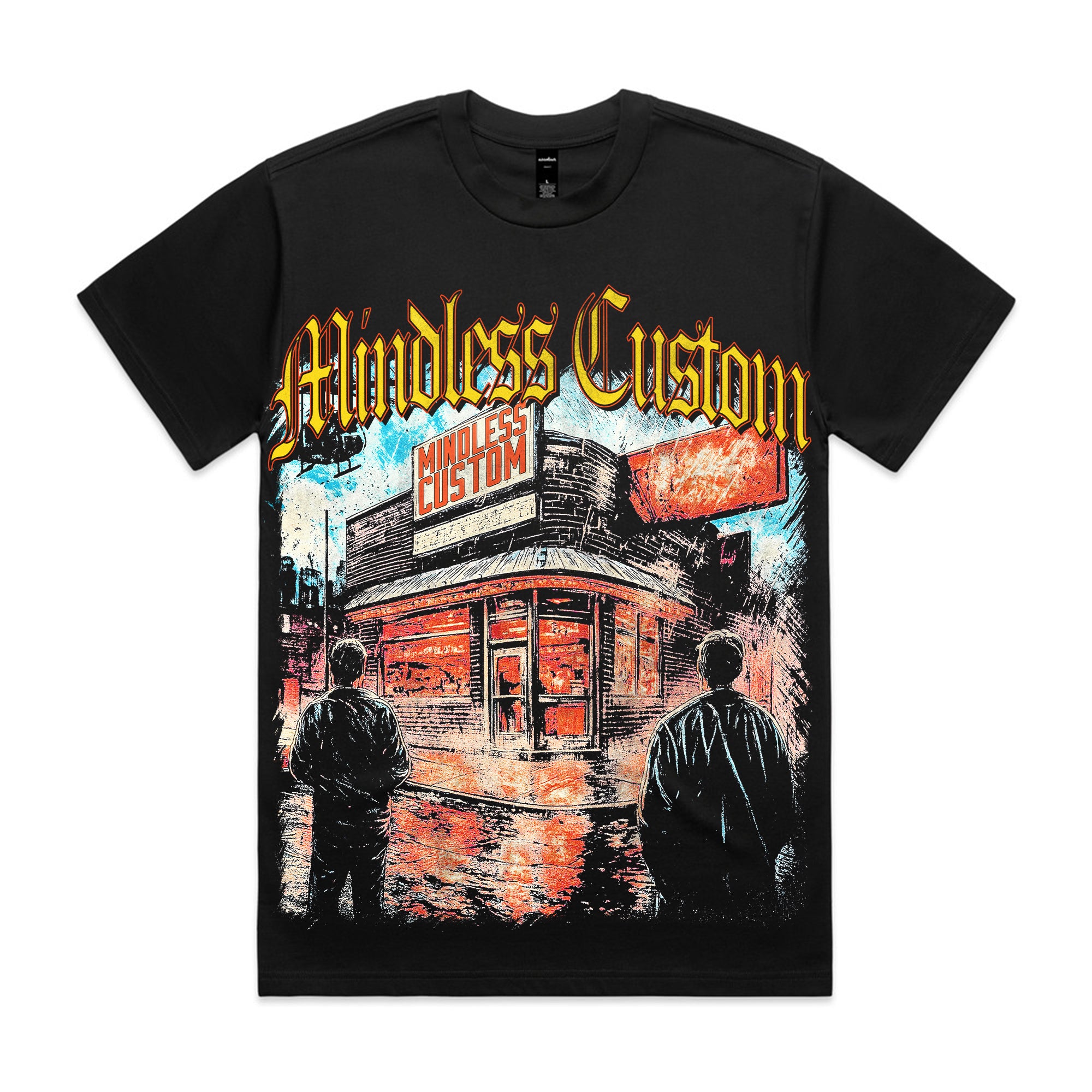 Turn the city into your stage with this electrifying streetwear piece. Featuring a neon-lit storefront glowing against the night, shadowy figures, and bold urban details, this tee radiates raw energy and underground culture. The gothic “Mindless Custom” logo in fiery yellow crowns the design, making it impossible to ignore.