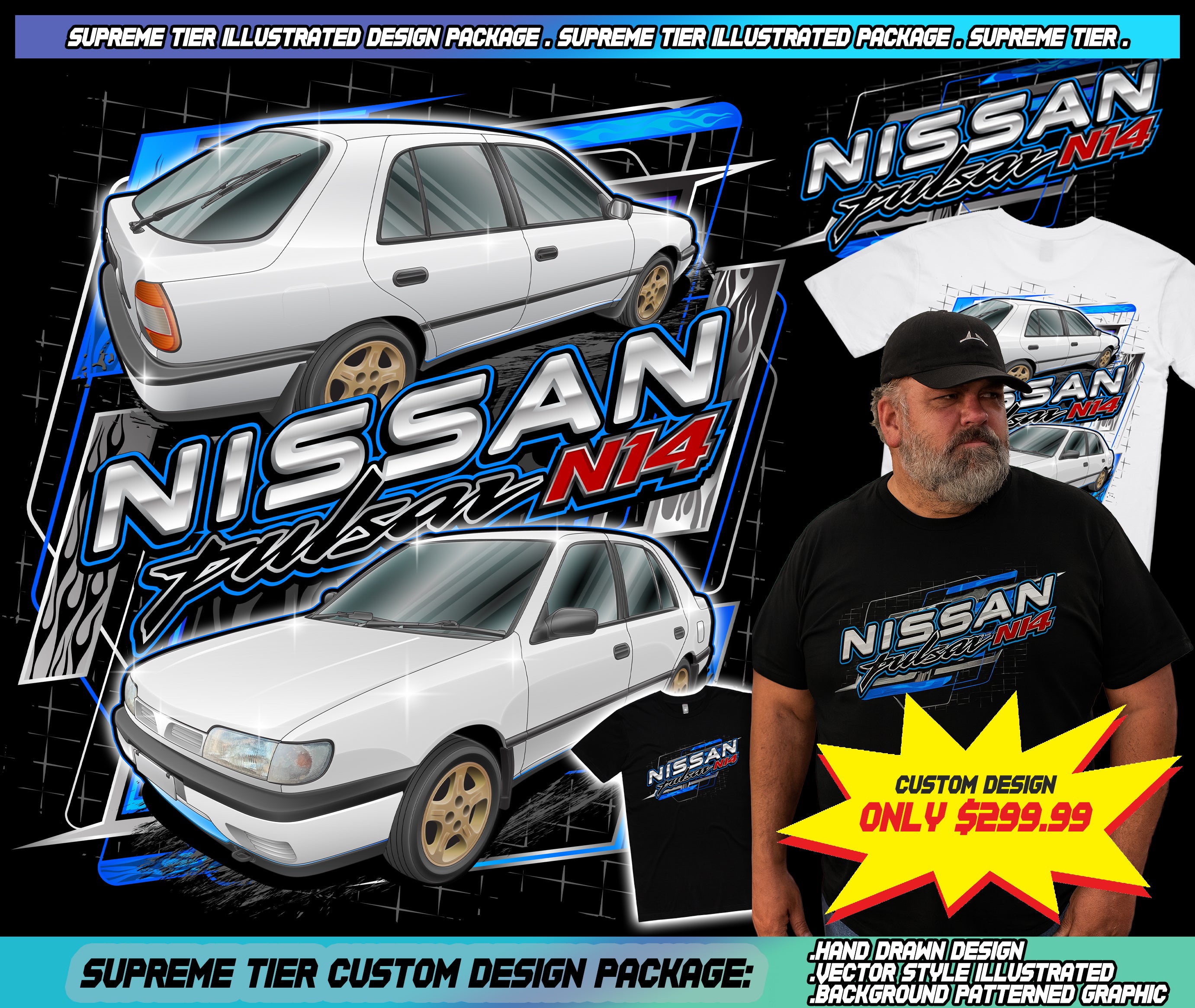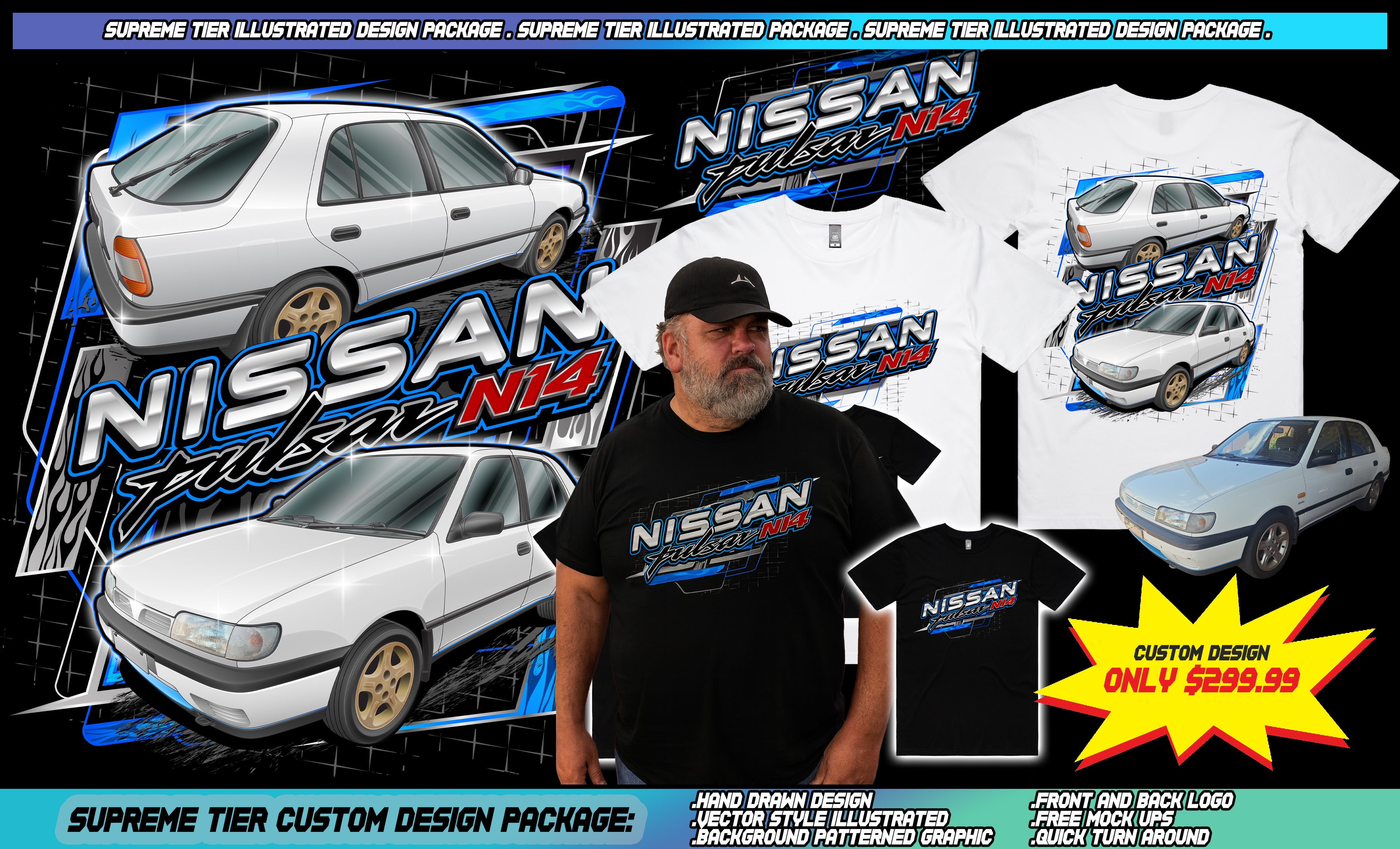 If you like the Nissan Pulsar N14 example in the banner, this is the exact package that creates that style: bold, polished, and instantly wearable.